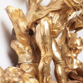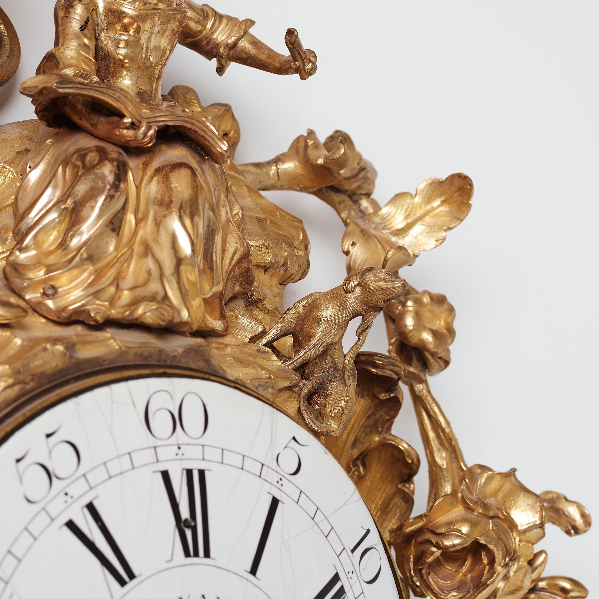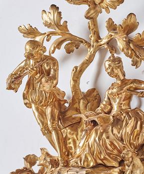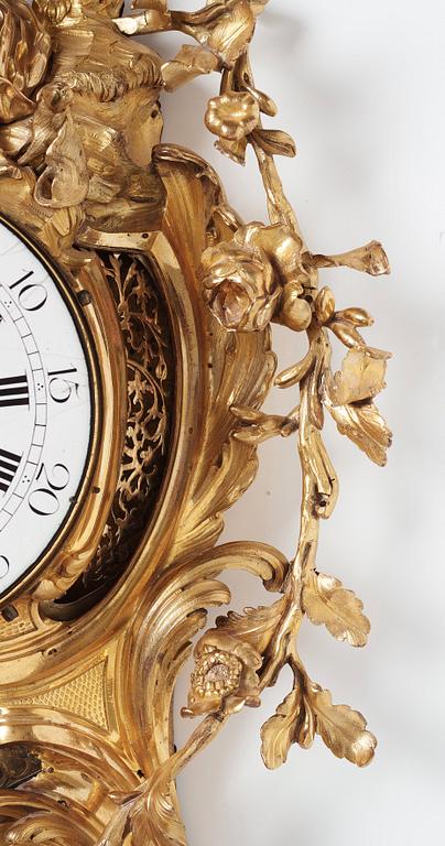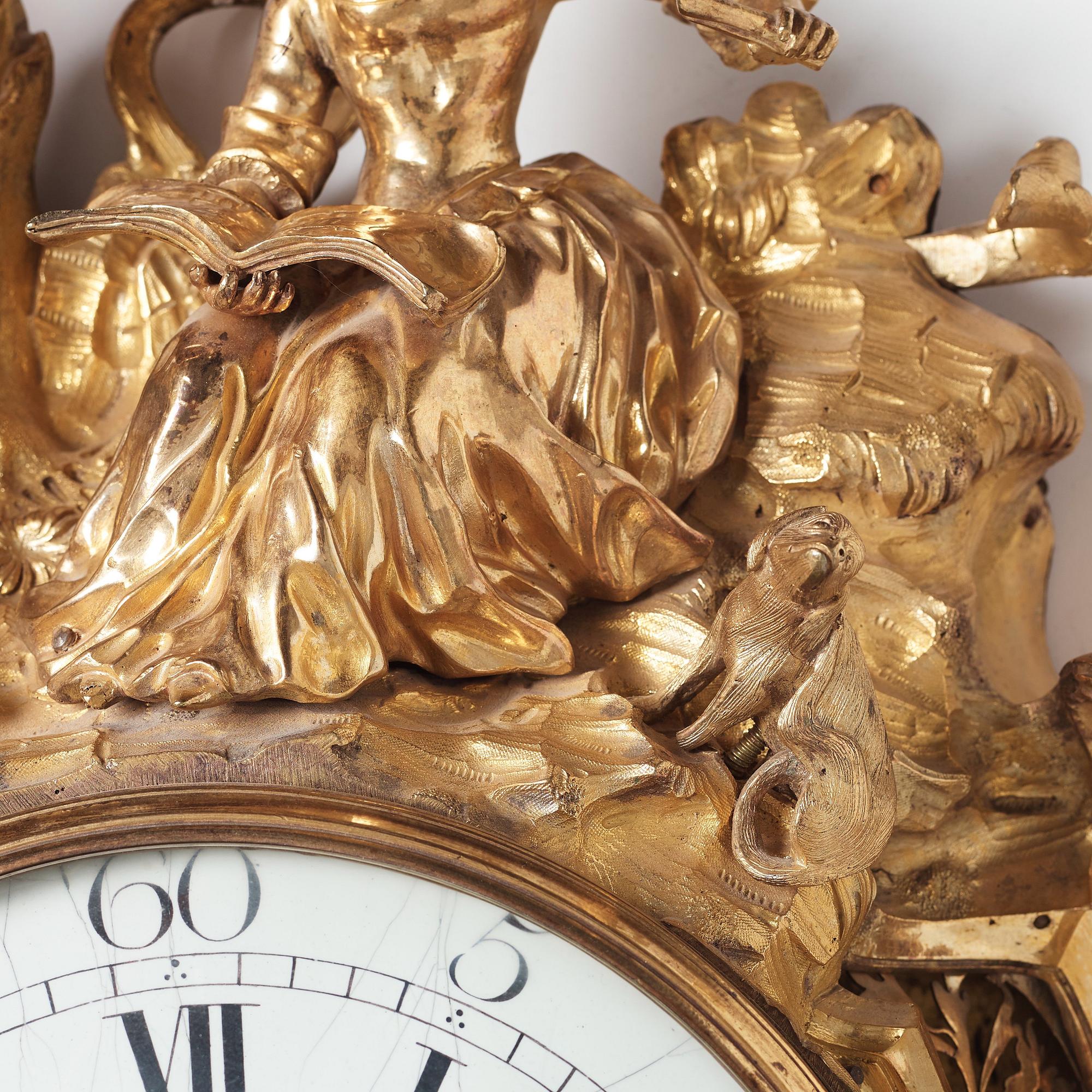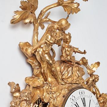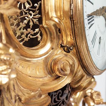 Förgylld brons. Krön med musicerande par och en hund. Rikt lövverk med blommor. Damens nothäfte med graverad text "Rosignol dans le doux" (troligen musik komponerad av Jean-Baptiste Drouart de Bousset, Frankrike 1662-1725). Vitemaljerad urtavla. Urtavla och urverk märkt "Regnauld A Chaalons". Med hel- och kvartslag på tre klangskålar. Höjd 120, bredd 55 cm. Pendel medföljer.