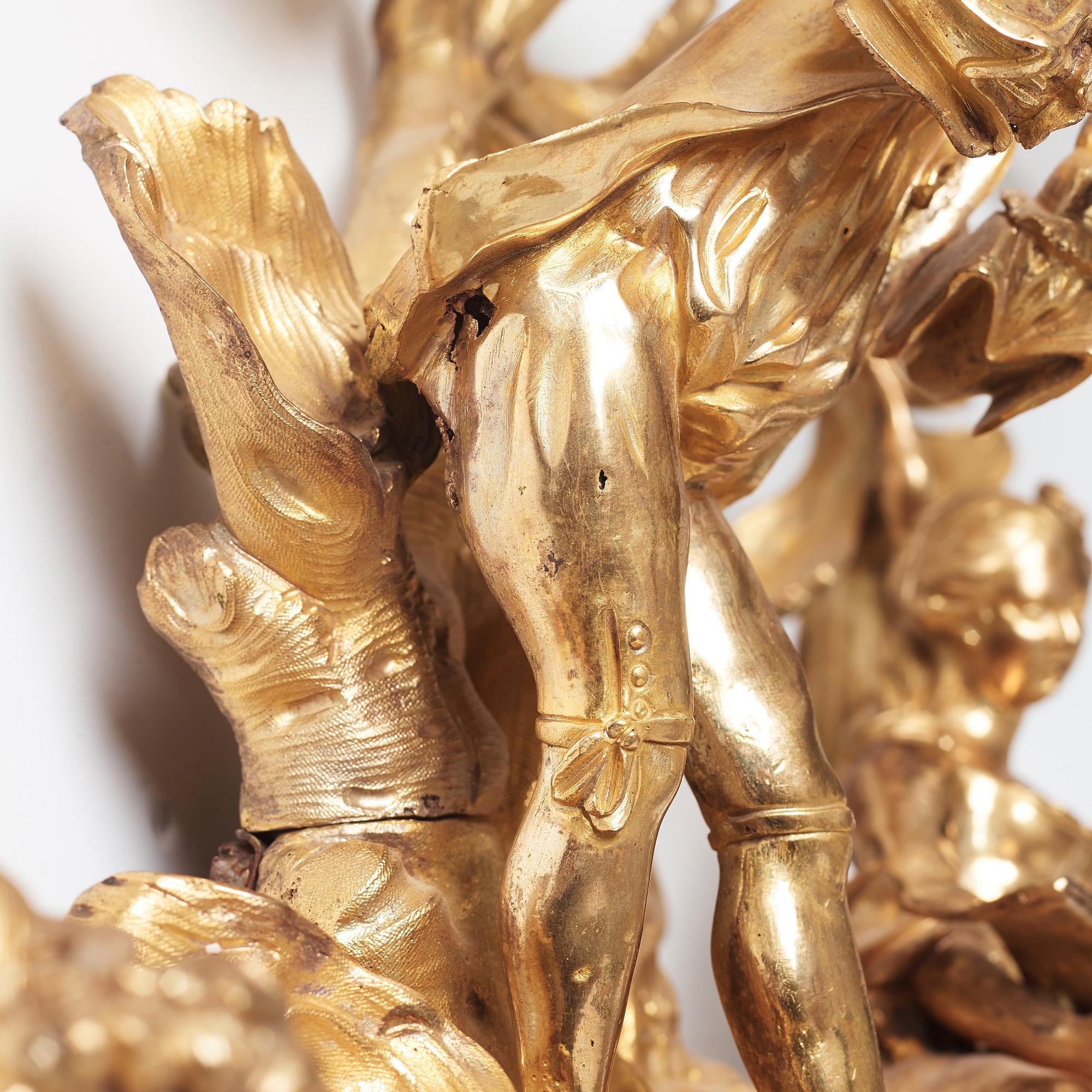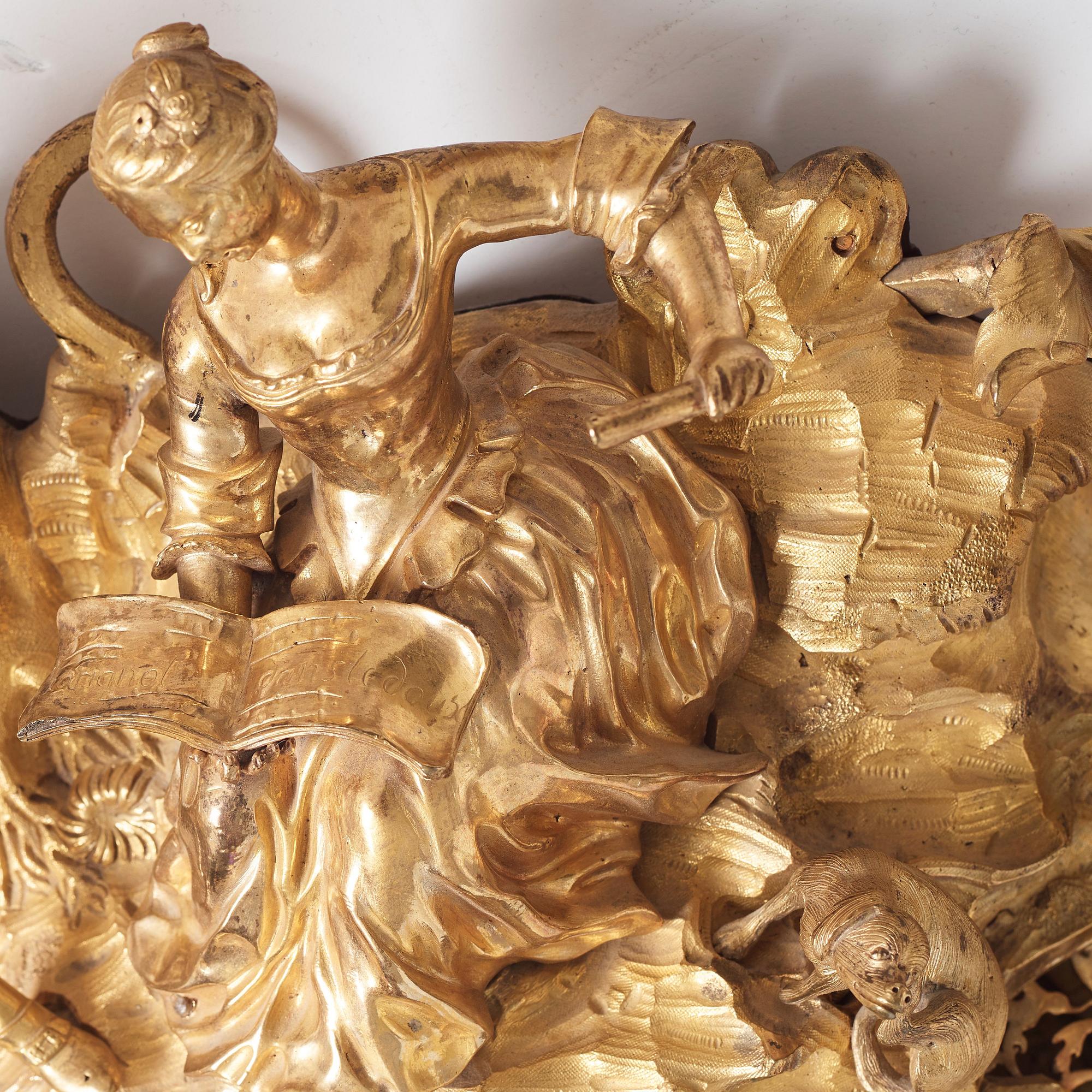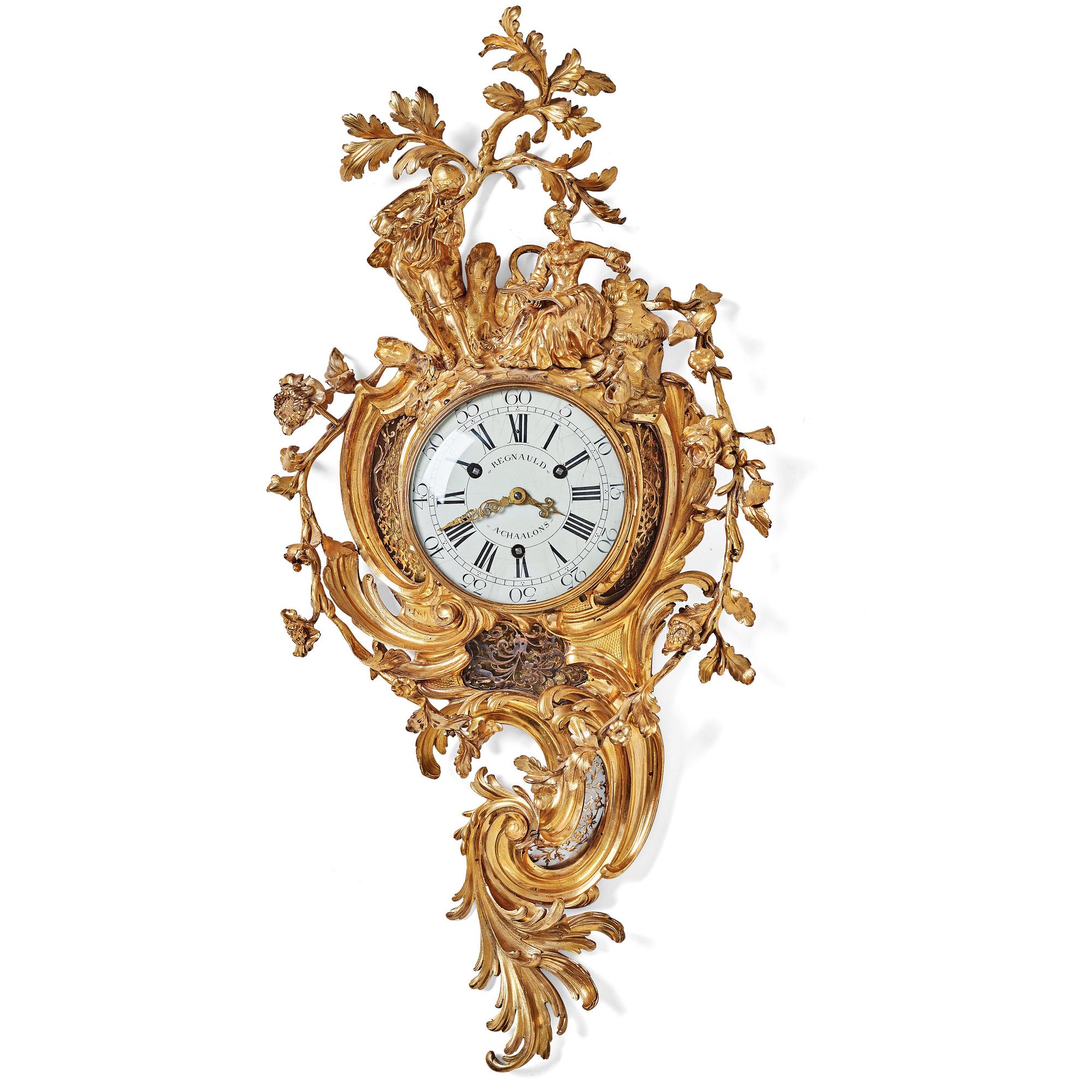 Attribueringen till Jean-Joseph de Saint-Germain (född 1719-1791), fondeur-ciseleur, bygger på dess avancerade design, lekfulla uppfinningsrikedom och högklassiga utförande och ciselering. St Germain arbetade i Paris som ouvrier libre från 1742 och blev mästare 1748. Han var en av rokokotidens främsta formgivare och hade studerat både botanik och djur, vilka han ofta tog med i dekoren till urfodral. Katalognumrets hund, som kliar sig om örat, är en lekfull detalj som kännetecknar Saint-Germains konstnärliga kreativitet.