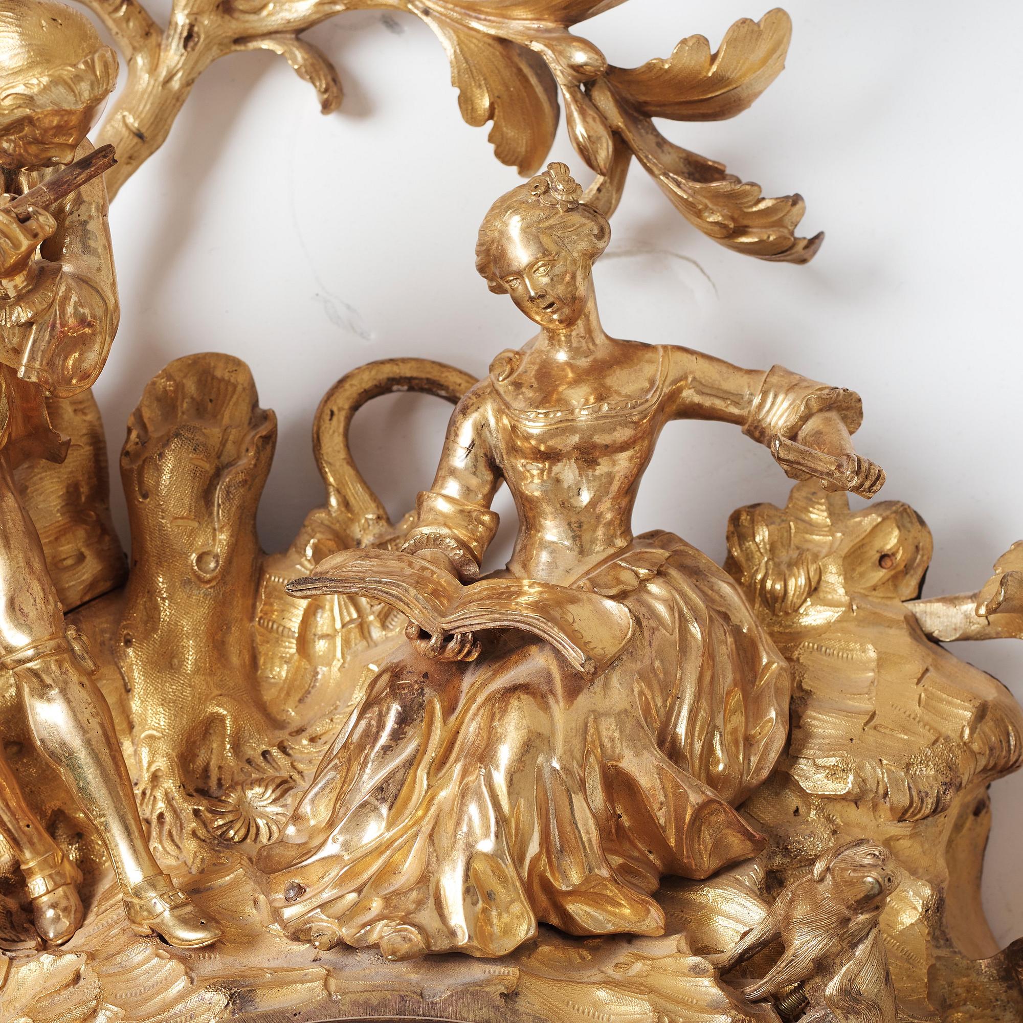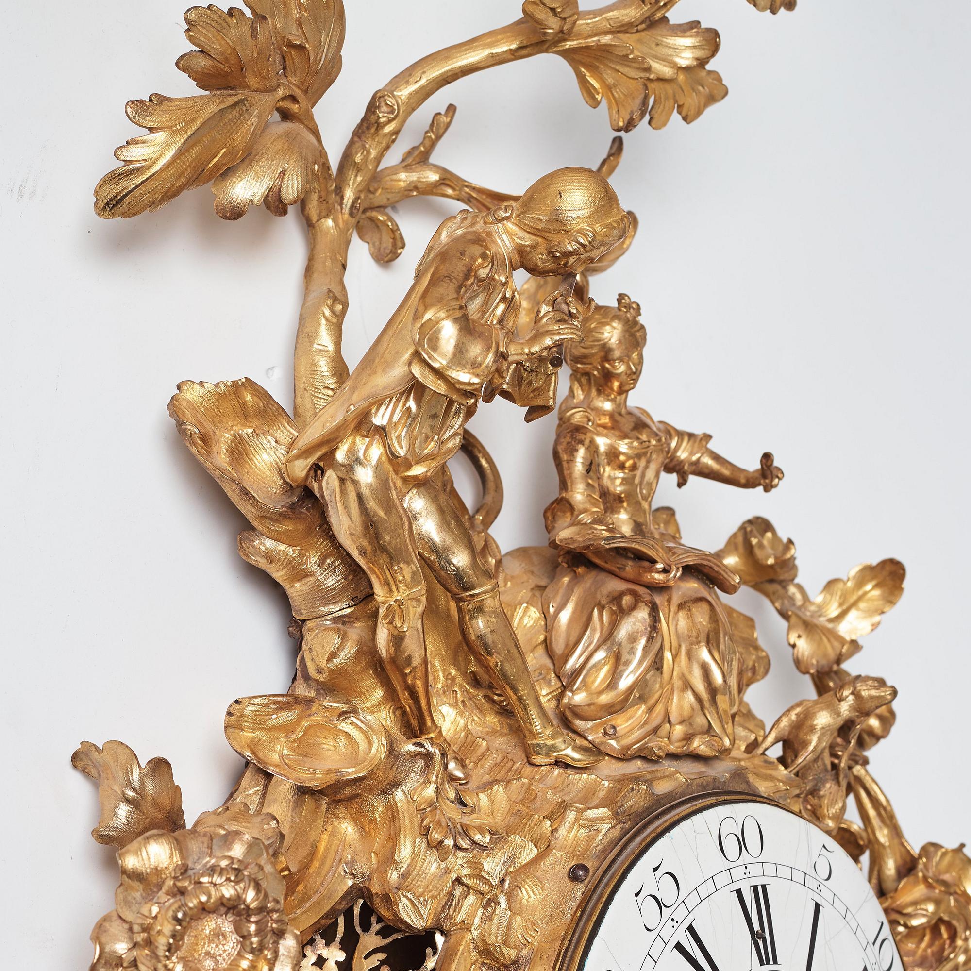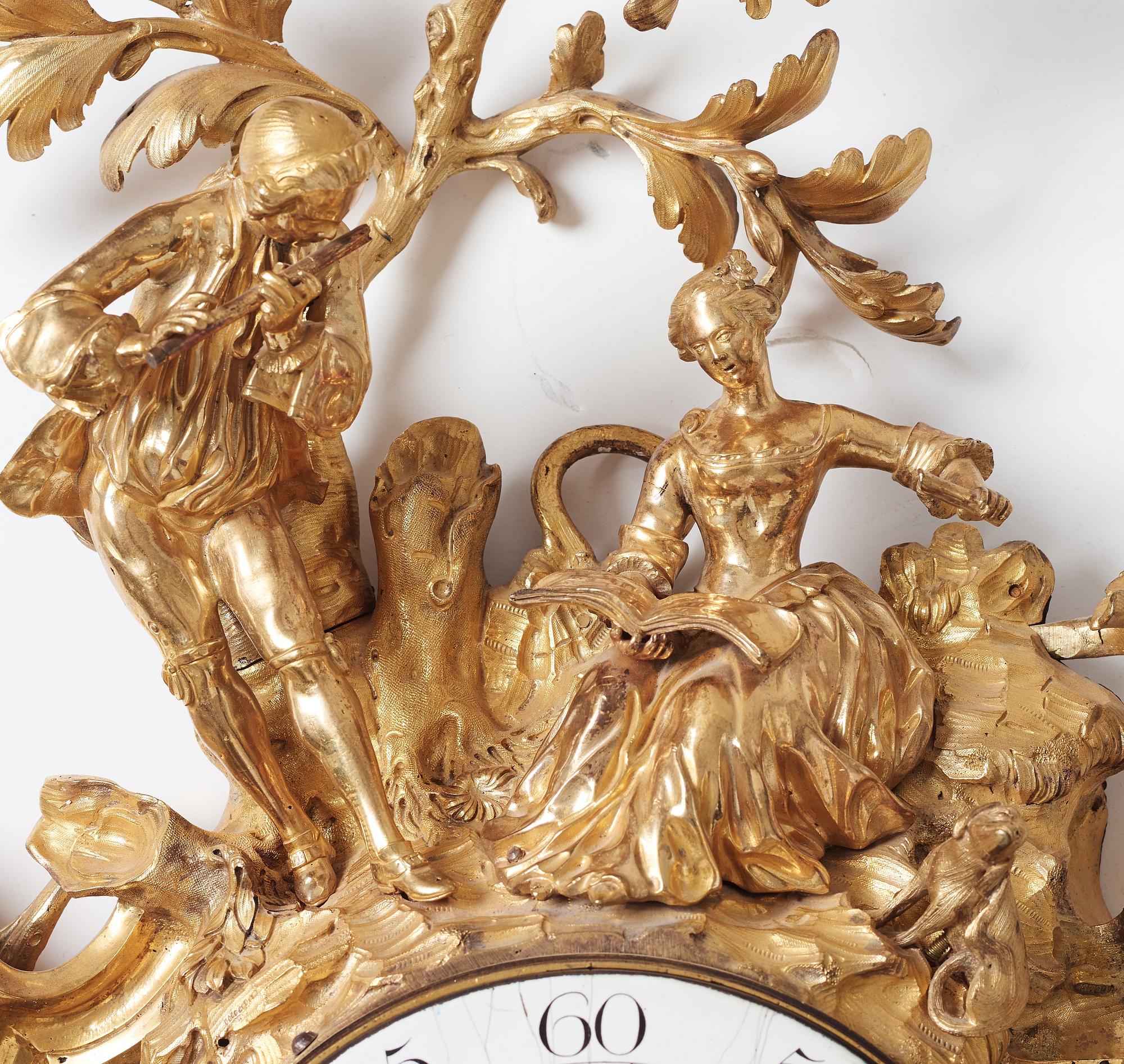 Auktionens väggpendyl består av förgylld brons vilket var ett mycket dyrbart material. Räkningar från 1700-talet av konsthantverksföremål och möbler visar att metallen utgjorde lejonparten av kostnaden. Tillverkningen av dyra föremål krävde en bestämd beställare eller mellanhand som kunde finansiera framställningen. Med tanke på katalognumrets musicerande par och romantiska motiv var den sannolikt beställd till fruns våning, som under 1700-talet oftast var den mest påkostade delen av huset. Under rokokotiden blev kvinnornas sällskapsrum den viktigaste sociala arenan för båda könen.