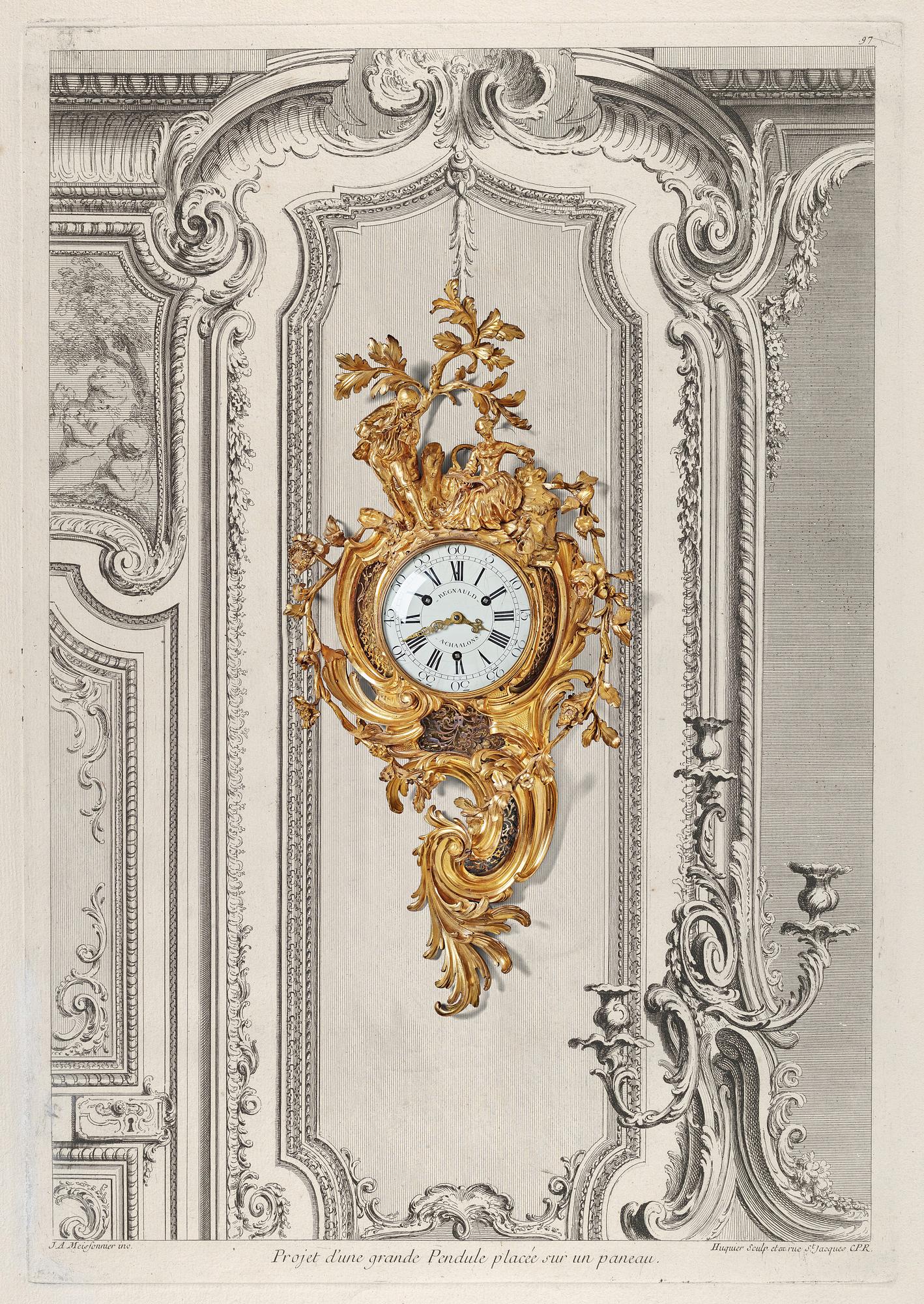 Juste-Aurèle Meissonnier (1695-1750), engraving, "Projet d'une grande Pendule placée sur un paneau".