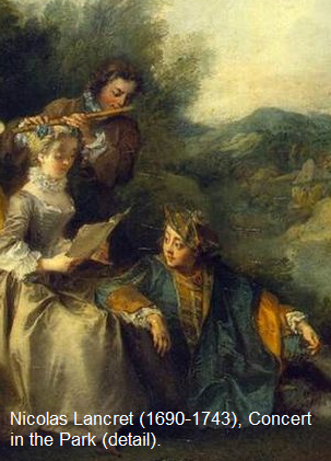 Inom konsten skildrade Watteau, Lancret och Boucher idylliserande land- och parklandskap med amorösa figurscener, s.k. fête galante. Katalognumret bär på krönet ett musicerande par, varav kvinnan håller ett nothäfte med den graverade texten "Rosignol dans le doux" (Näktergalen i det söta). Troligen härrör citatet från ett musikstycke av Jean-Baptiste Drouart de Bousset (Frankrike 1662-1725). Hunden som håller paret sällskap symboliserar trofasthet. Den kliar sig förstrött på örat vilket är en typisk yttring för rokokons sorgfria och eleganta nonchalans.