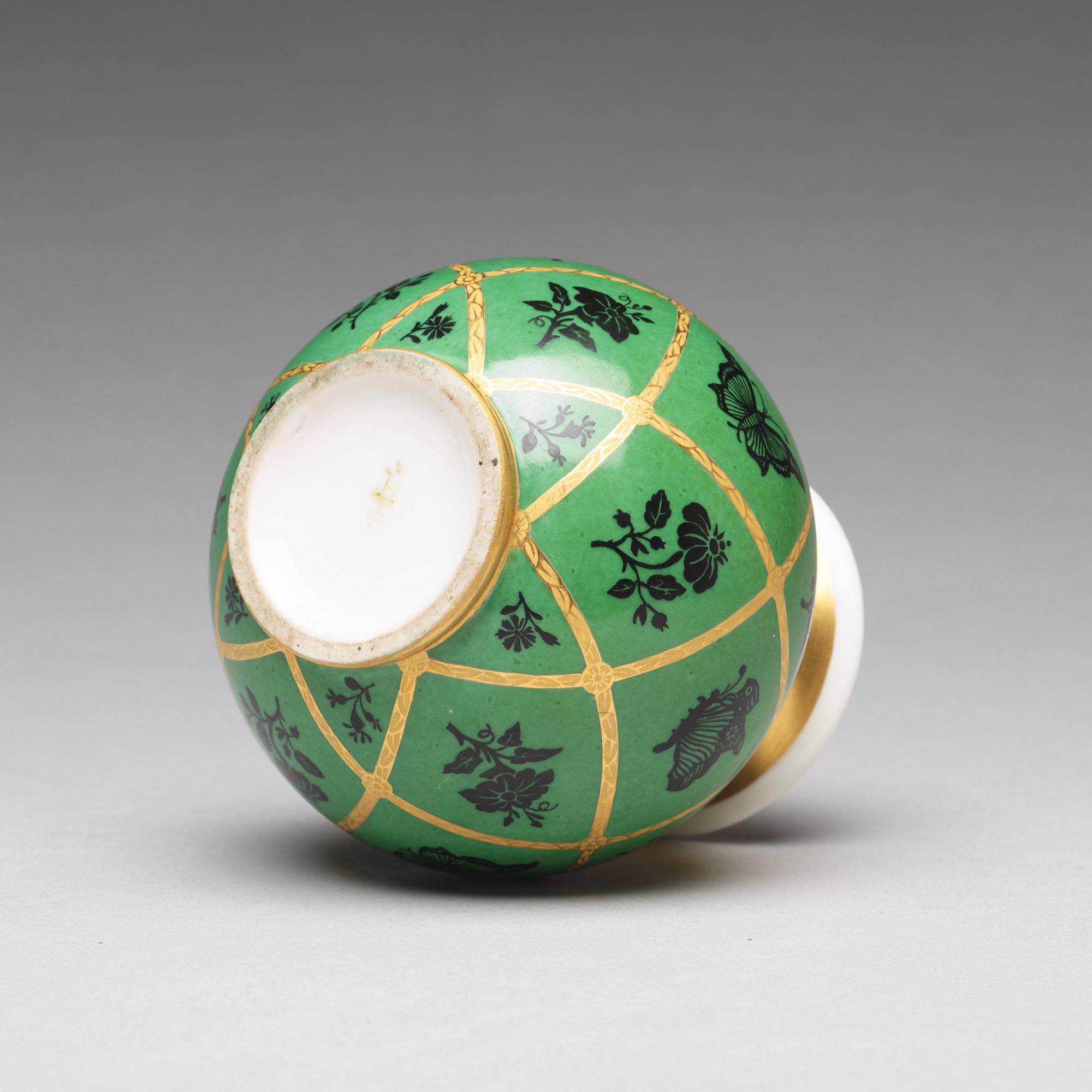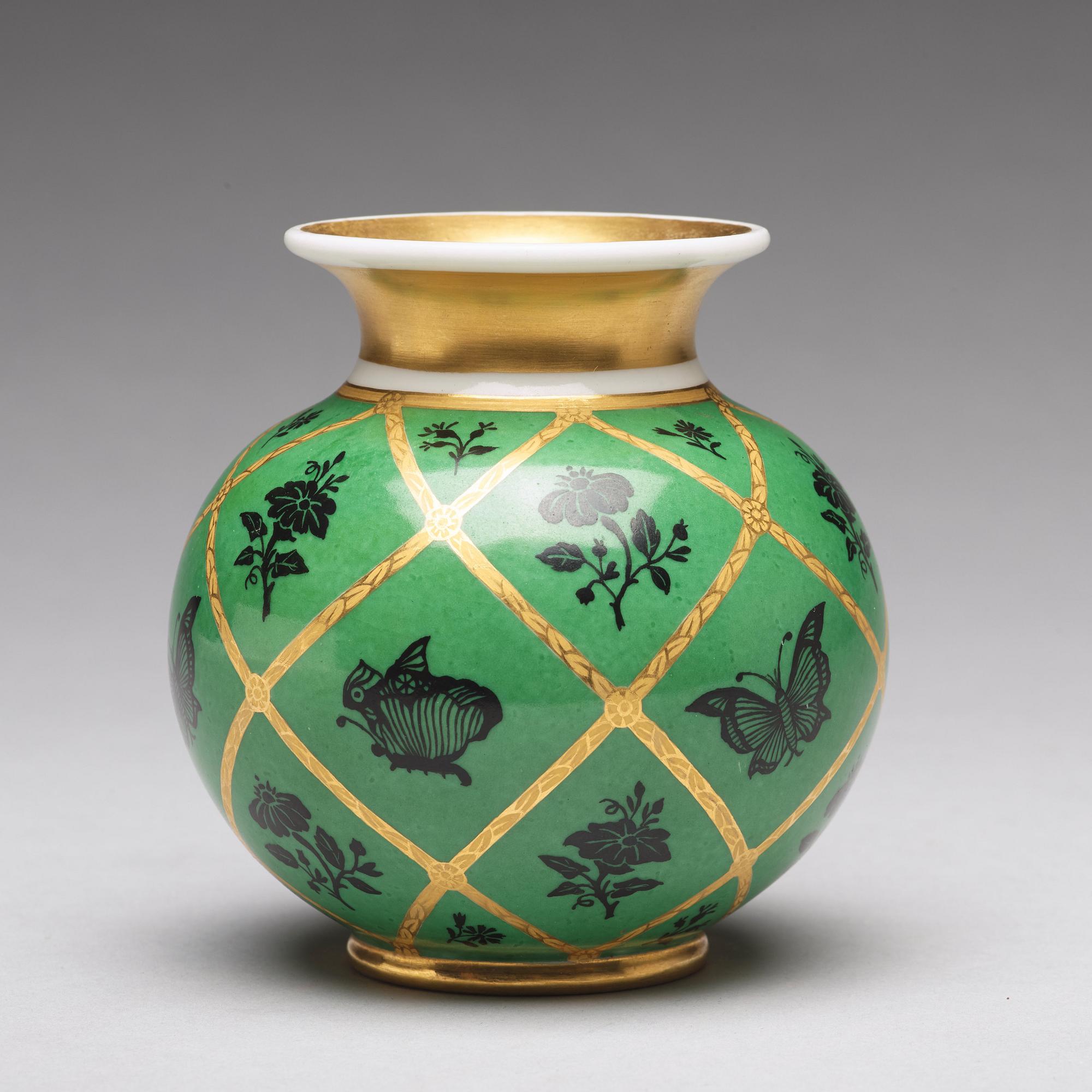 Klotformad med uppsvängd mynning, målad, förgylld och ciselerad dekor av blommor mot grön fond. Höjd 10,5 cm.