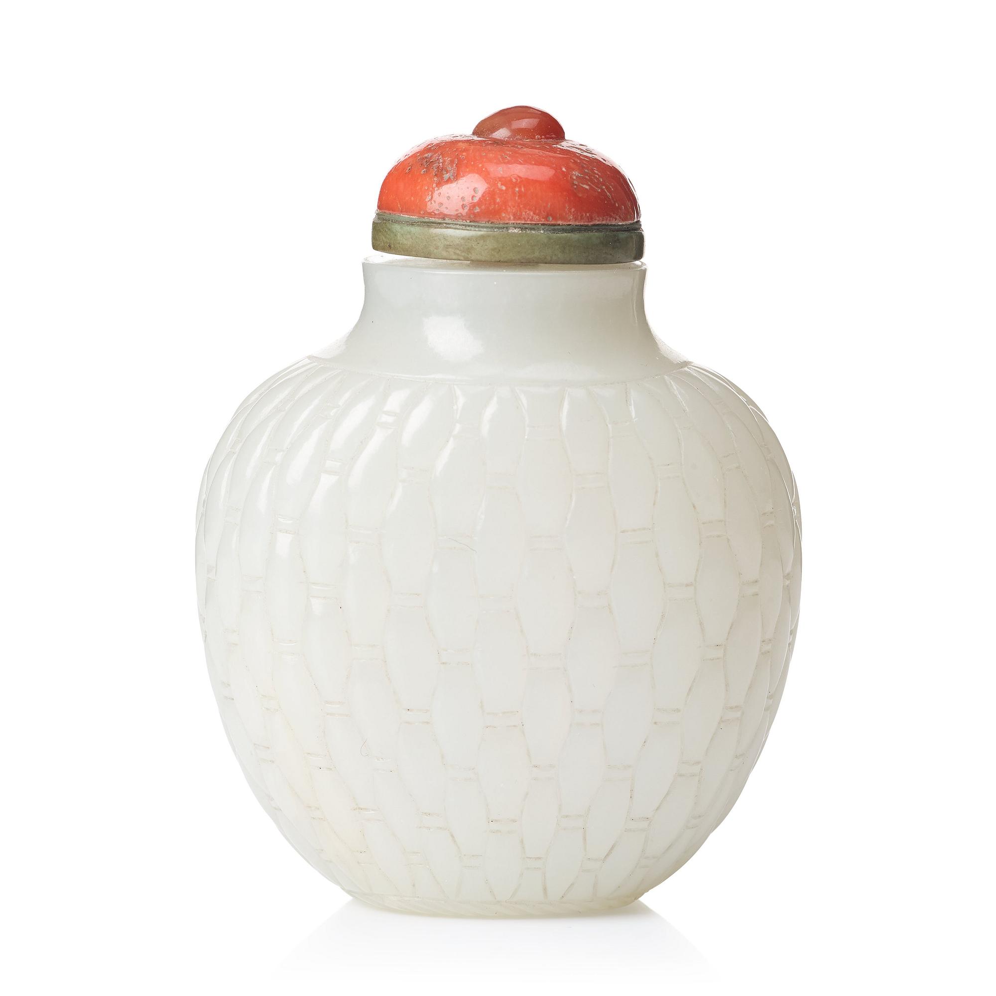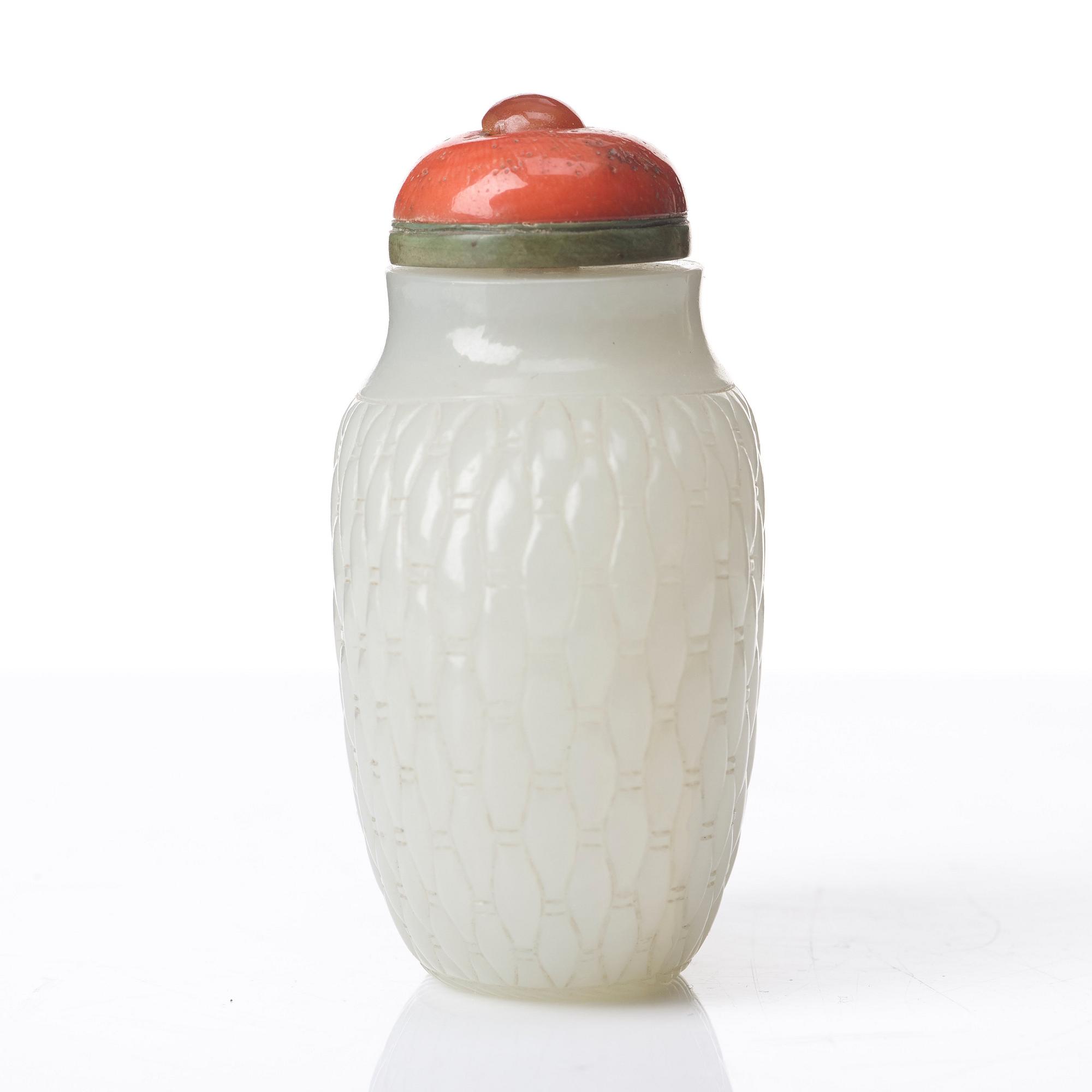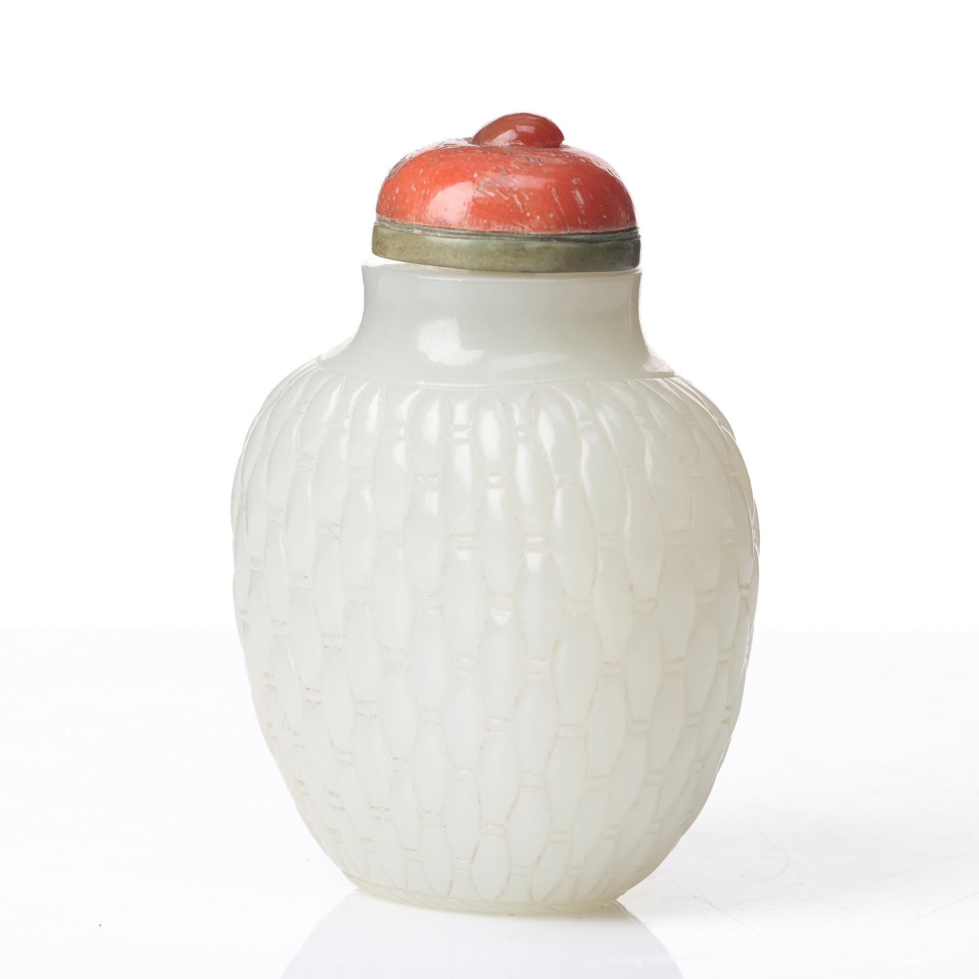 Rund, platt form med uppdragen hals, skuren dekor av korgflätning/bambu. Höjd 6,5 cm.