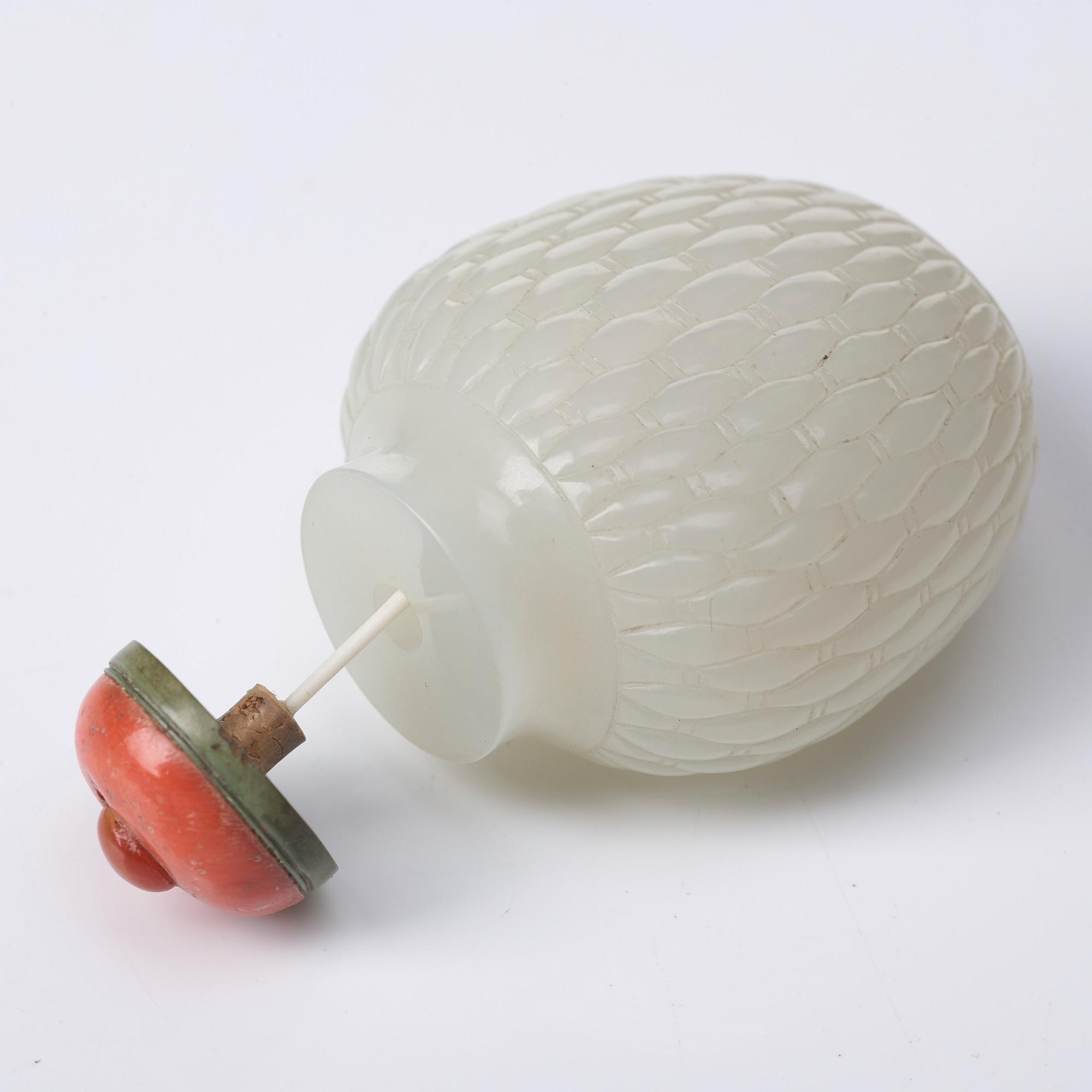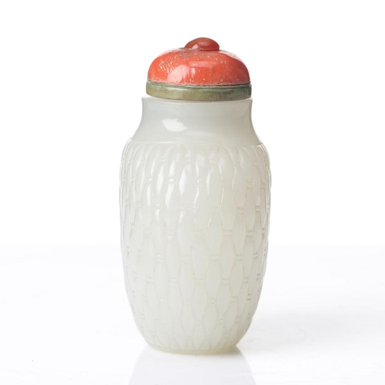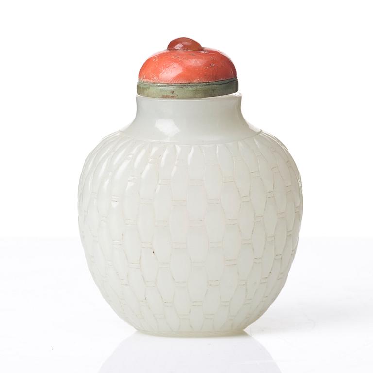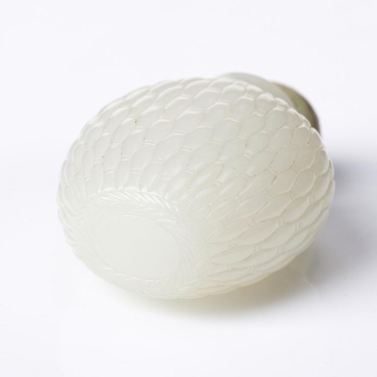Rund, platt form med uppdragen hals, skuren dekor av korgflätning/bambu. Höjd 6,5 cm.