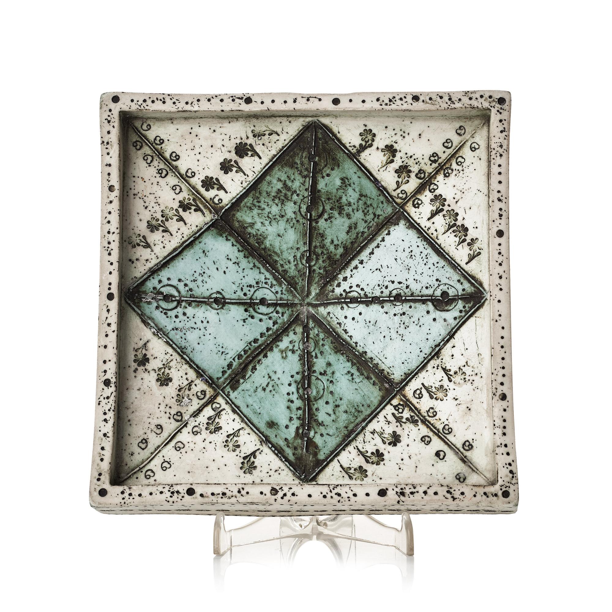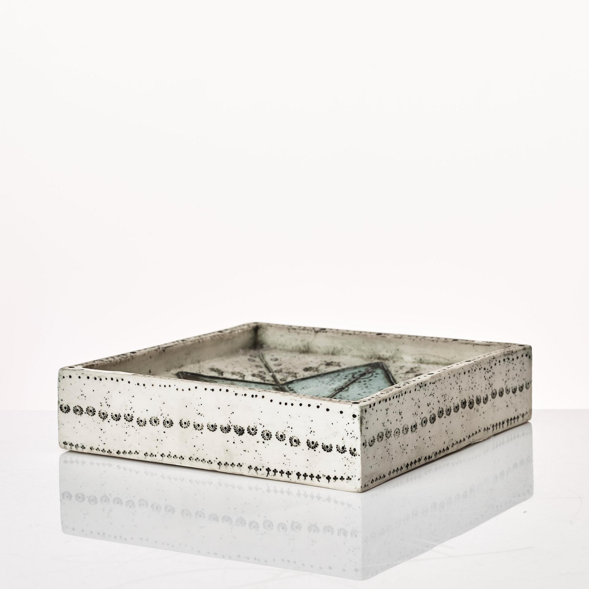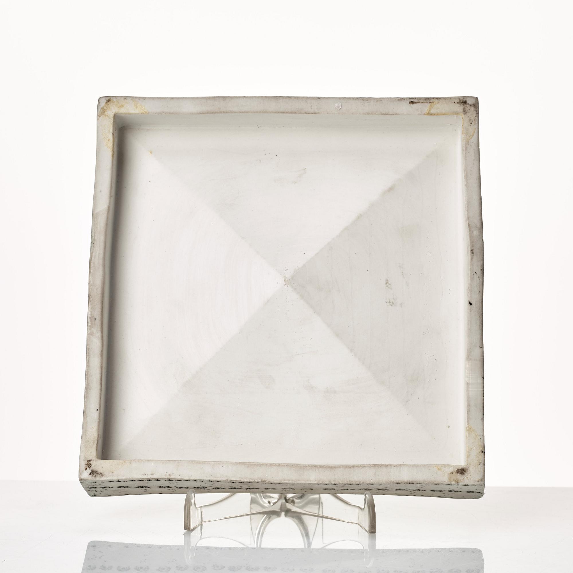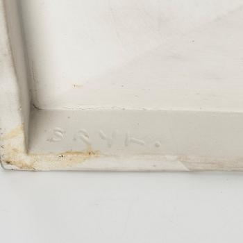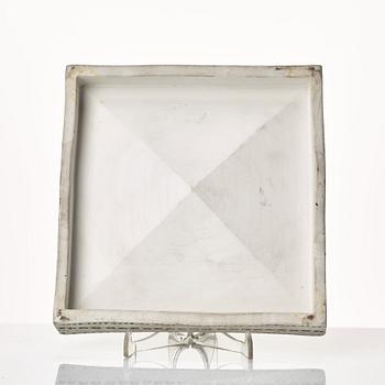 Vit biskvi, kvadratisk med inpressad reliefdekor i svart och gråblått, 16,7 x 16,7 cm, höjd 4 cm.