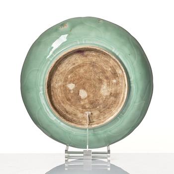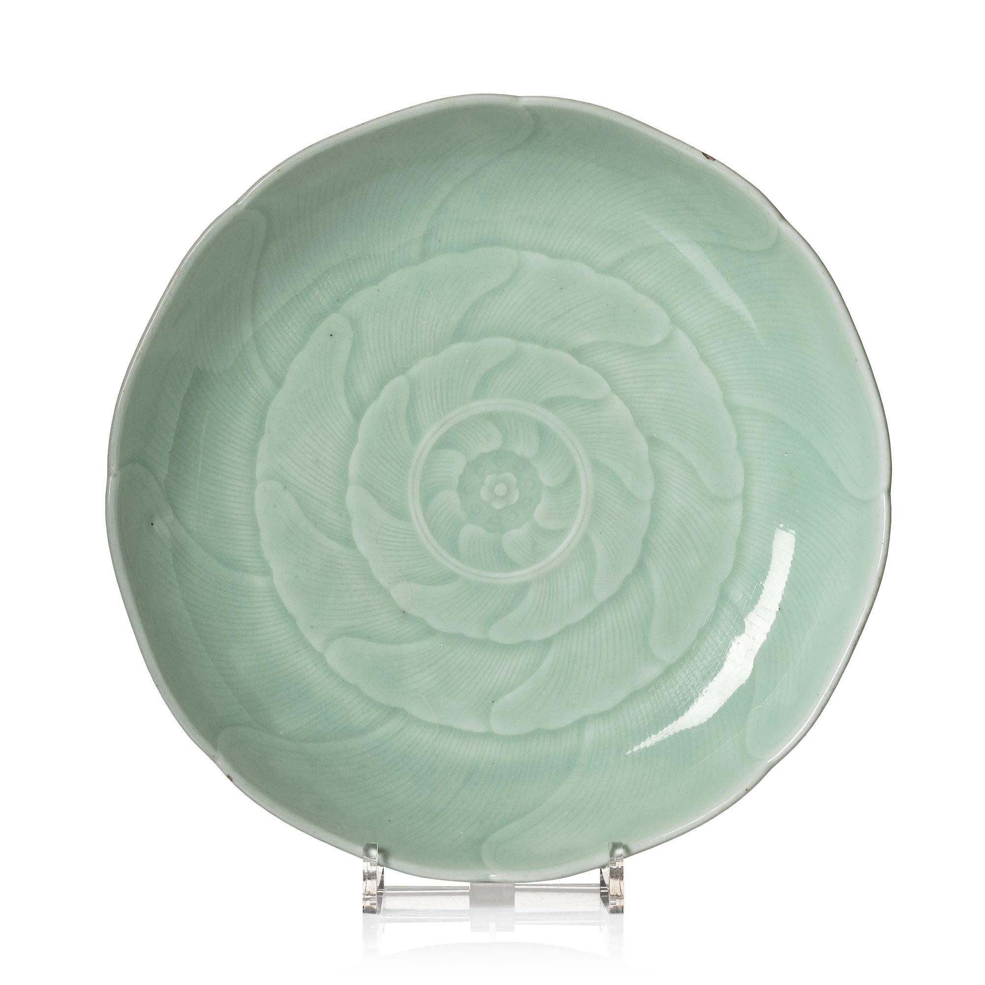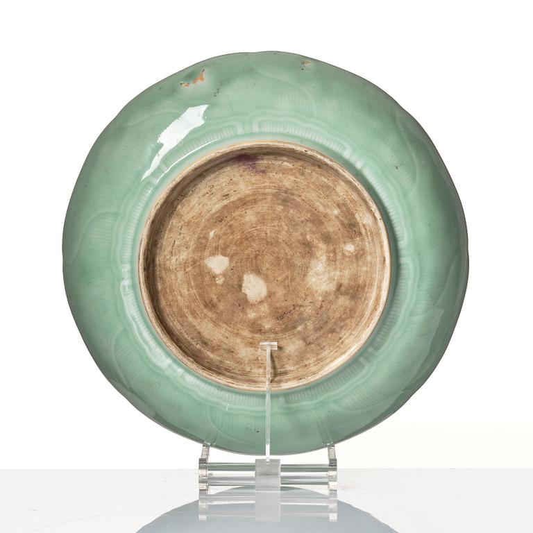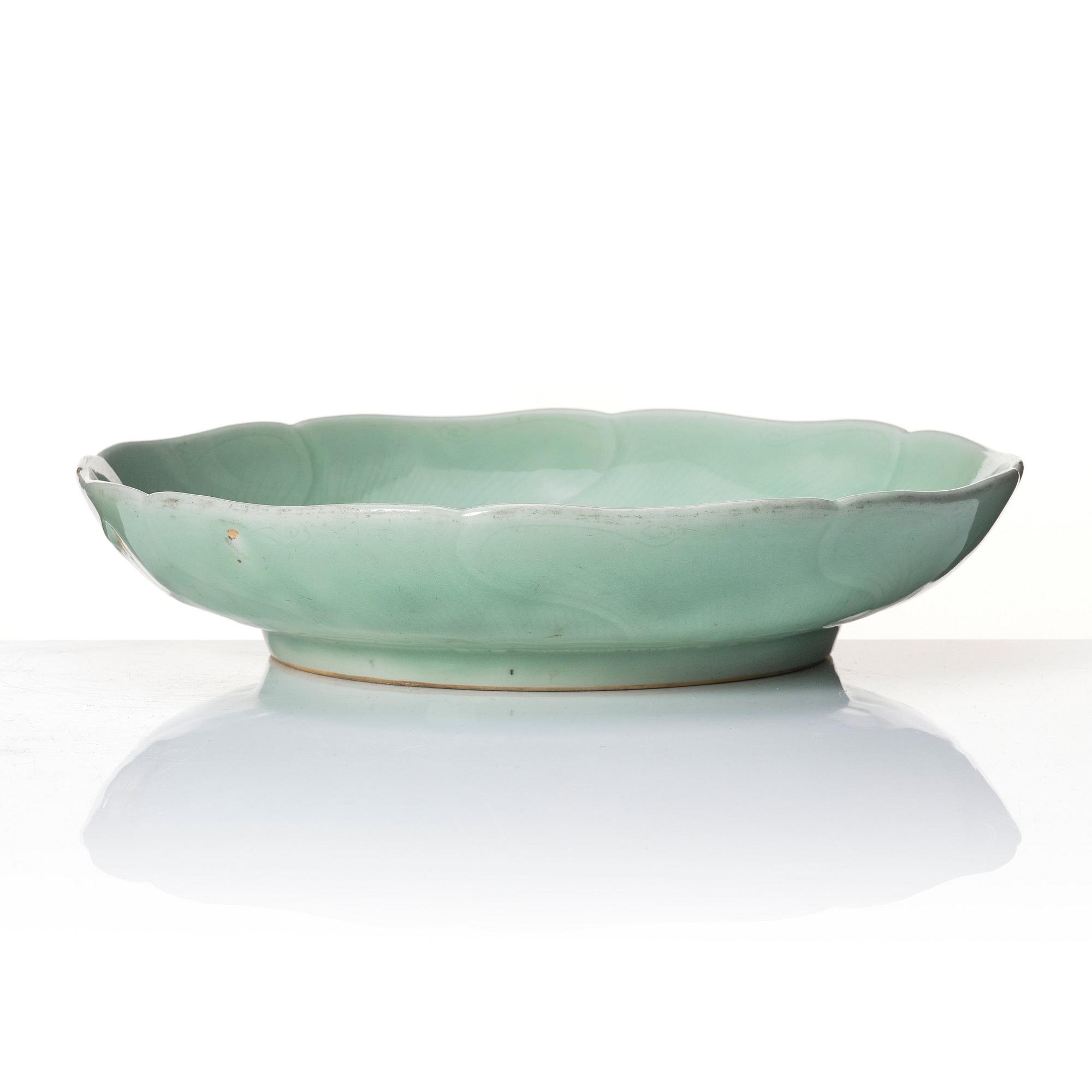 Konturerat, lotusformat med dekor i celadongrön glasyr. Diameter 33,5 cm.