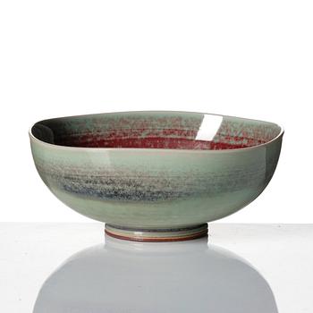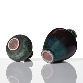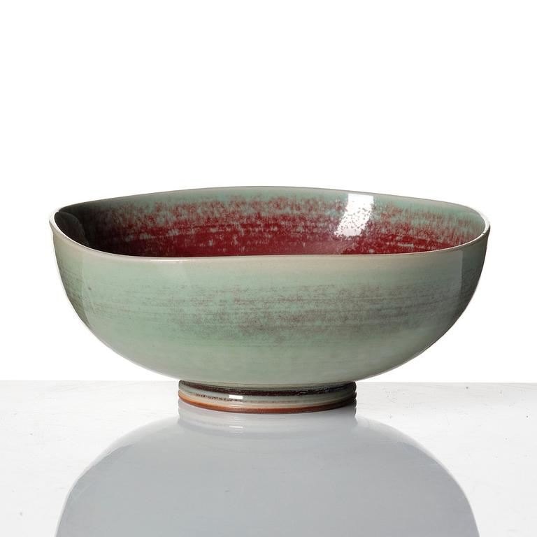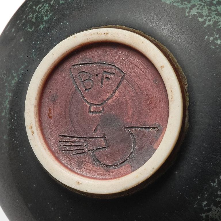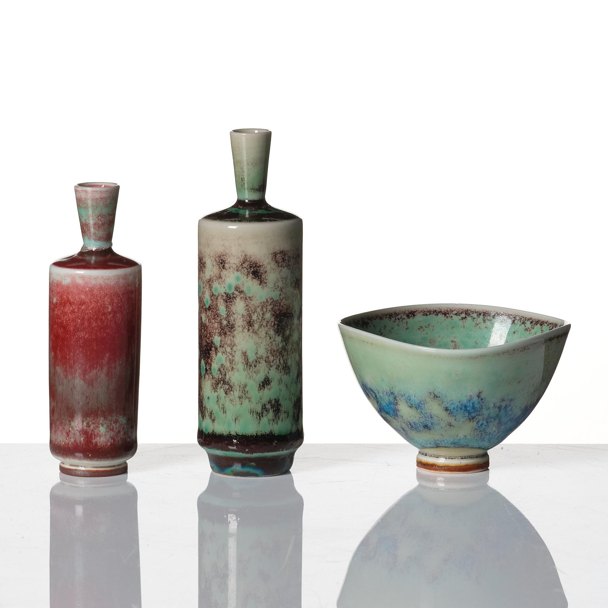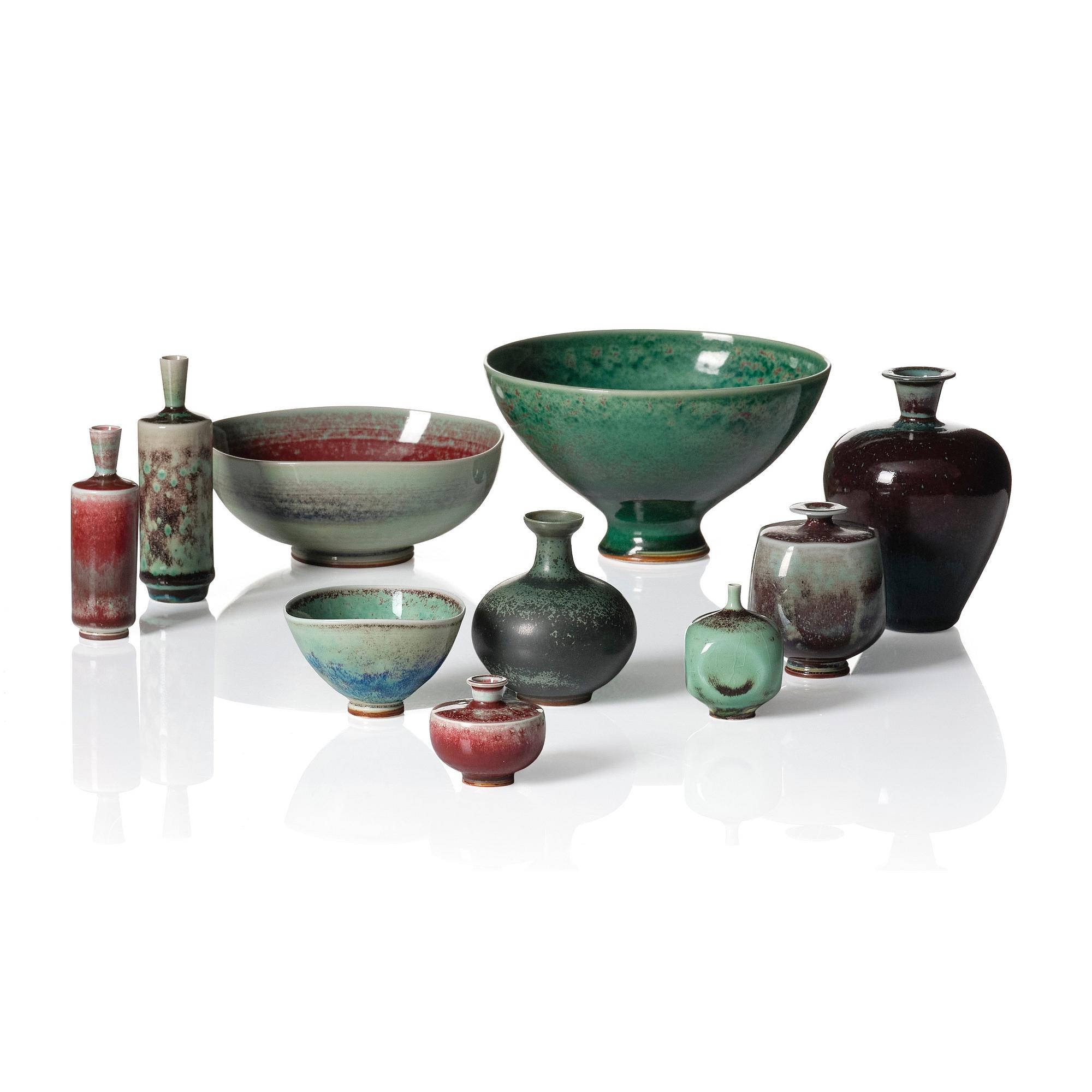 Stengods, en med grön spräcklig glasyr, övriga med blank glasyr i oxblod och grönt, signerade Friberg med studiohanden B.F. (1944-47) och olika årsbokstäver (1960-70-tal), höjd 4-11 cm, skålarnas diameter 7,2-15,5 cm, höjd 4,3-8,7 cm.