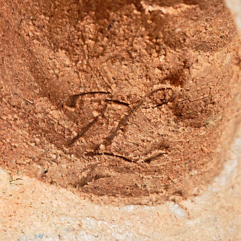 Stengods, delvis glaserad, signerad undertill TL och daterad 20.6.55, foten även signerad på ovansidan TL 55. Höjd ca 29 cm, längd ca 55 cm.