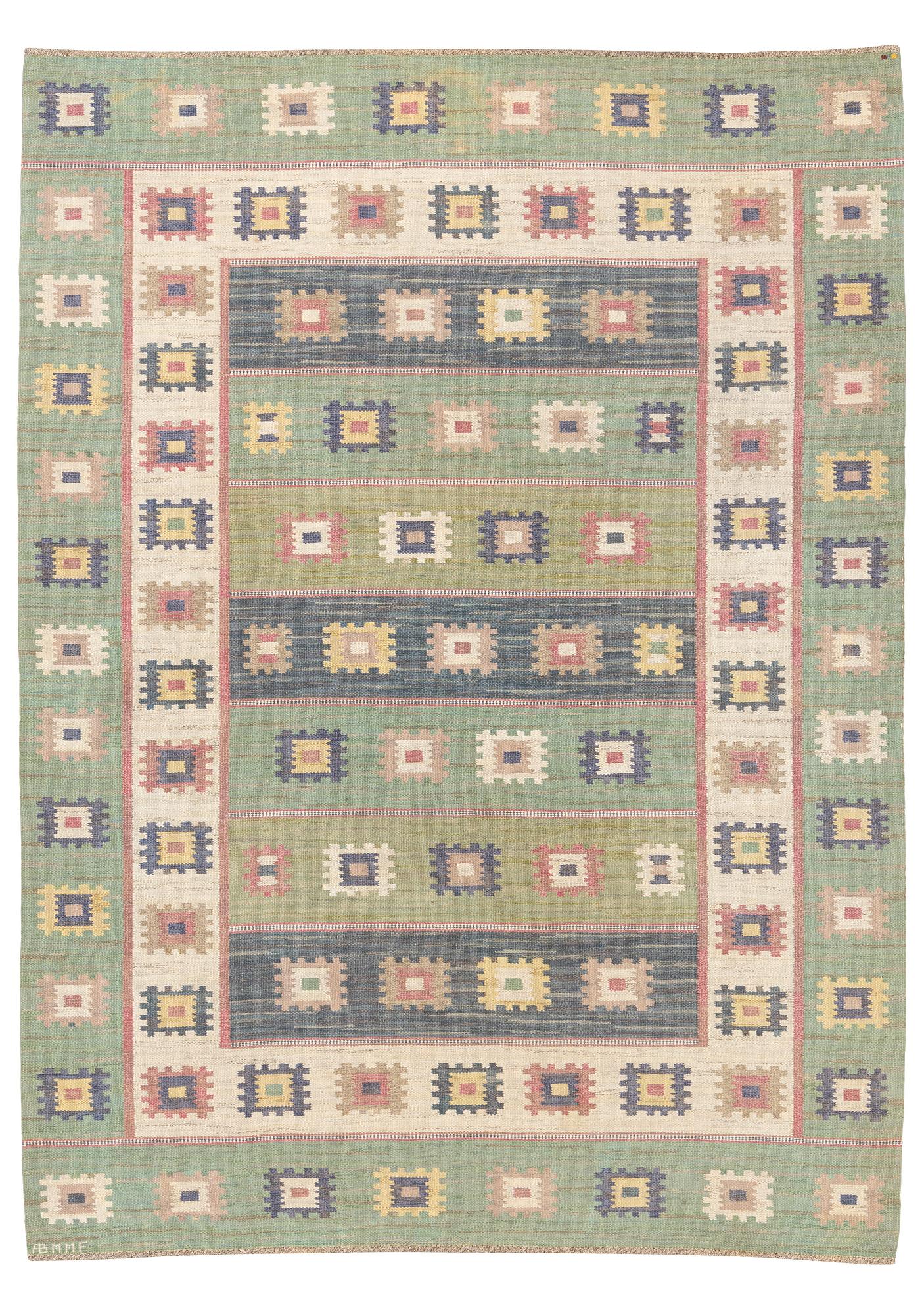 (AB Märta Måås-Fjetterström.) Komponerad 1928, tillverkad efter 1941. (Ovanlig variant med den vita bården.)