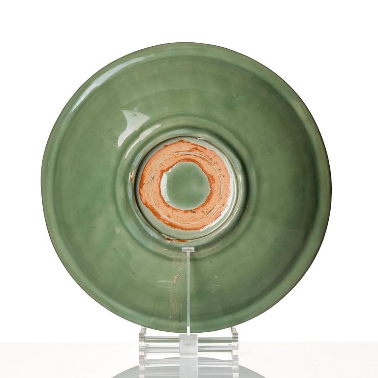 Celadonfärgad glasyr. Diameter 33 cm, Höjd 7,5 cm.
