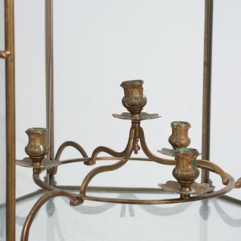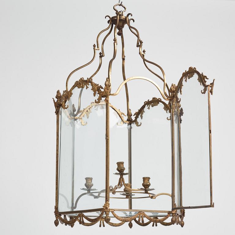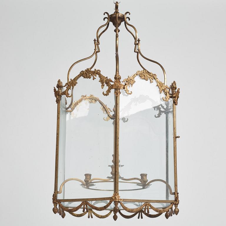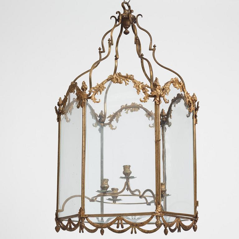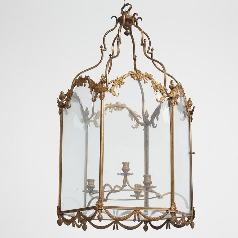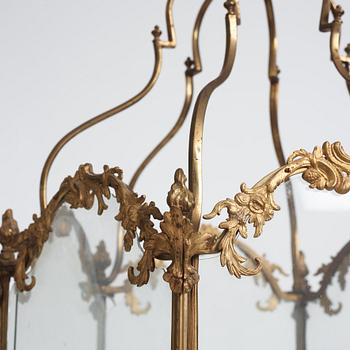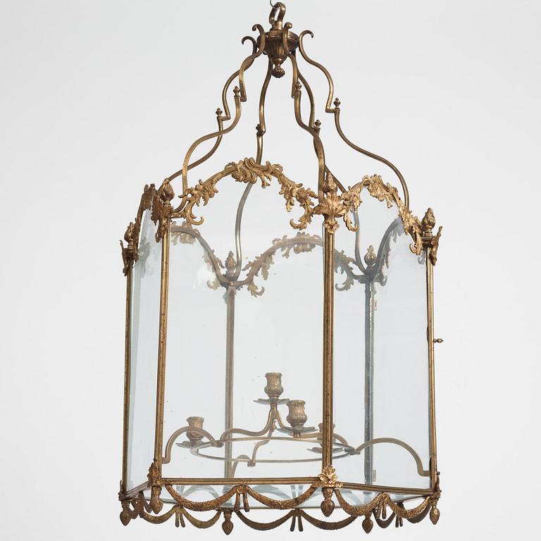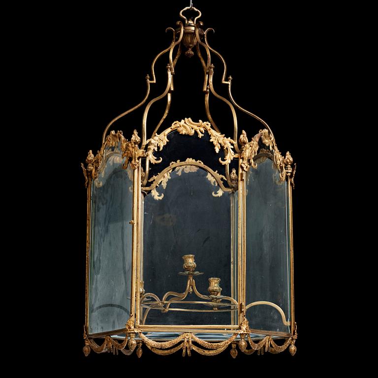 Stomme av förgylld mässing med sidor av glas. Hexagonal form. Rik dekor av rocailler, blommor, girlander, samt finialer i form av eldslågor. Höjd 94, diameter 56 cm.