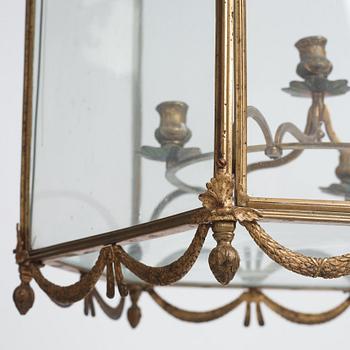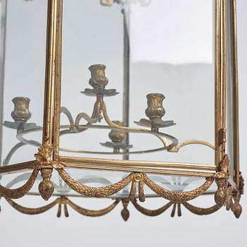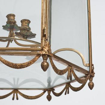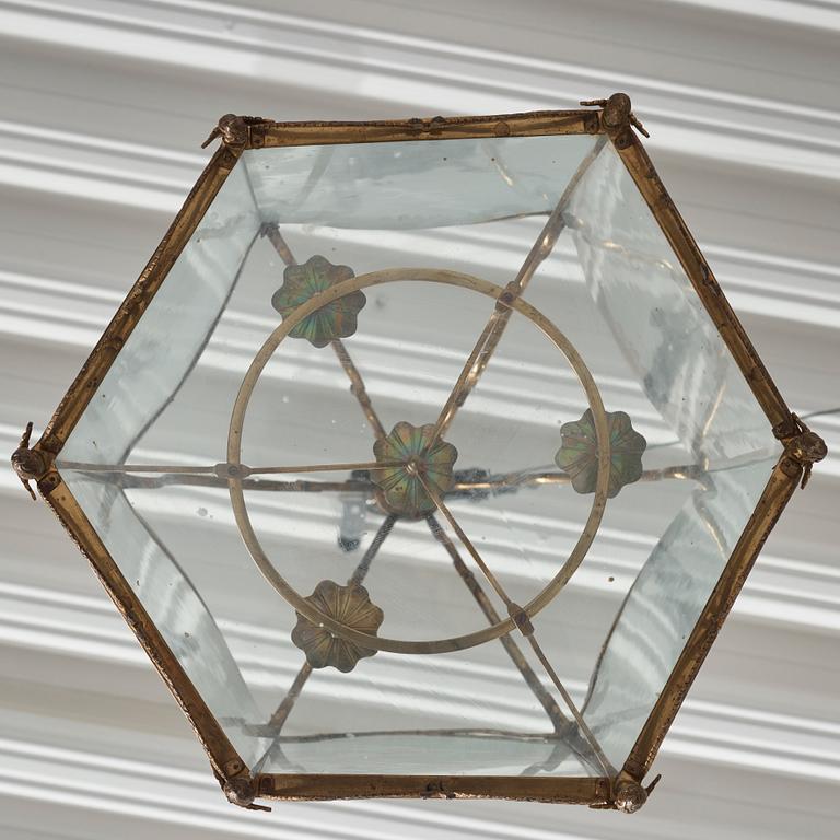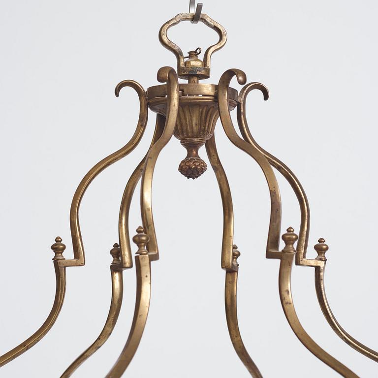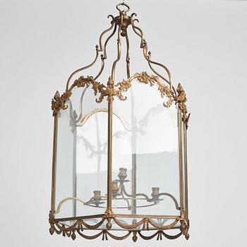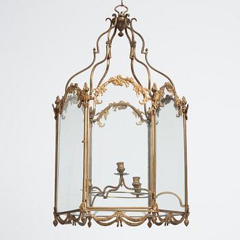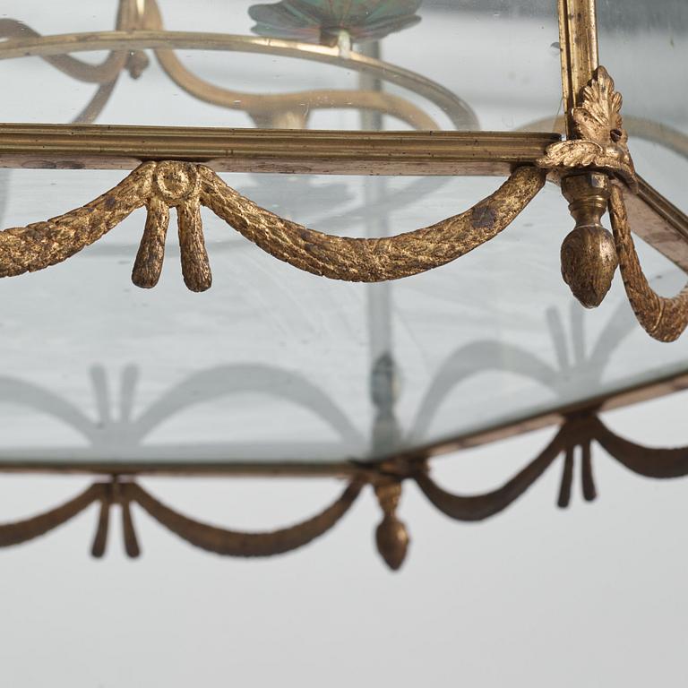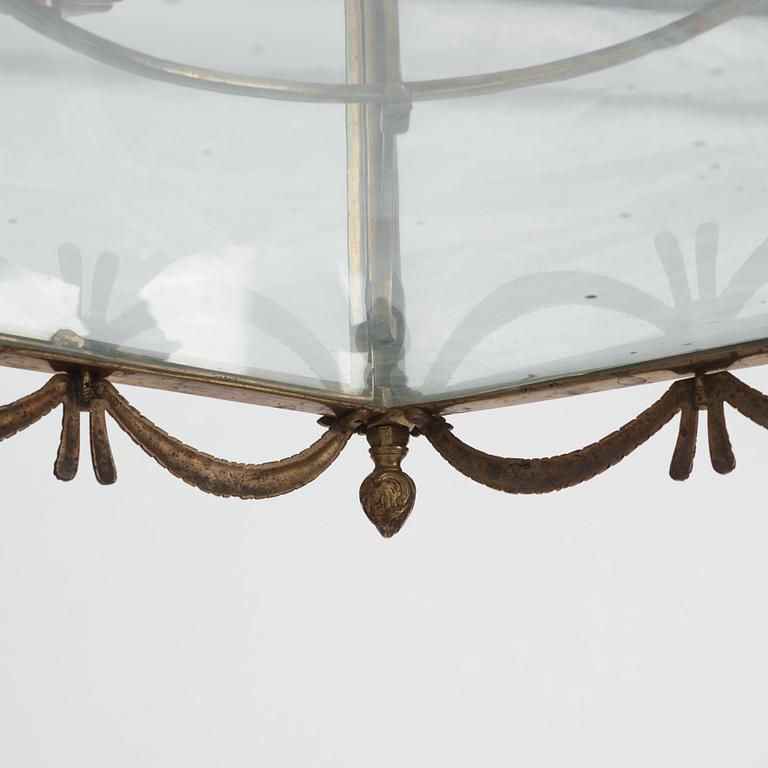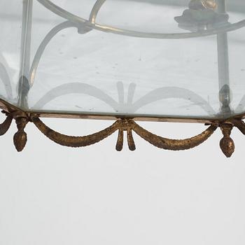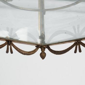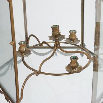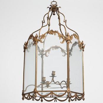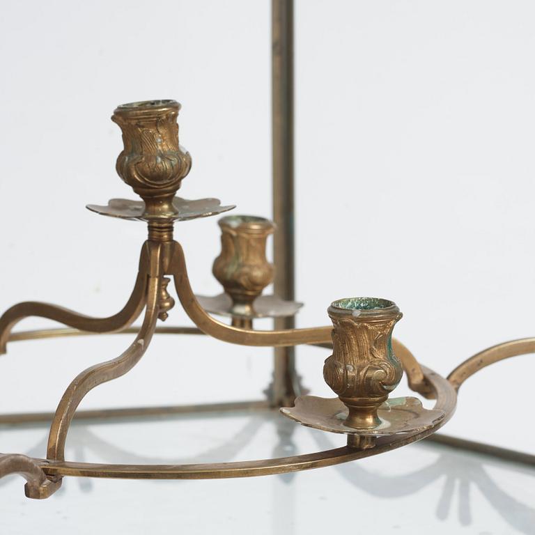Stomme av förgylld mässing med sidor av glas. Hexagonal form. Rik dekor av rocailler, blommor, girlander, samt finialer i form av eldslågor. Höjd 94, diameter 56 cm.