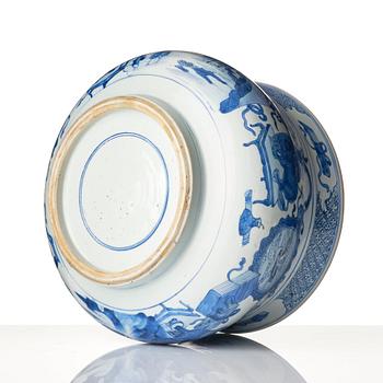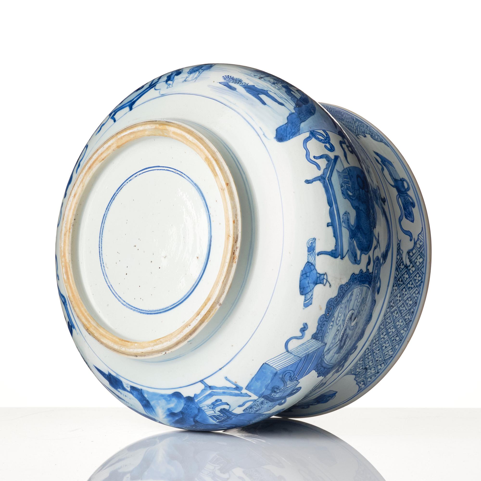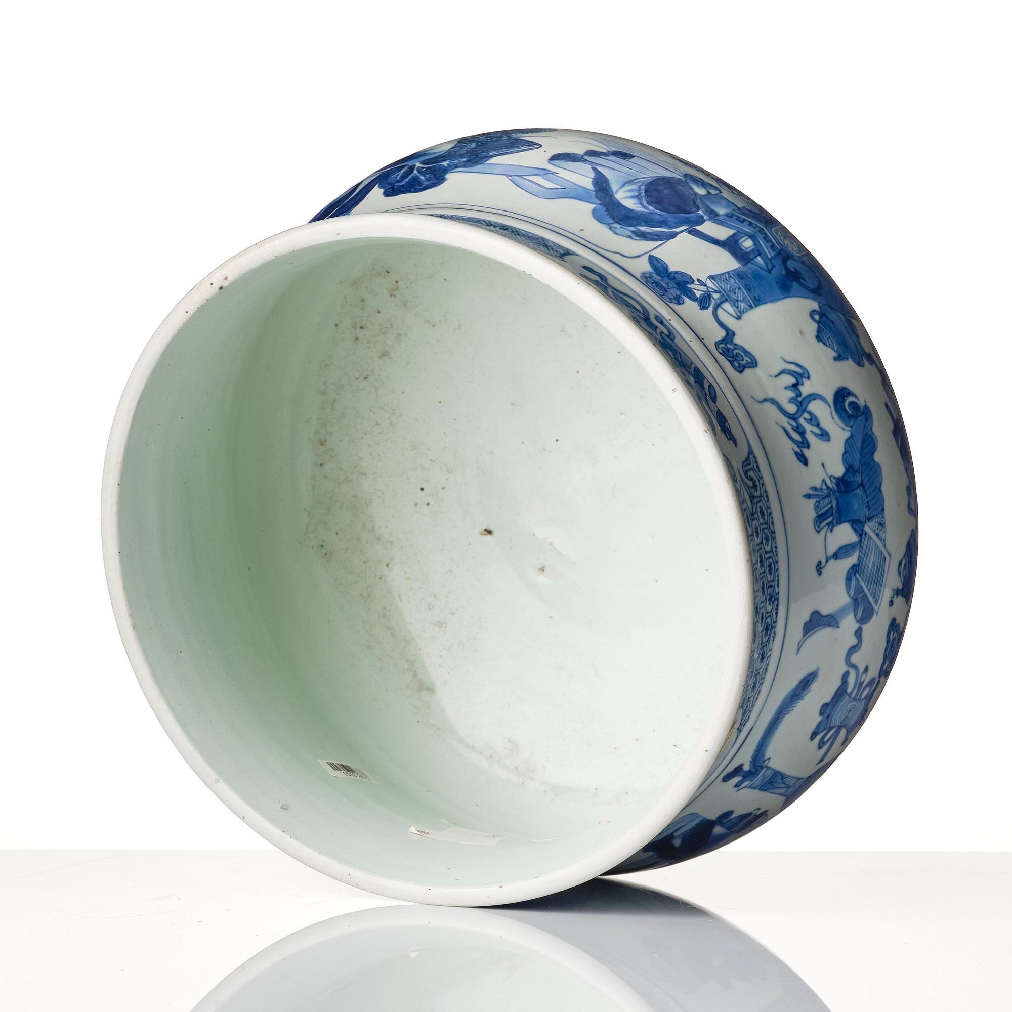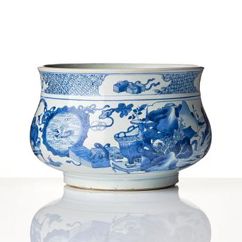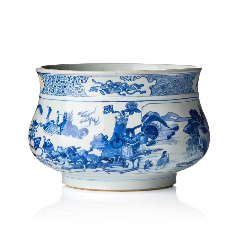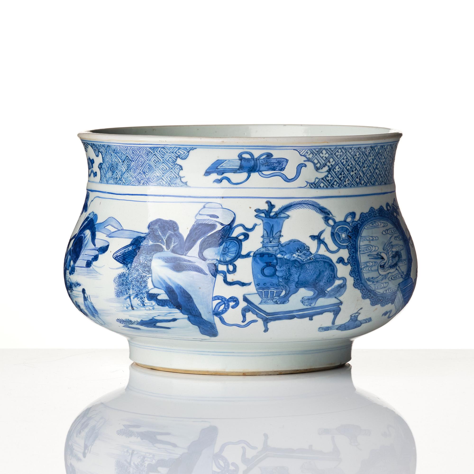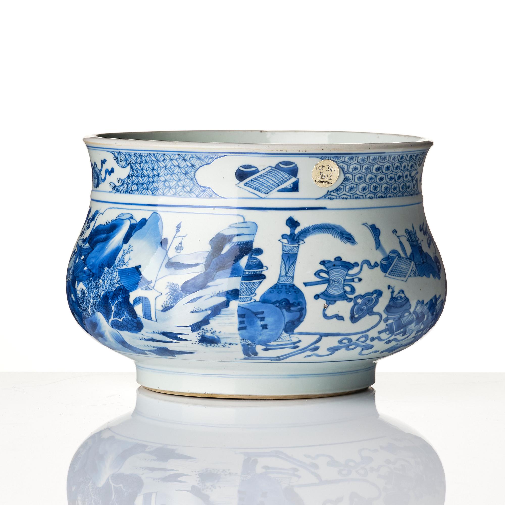 Kraftfullt modellerad med rundade sidor, stadig fotring med indragen hals och utsvängd mynning. Dekor i underglasyrblått symboliserande de hundra antiqviteterna och en utrullad målning som avbildar ett landskap. Allt under ett band med paneler dekorerade med ett qin-insturment, rullmålningar, böcker och ett brädspel. Höjd 17,5 cm. Diameter 24,8 cm.