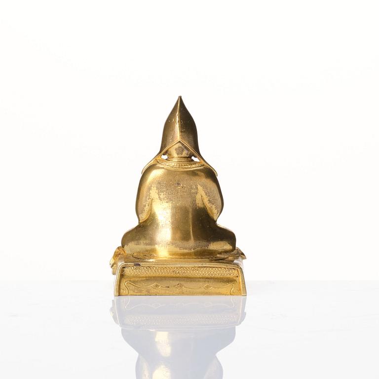 Troligen föreställande Gyalwa Gendün Gyatso (1475-1542), den andra Dalai Lama tillhörande Gelugpa-sekten, de gula hattarnas sekt. Korpulent kroppshydda, avbildad sittande i meditativ ställning, med högra handen i vitarka mudra, den vänstra handen vilar i knät, har troligen hållit en bok eller en vas som nu saknas. Höjd 10,5 cm.