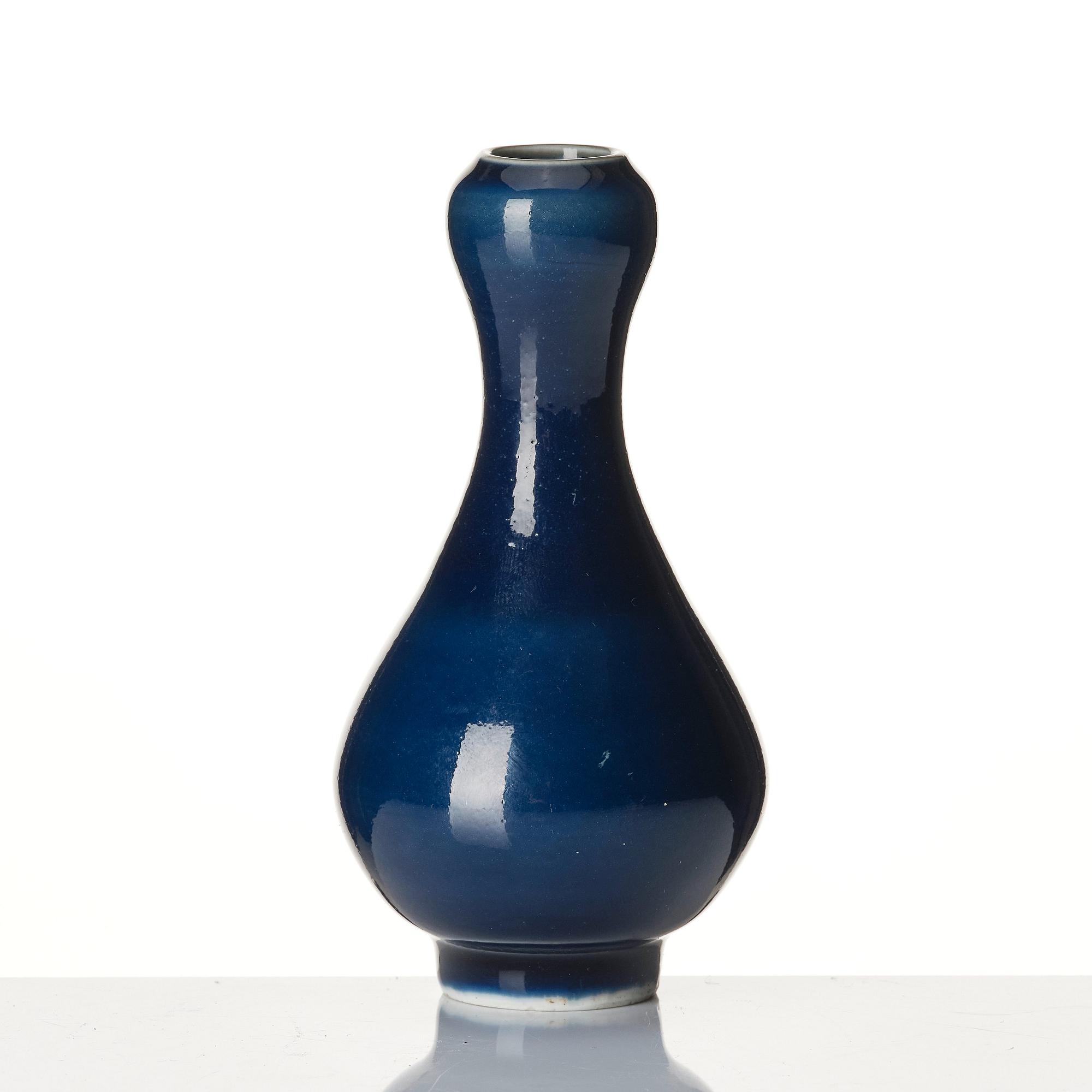 Lökformad mynning, päronformad vas på kort sluttande fotring. Glaserad i en midnattsblå glasyr. Höjd 13 cm.