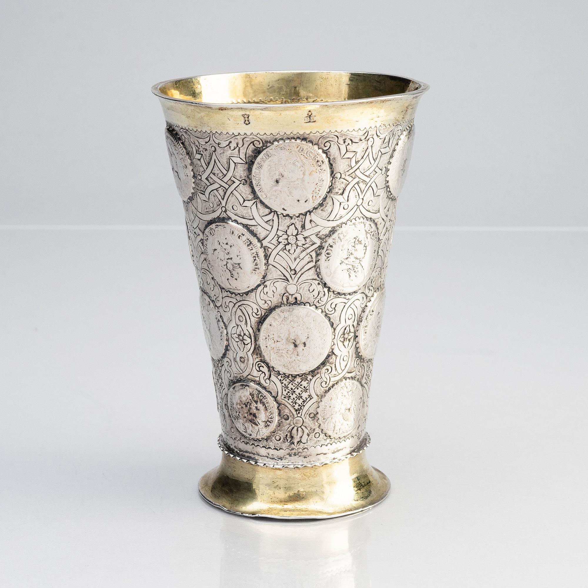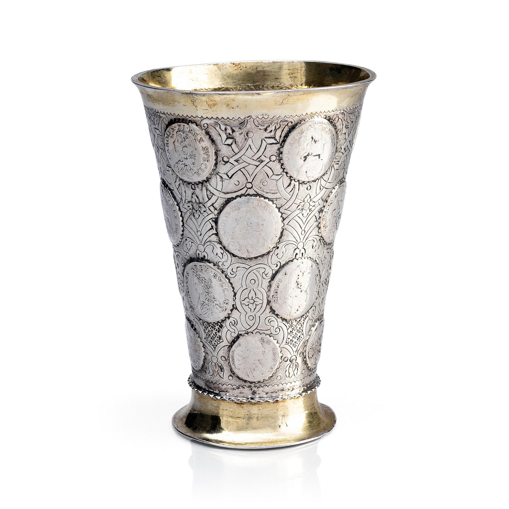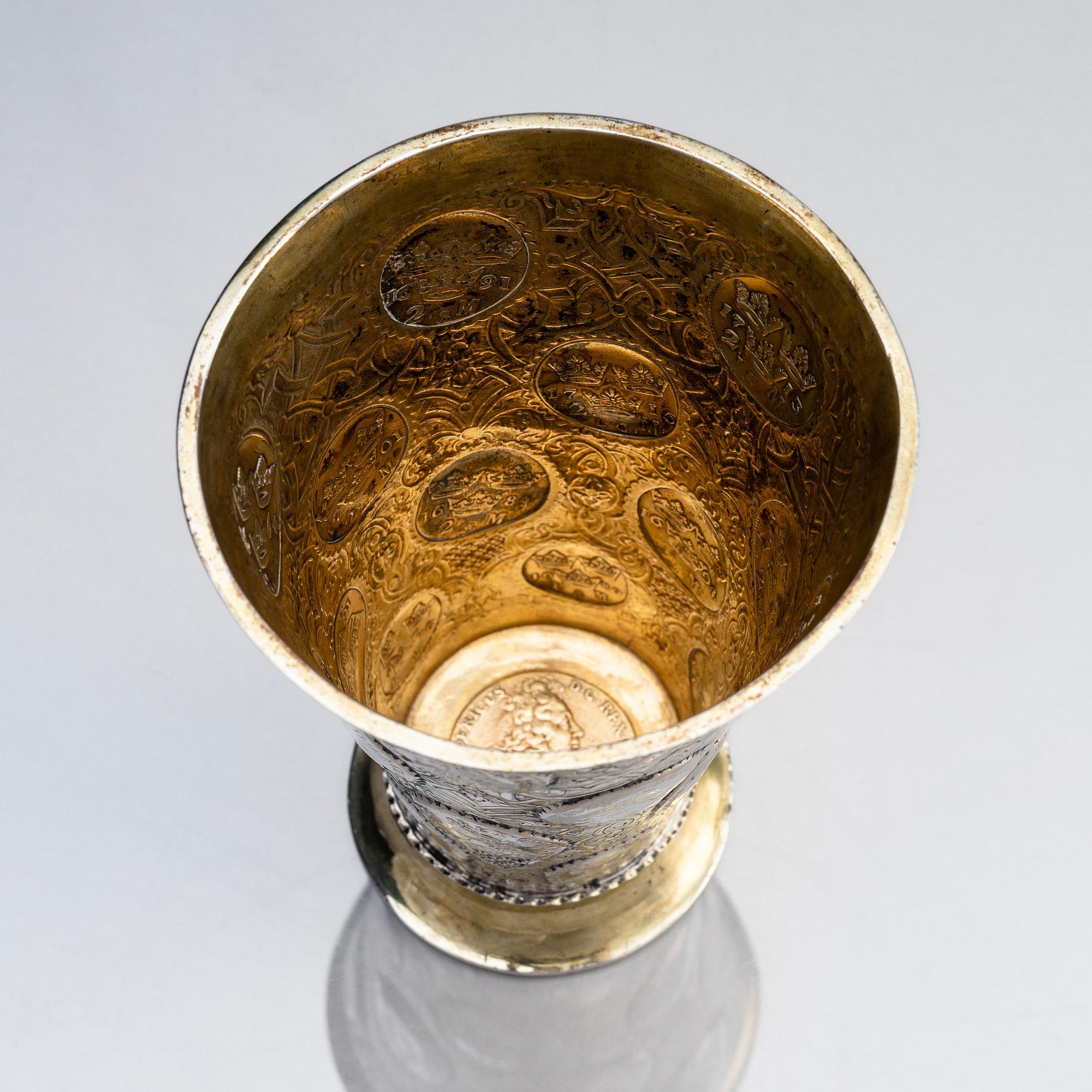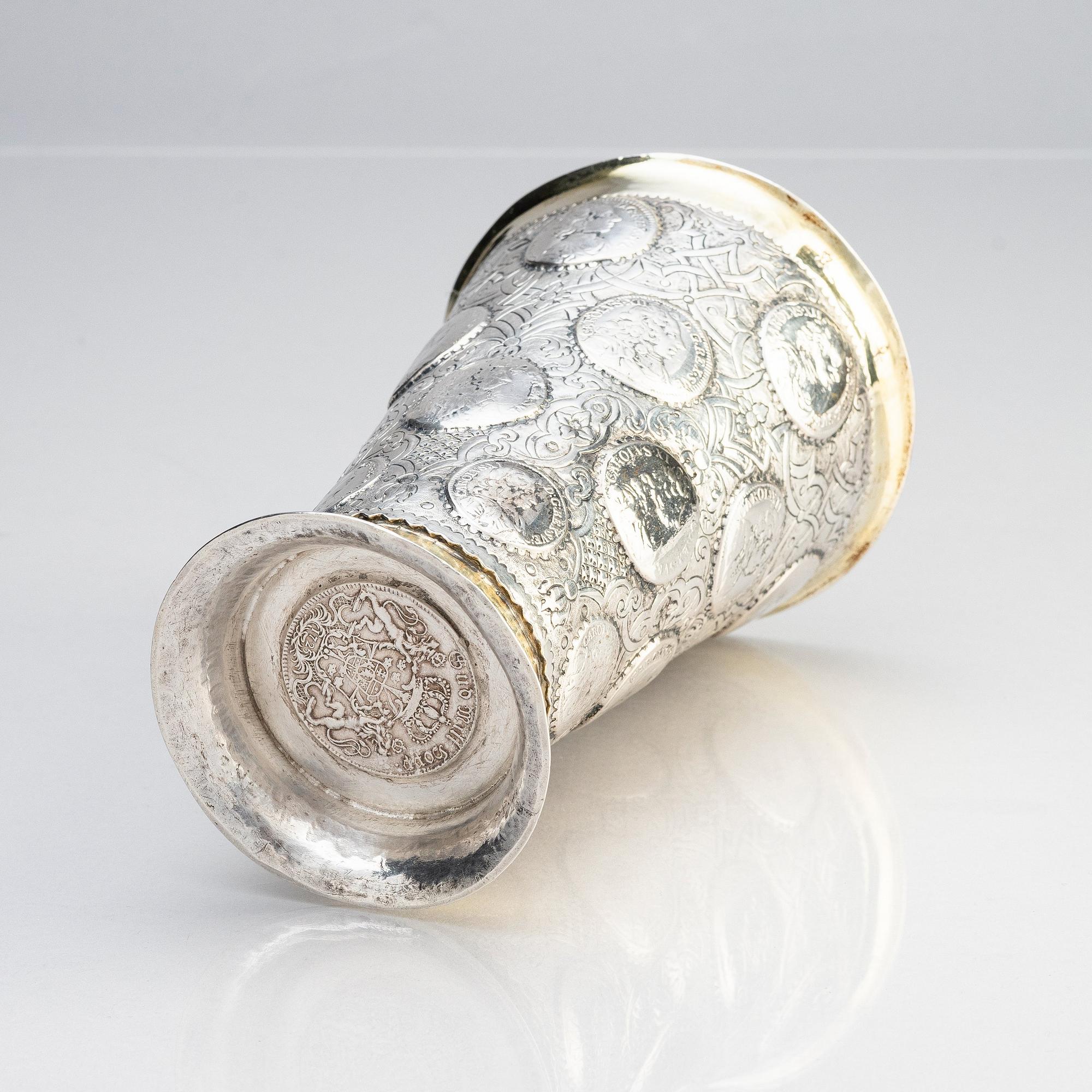 Delvis förgylld, runt livet infattade mynt från Karl XI och Karl XII av en- och tvåmarks valör mot en grund av berain-ornamentik mot mattpunsad fond: 5 stycken enmarksmynt från 1686 till 1711 och 15 tvåmarksmynt från 1662 till 1716 samt i botten en Fredrik I:e riksdaler från 1725. Höjd 17 cm. Diameter upptill 11,5 cm. Vikt 456 g.
