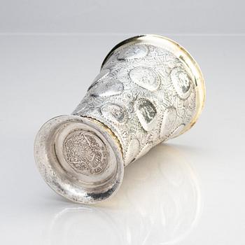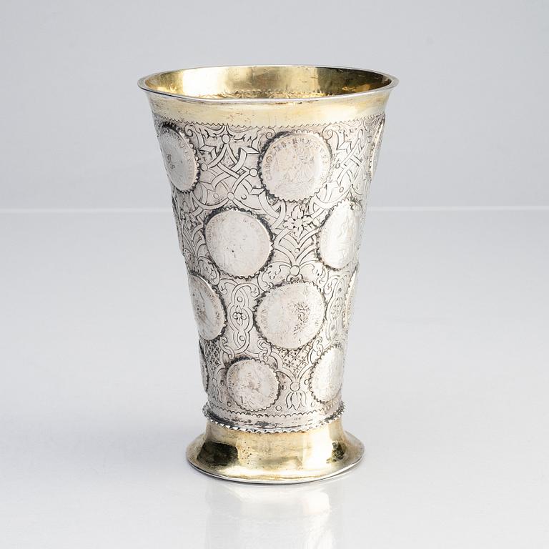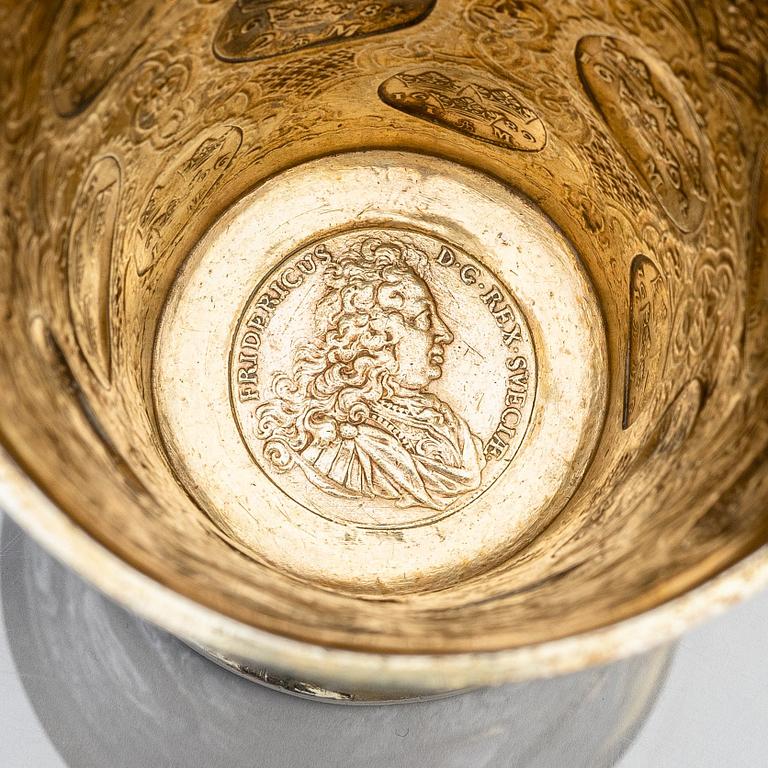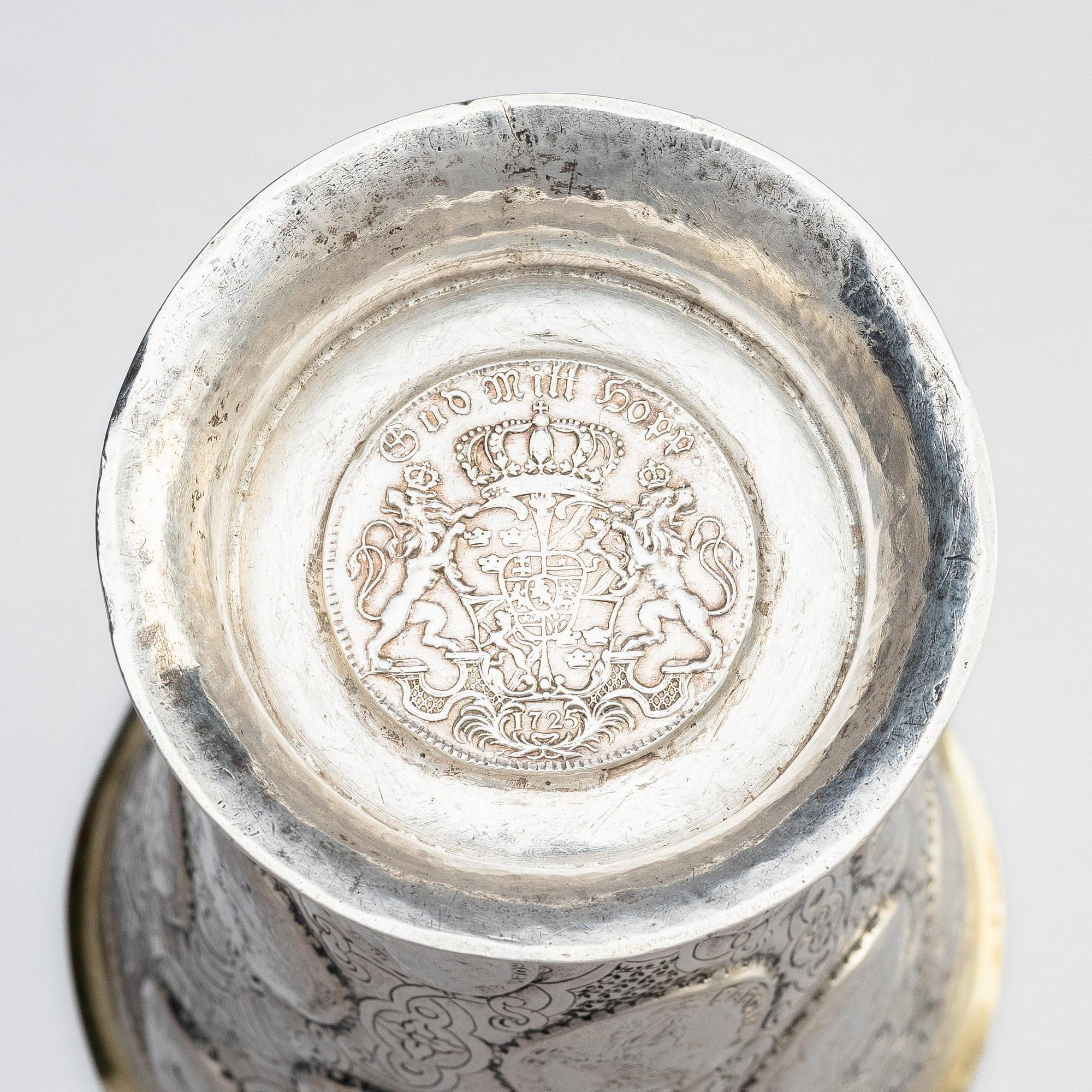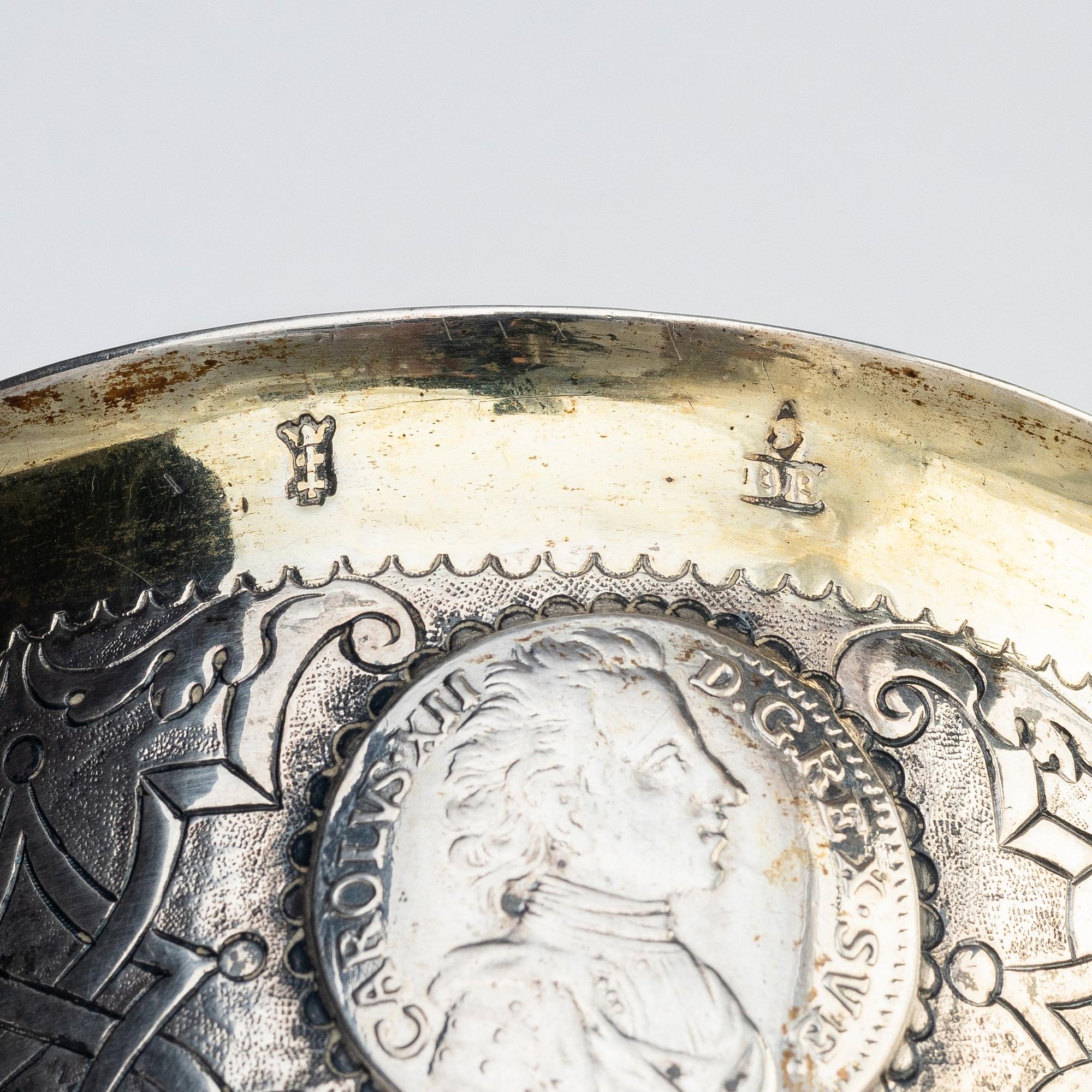 Delvis förgylld, runt livet infattade mynt från Karl XI och Karl XII av en- och tvåmarks valör mot en grund av berain-ornamentik mot mattpunsad fond: 5 stycken enmarksmynt från 1686 till 1711 och 15 tvåmarksmynt från 1662 till 1716 samt i botten en Fredrik I:e riksdaler från 1725. Höjd 17 cm. Diameter upptill 11,5 cm. Vikt 456 g.