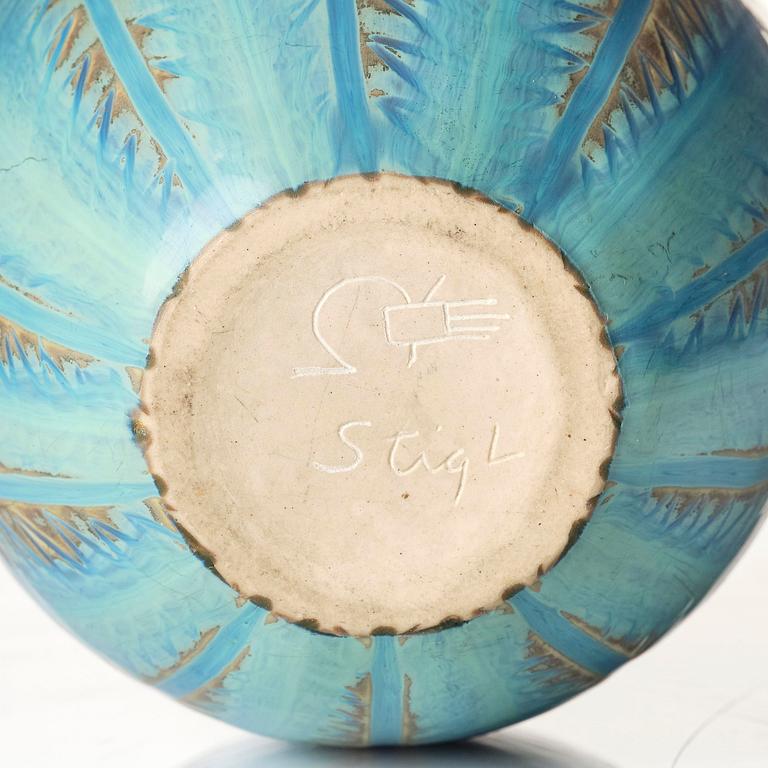 Ristad dekor av stiliserade blad, glasyr i turkos och beige, signerad Stig L med studiohanden. Höjd 13,5 cm.
