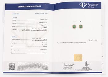 Totalvikt diamanter ca 1.00 ct, vikter smaragder 1.52 ct och 1.74 ct enligt medföljande certifikat från GCS No 5784-1603 och gravyr en med ursprung Colombia enligt samma certifikat, mått örhängen ca 13 X 16 mm med krok, totalvikt 5 g.