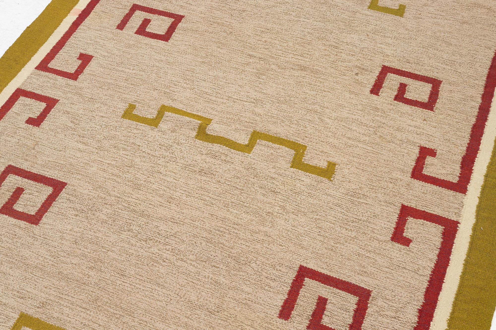 Gråmelerad botten med stiliserande ornament i grönt, rött och vitt.