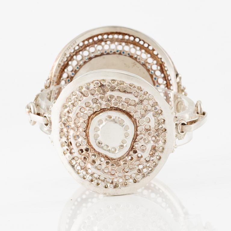 Bukowskis har den stora glädjen att på vårens Moderna auktion presentera en samling föremål av silverkonstnären Lars Arby. Arbys konstnärskap visades nyligen på en utställning på Prins Eugens Waldemarsudde där hans personliga och säregna corpusarbeten och smycken ingick som huvudnummer i den hyllade utställningen ”Silver” den 25 april – 22 september 2024. Lars Arby gick ur tiden 2002 men hans experimentella silverarbeten fortsätter att fascinera och inspirera nya generationer vilket Waldemarsuddes utställning tydligt vittnar om. Arby blev 1964 medlem av den nyskapande sammanslutningen av guld- och silversmeder som har namnet Nutida Svenskt Silver och som grundades året innan. Tillsammans med denna grupp hade han flertalet hyllade utställningar. Han föddes i Johanneberg 1933 och började sin konstnärliga utbildning på Konstfack i Stockholm där han utexaminerades 1956, han studerade sedan vidare på Konstindustriskolan i Göteborg fram till 1958. Han drev egen verksamhet som formgivare och silversmed fram till sin bortgång i Göteborg 2002. Arby’s originelle formspråk är präglat av sin tid och i opposition till den tidigare funktionalismens stränga estetik. Med mästerlig hand och en fri och lekfull inställning till det traditionstyngda materialet intar Arby en särställning och har inspirerat senare generationer av silverkonstnärer. Han smidde, svetsade, emaljerade, borrade och ciselerade för att nå den form han ville uppnå. I början av 1980-talet drabbades Lars Arby av en stroke och blev oförmögen att fortsätta arbeta och hans alster låstes in i ett bankfack där de funnits förvarade tills nu. Det är en ära för Bukowskis att nu få visa upp upp och auktionera ut dessa föremål varav många ingen sett på mer än fyrtio år. Lars Arbys finns idag representerade på bland annat Röhsska museet och Nationalmuseum.