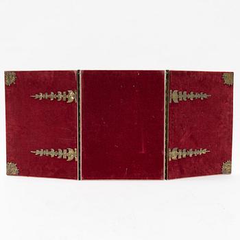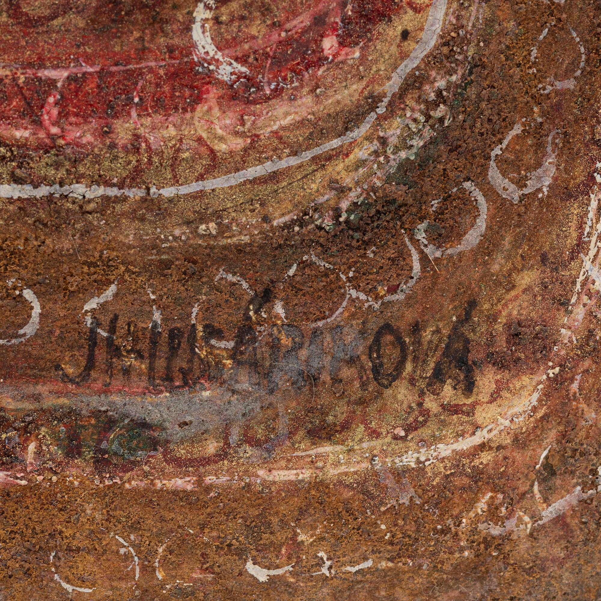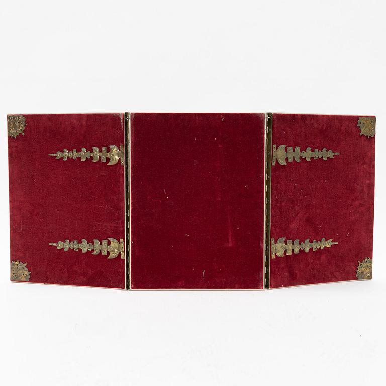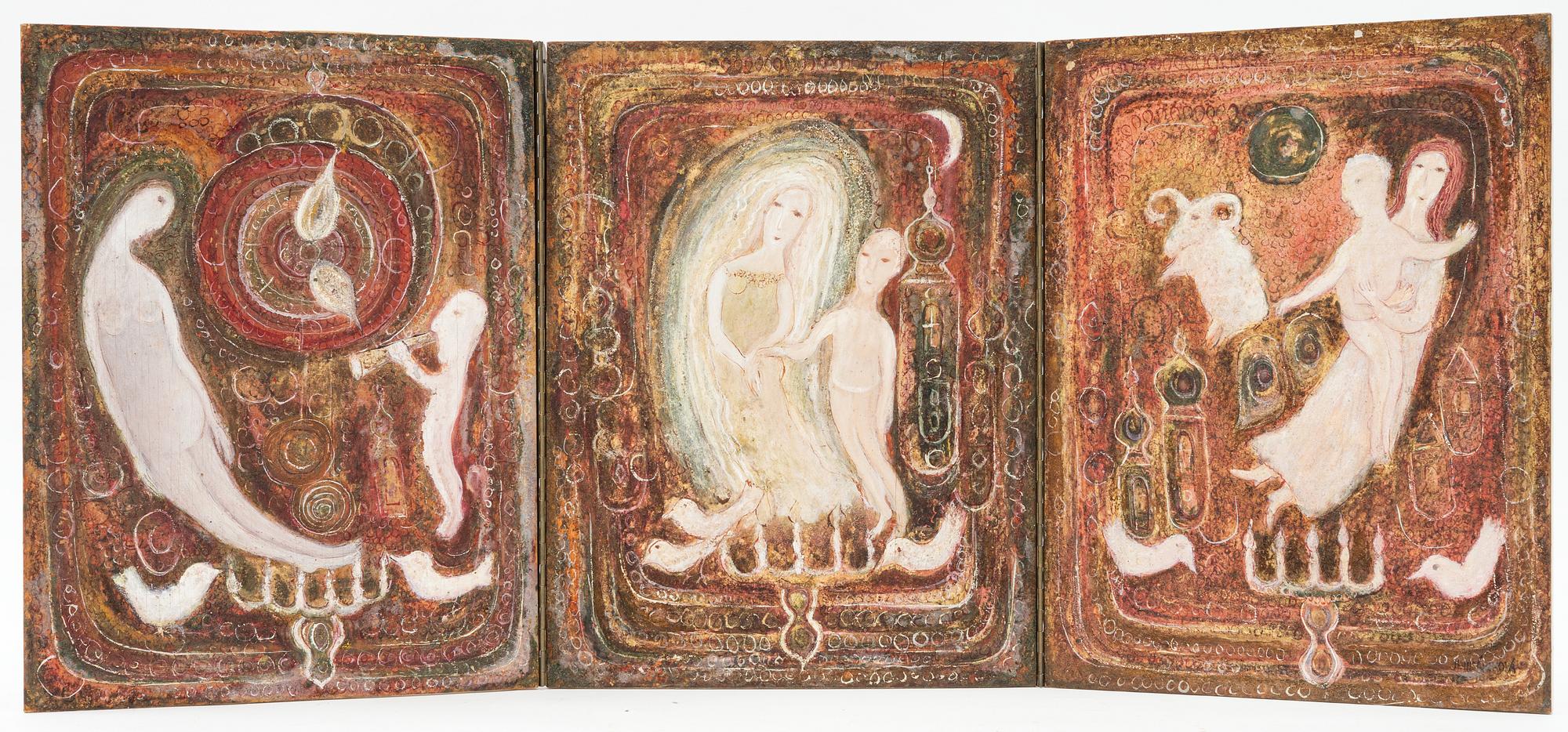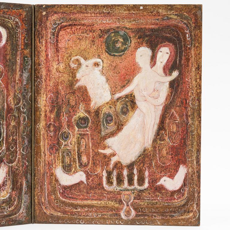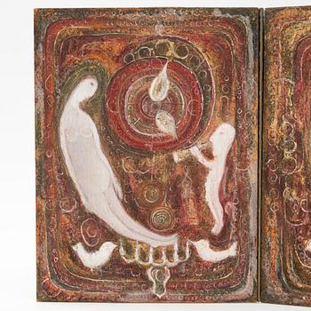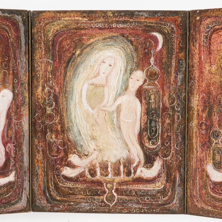 Signerad Jindra Husarikova. Triptyk. Blandteknik på pannå, totalt 53 x 121 cm.