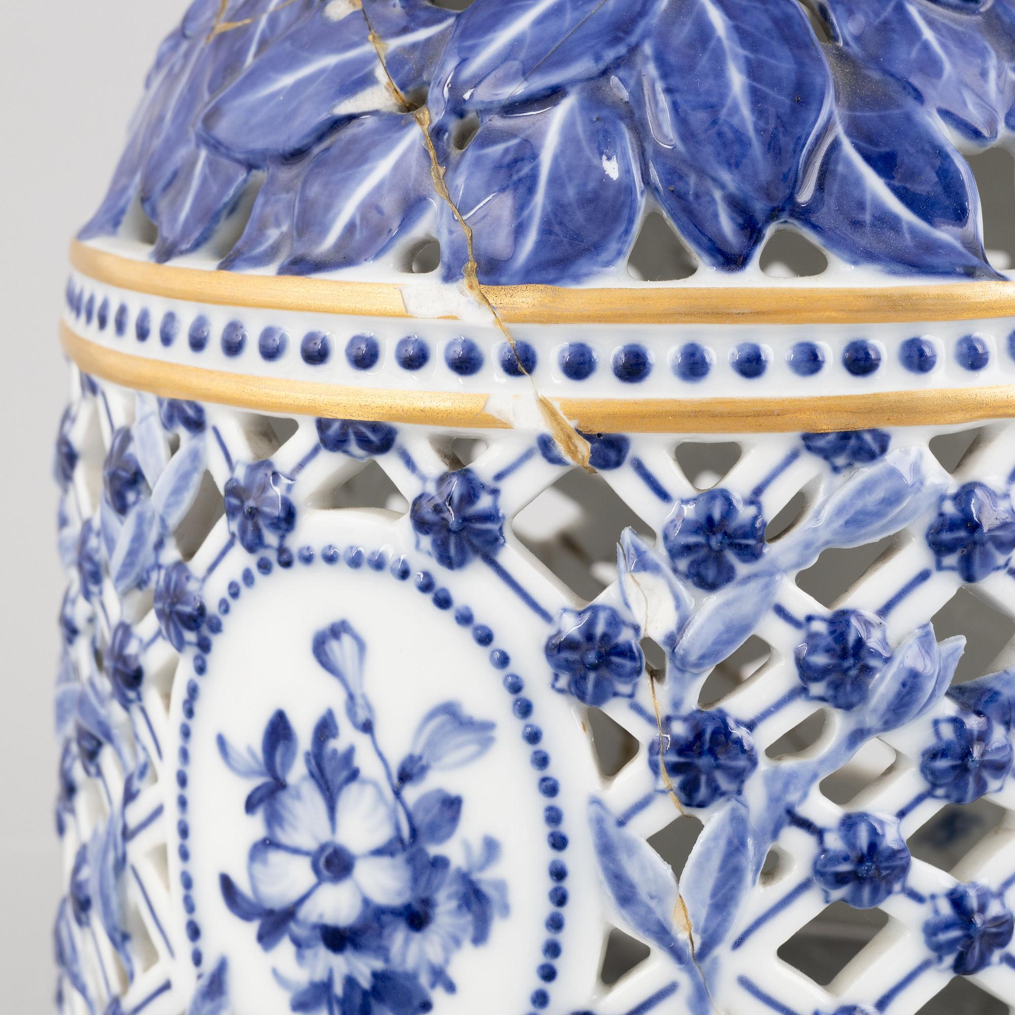 Dekor i underglasyrblått och förgyllning. Klockans lockknopp i form av tulpan, kupan med delvis genombrutet skulpterat bladverk, genombrutet nätmönster med blommor, ovala reserver vid sidorna innehållande blomsterbuketter. Fatet med räfflad dekor och musselmalet-mönster i underglasyrblått. Märkt med s.k. 'bølgelinier' eller vågmönster samt målarsignatur "18.". Höjd 26, fatets diameter 30 cm.