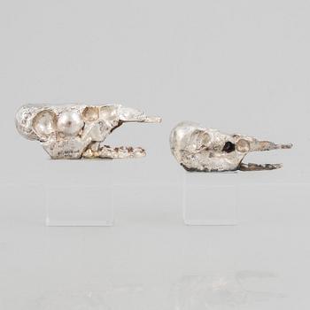 Skulpturer i form av djurskallar på baser av akryl. Den större: höjd 9 cm (inklusiva akrylbas), längd 11 cm. Den mindre: höjd 8 cm (inklusive akrylbas), längd 9,5 cm. Total vikt (inklusive baser) ca 265 g.