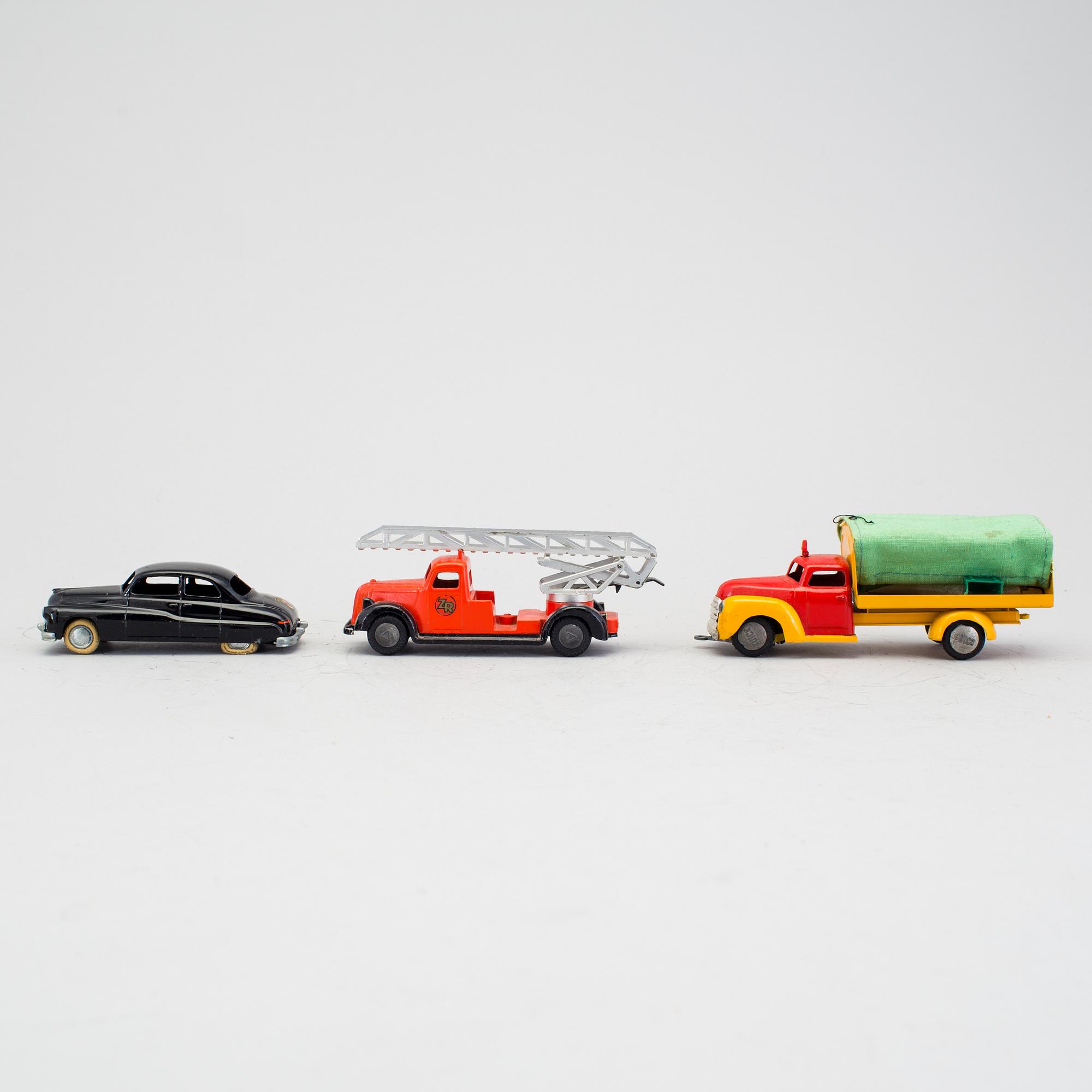 Bestående av bland annat Tekno stegbil, Carlsberg bryggeribil, trucktransport 453, Dinky Toys 150 Rolls Royce. Vissa med originalkartonger samt två extra kartonger till politibil 427 samt töndebil 734. Längd 11-24 cm.