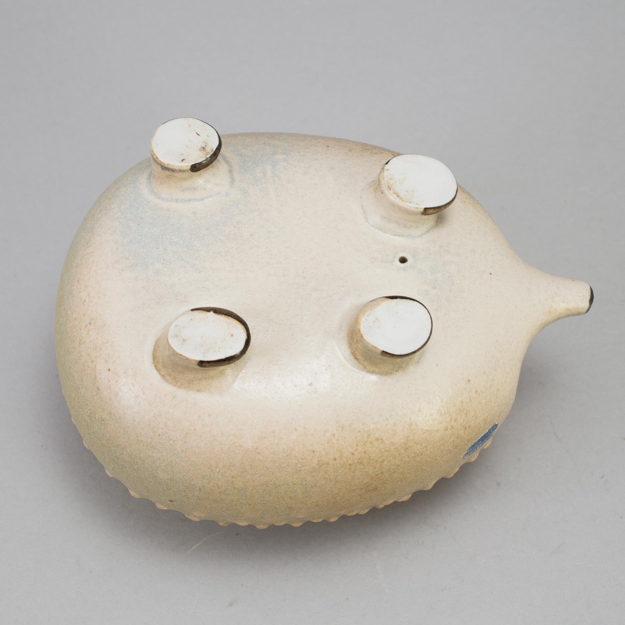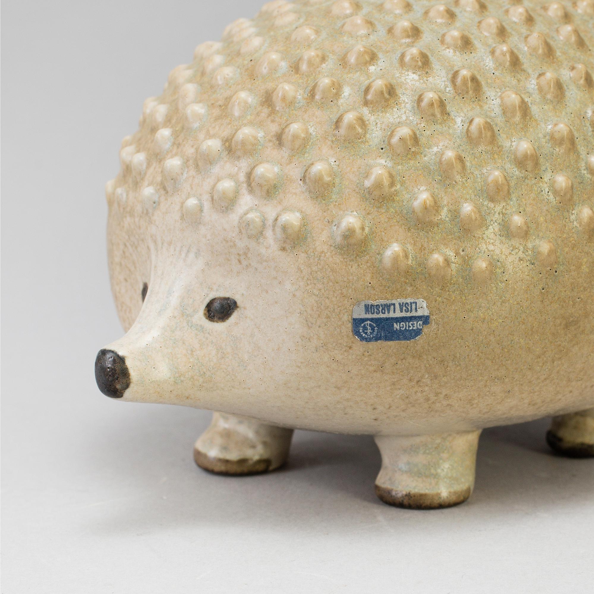 I form av igelkott. Glaserad i beige och brunsvart. Etikettmärkt DESIGN LISA LARSON GUSTAVSBERG. Höjd ca 11, längd ca 17 cm.
