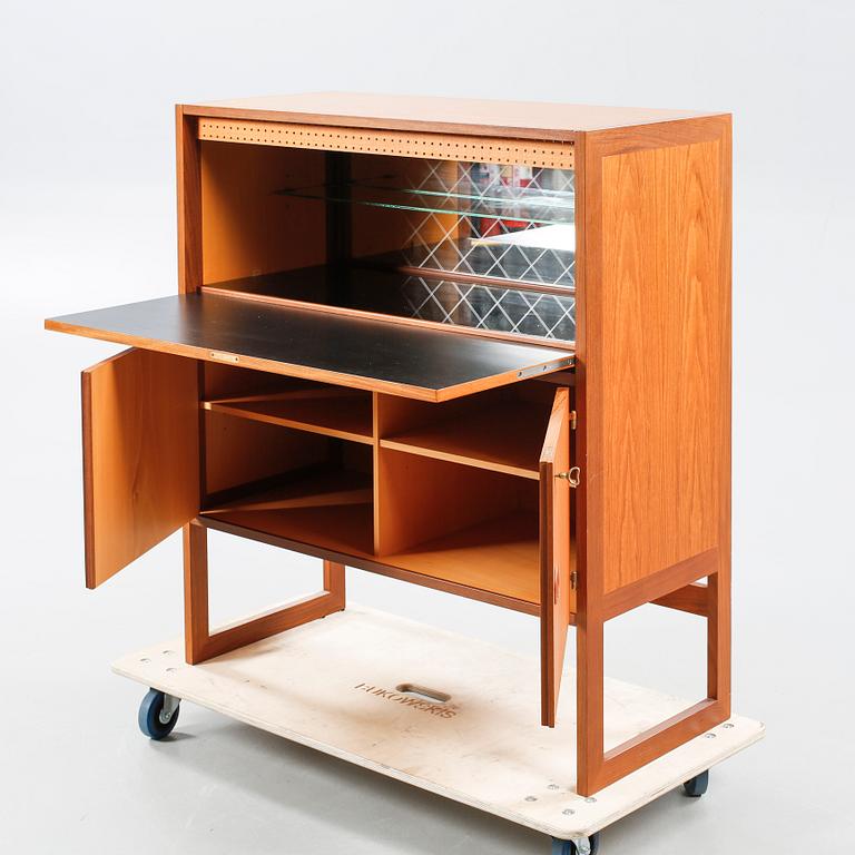Oljad och plastbehandlad yta. Teakfaner. Skåp och benparti av massiv teak. Inredning med spegelvägg, glashylla, glasbotten, inbyggd belysning och plastbelagd klaff. Längd 100 cm. Bredd 45 cm. Höjd 113 cm. Nyckel finns.