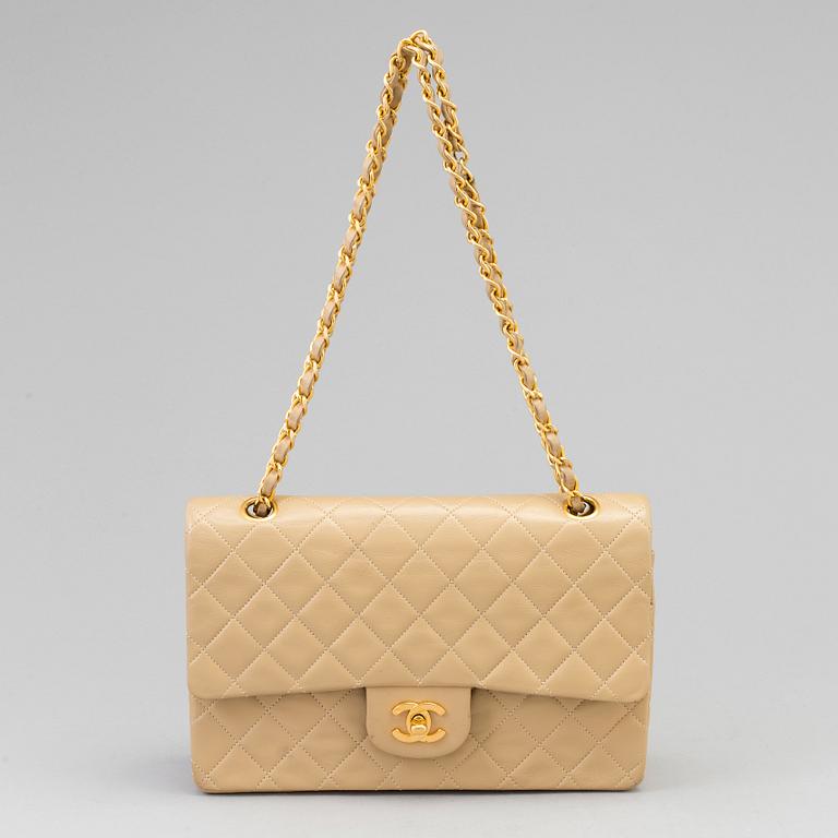 Beige quiltat lammskinn. Axelrem med tvinnat skinnband i guldfärgad metallkedja. Fodrad med beige läder. Fem fack invändigt. Ett ytterfack. Invändigt lock med tryckknapp. Utvändigt lock med spänne samt infällt fack med dragkedja. Numrerad etikett. Längd 25,5 cm, höjd 16 cm.