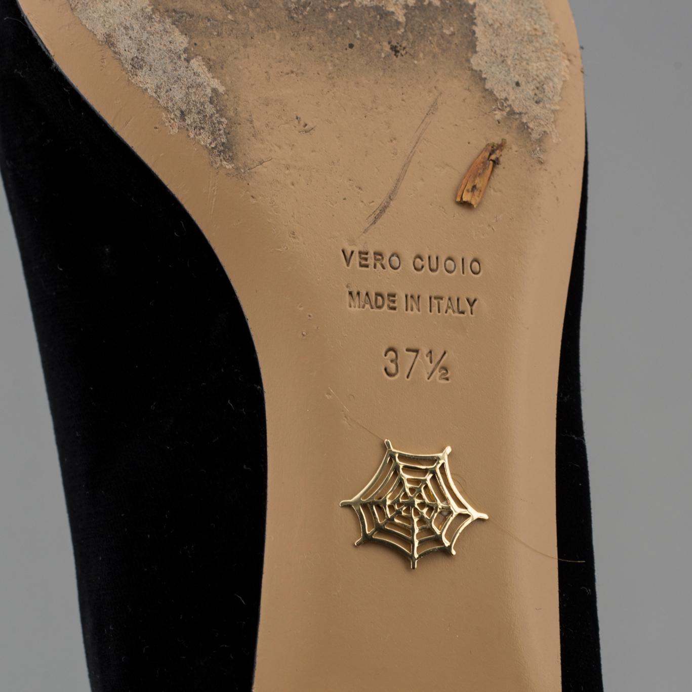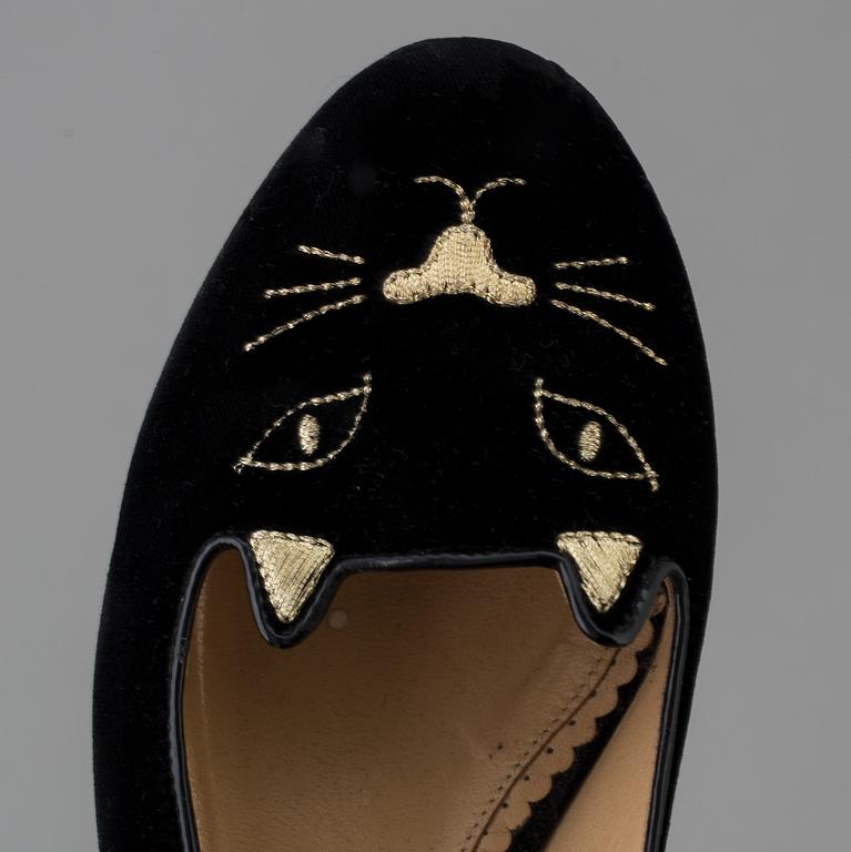Svart sammet med dekor av kattansikte broderad med guldtråd. Märkt "CHARLOTTE OLYMPIA". Guldfärgad klack, höjd 2 cm.