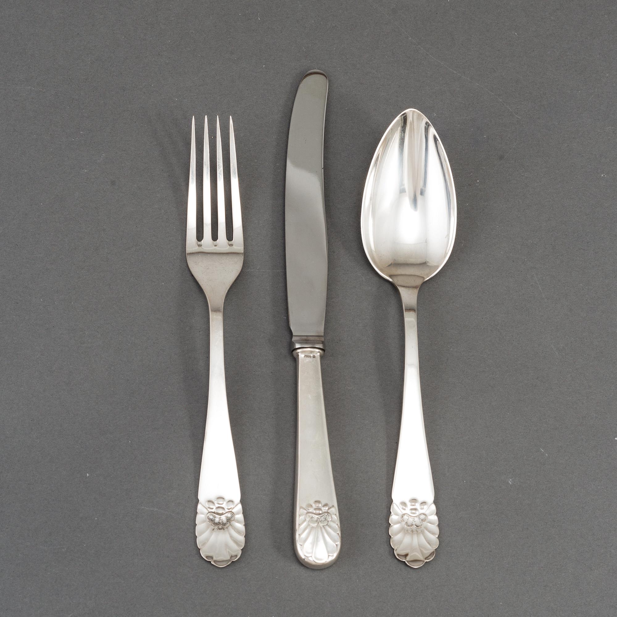 12 bordsskedar längd 18 cm 12 bordsgafflar längd 18 cm 12 bordsknivar längd 20,3 cm Total vikt inklusive rostfria blad 1484 gram.