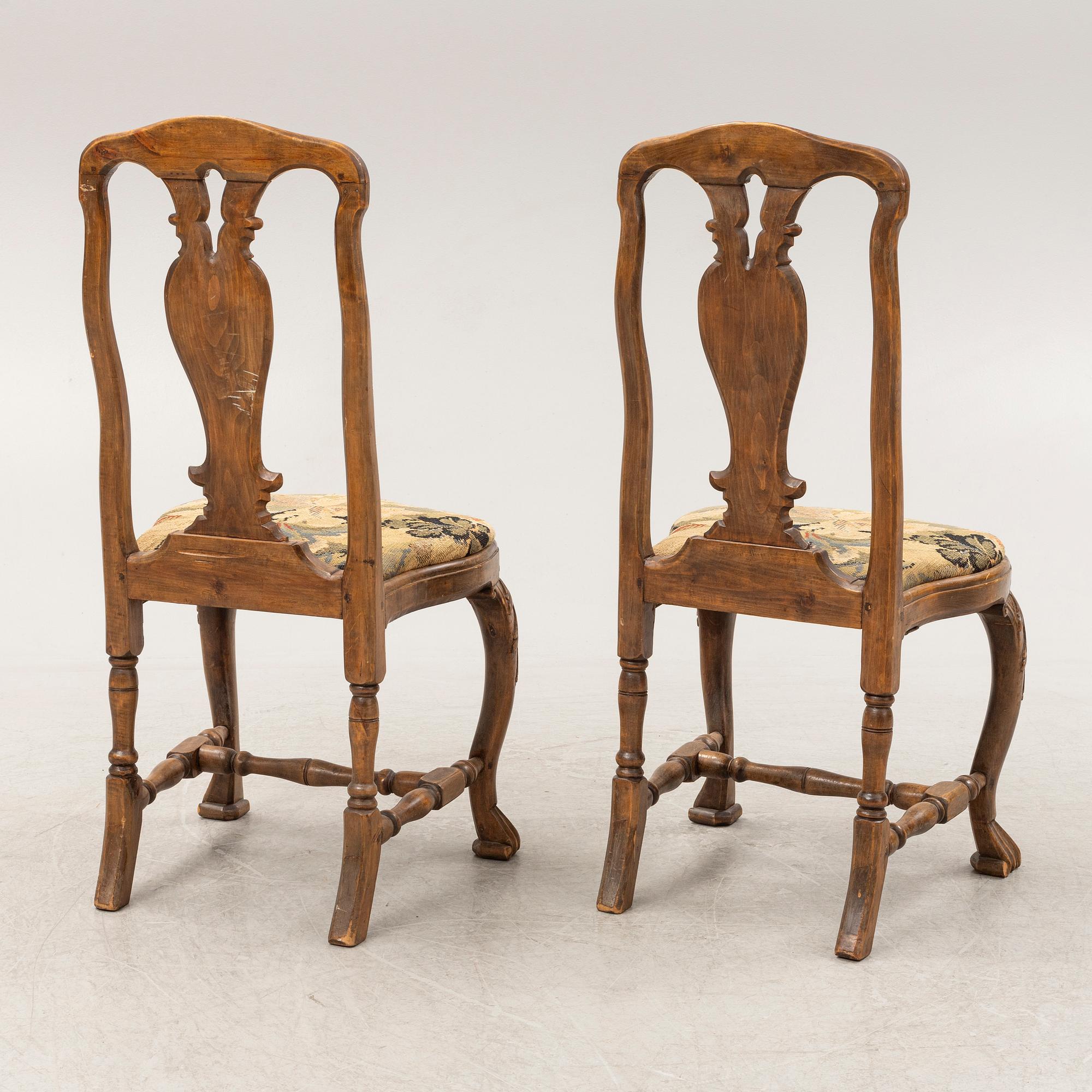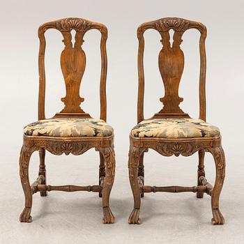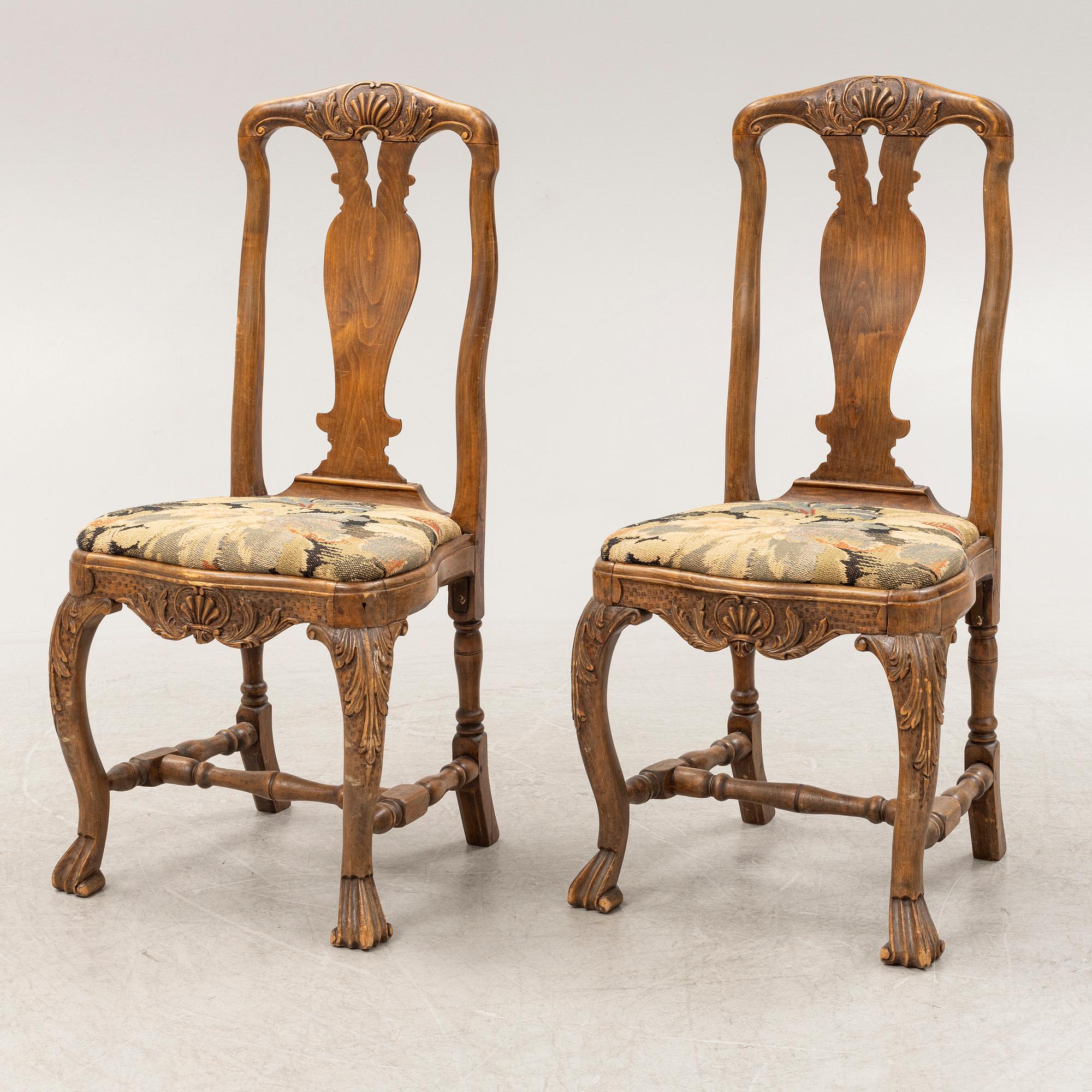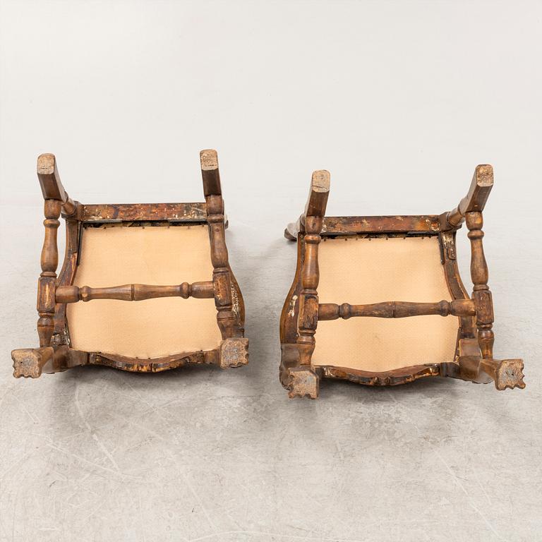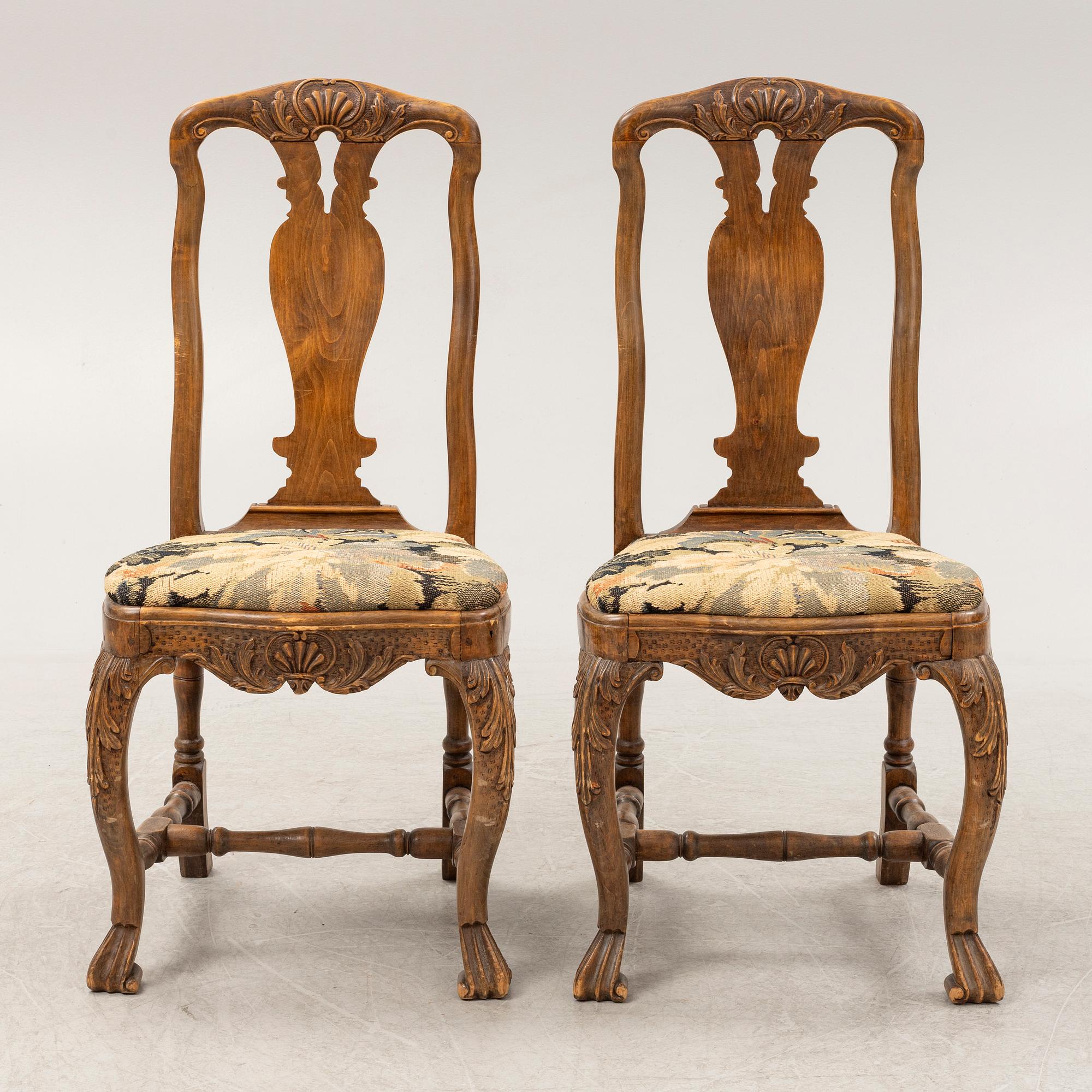 Stomme av lövträ med textilklädda lösa sitsar. Skuren dekor av musselformationer och blad. Sitthöjd 48, bredd 48, höjd 103 cm.