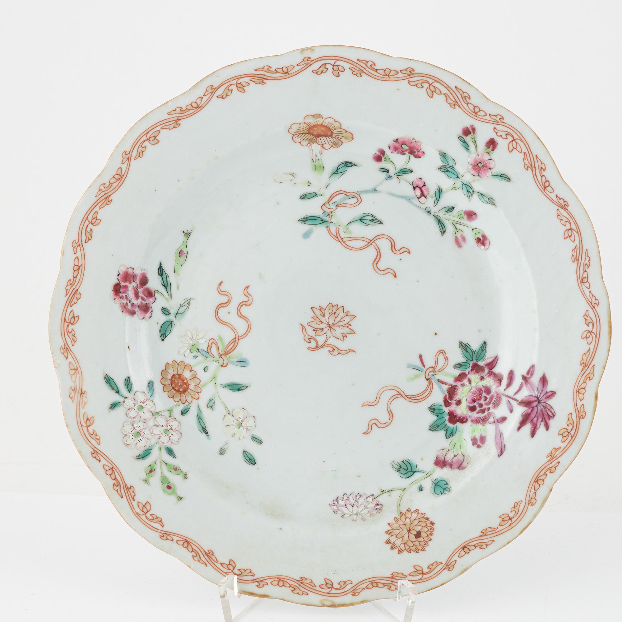 Konturerade med dekor i famille rosefärger föreställande ströblommor. Diameter 22,5 cm.