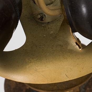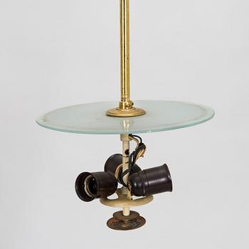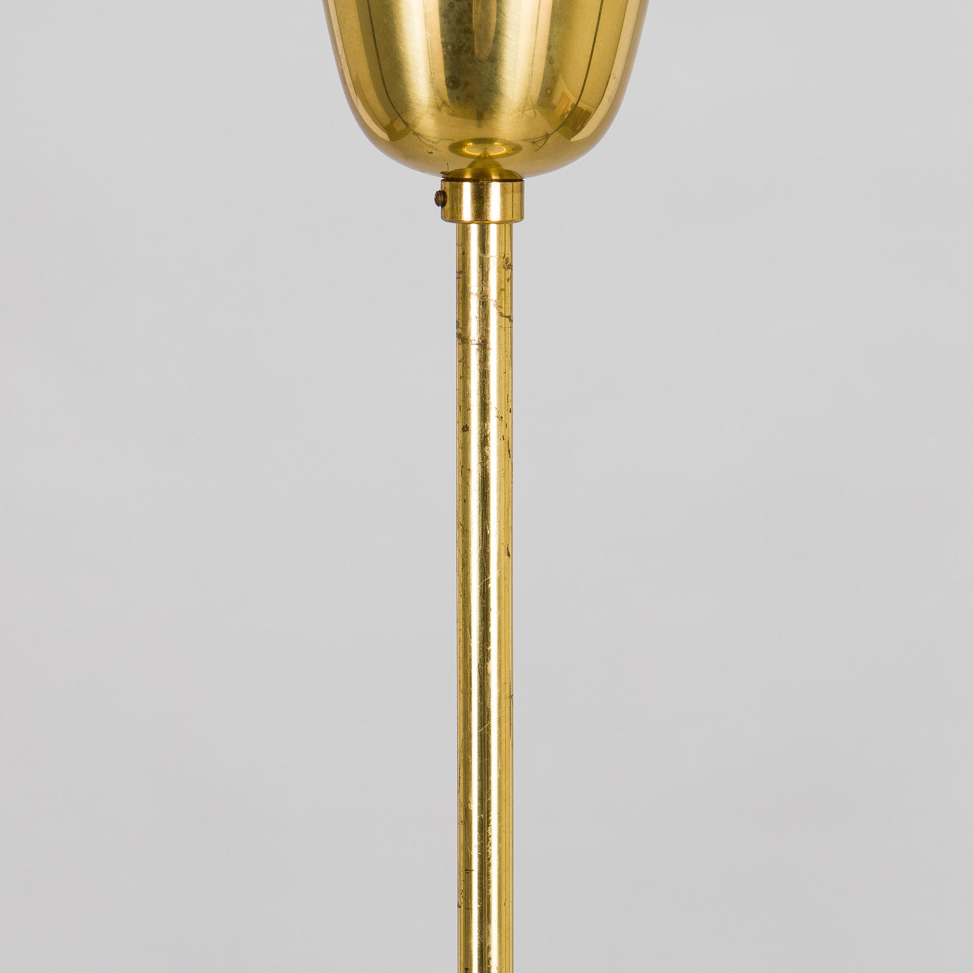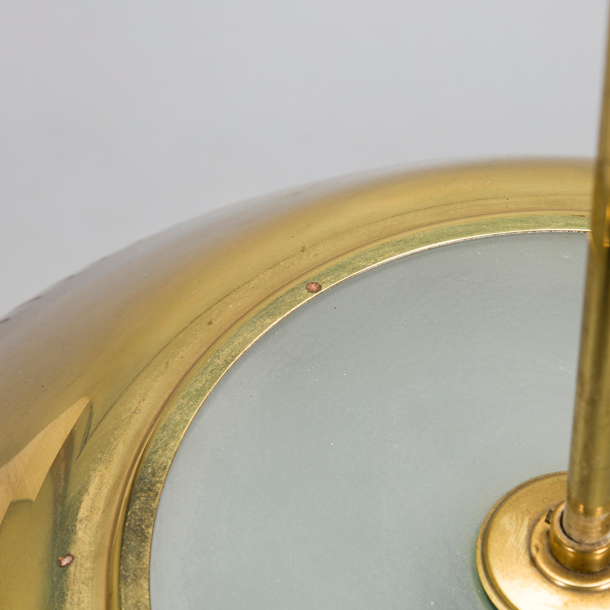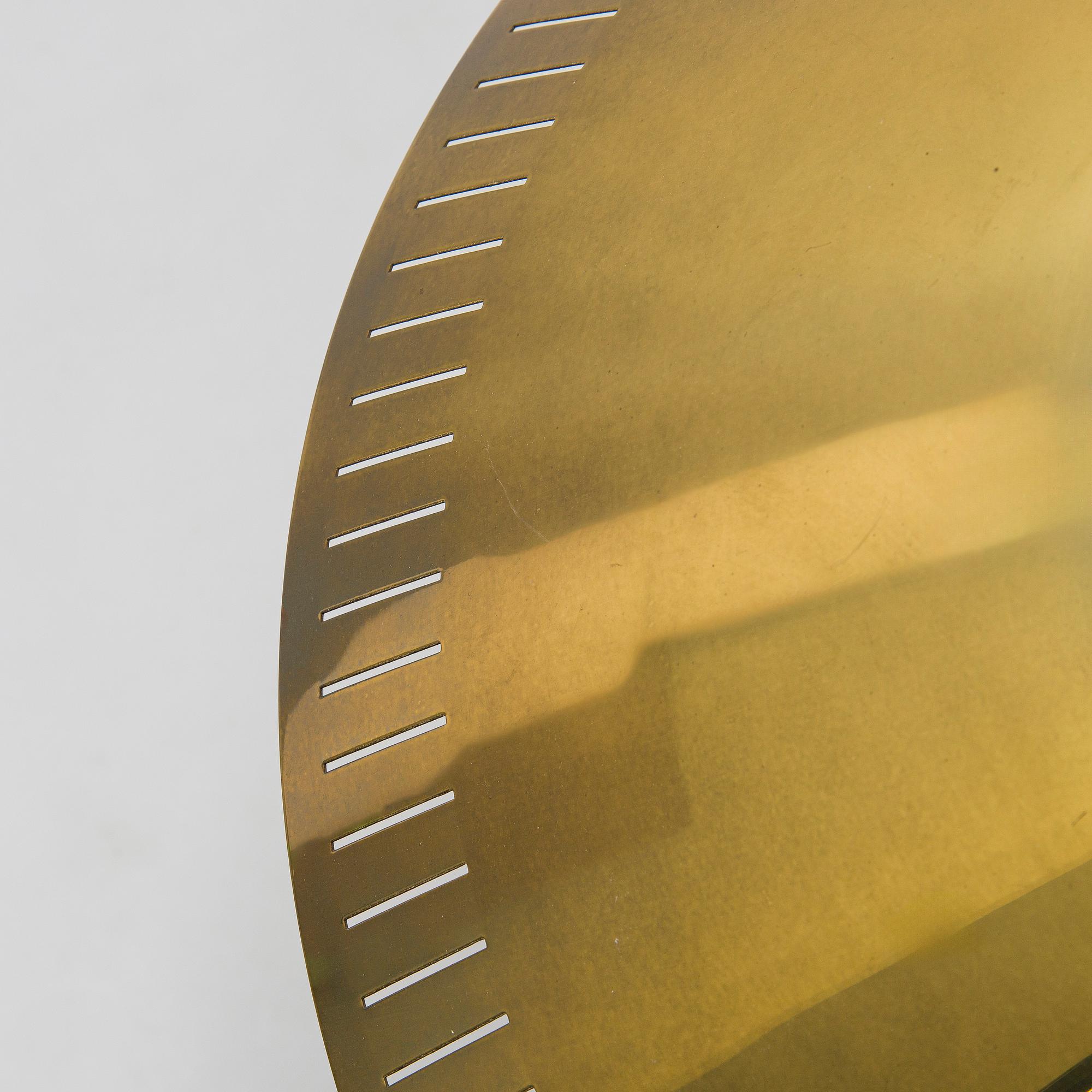 Mässingsskärm med underliggande reflektor i akryl. Bär tillverkarens stämpel. Total höjd ca 85 cm. Diameter 60 cm.