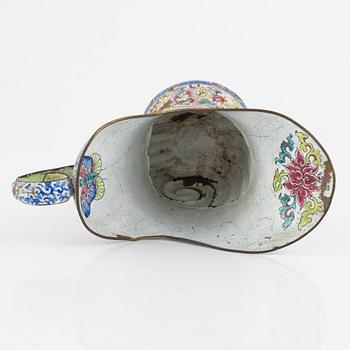 Hjälmformad med snäckformad kropp och svängt handtag. Rikt dekorerad i famille rose-paletten med motiv av blommor och bladverk, rundad fot med blommor. Insidan med fjäril och stiliserad lotus. Höjd 23,5 cm.