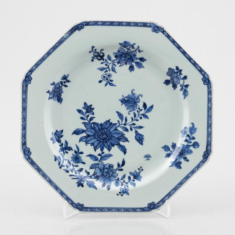 Oktagonalt. Dekor i underglasyrblått med motiv av strödda blommor. Diameter 32 cm.