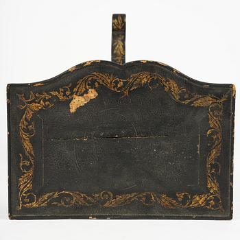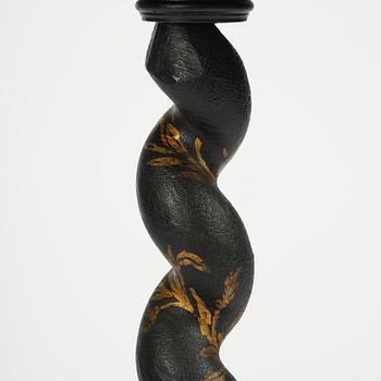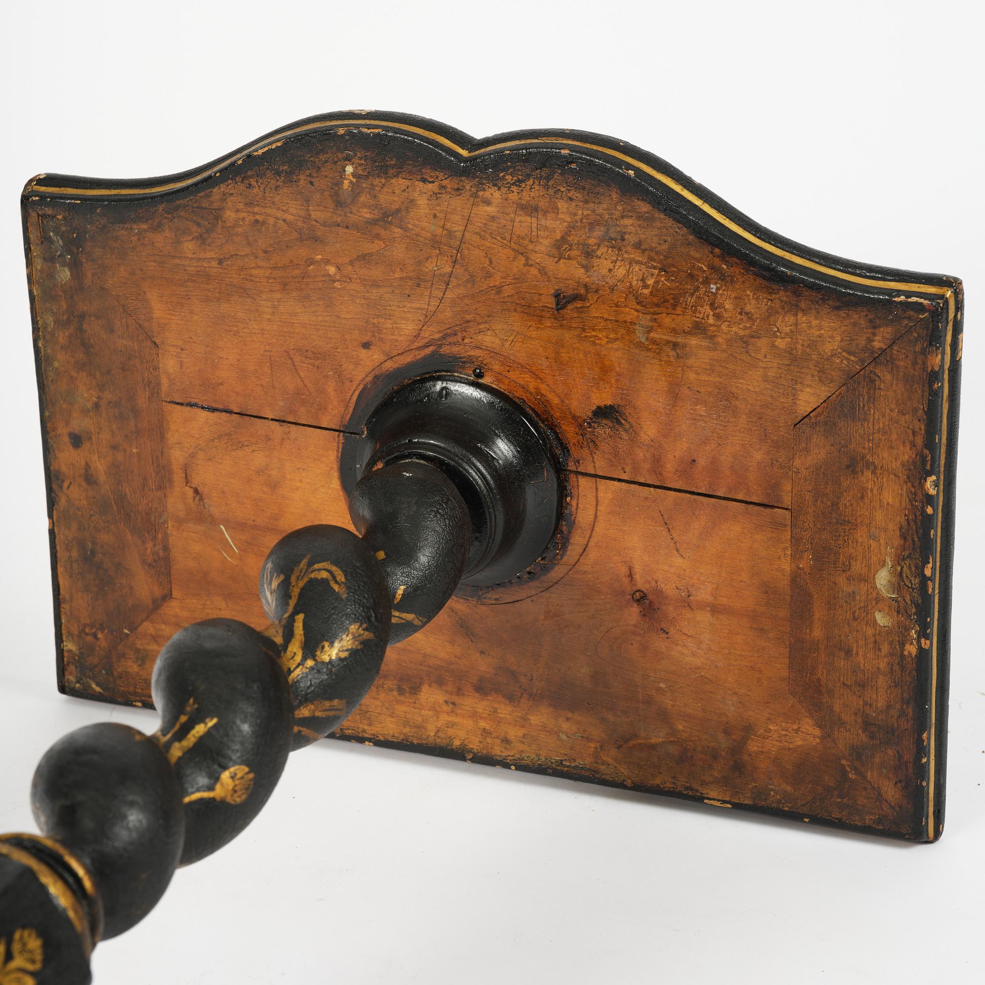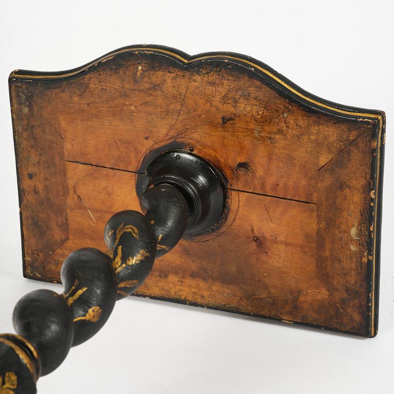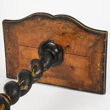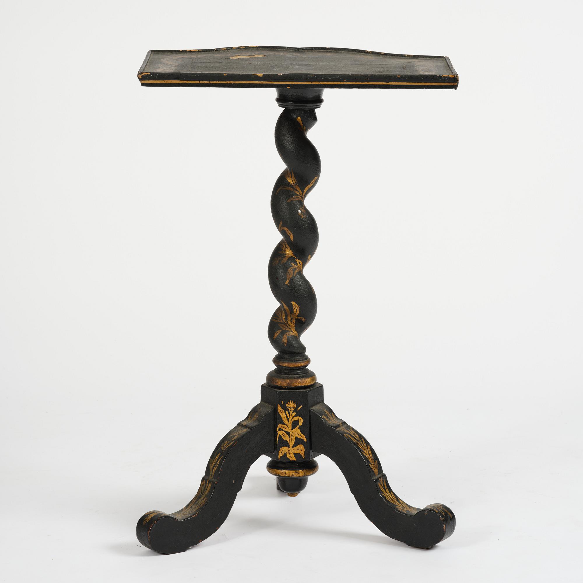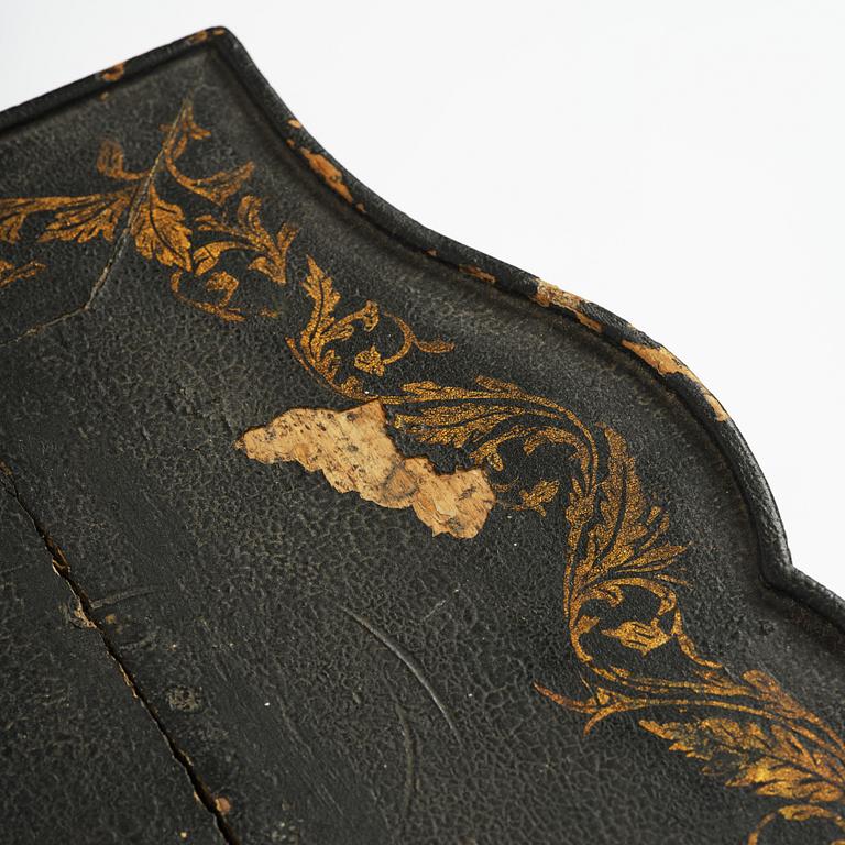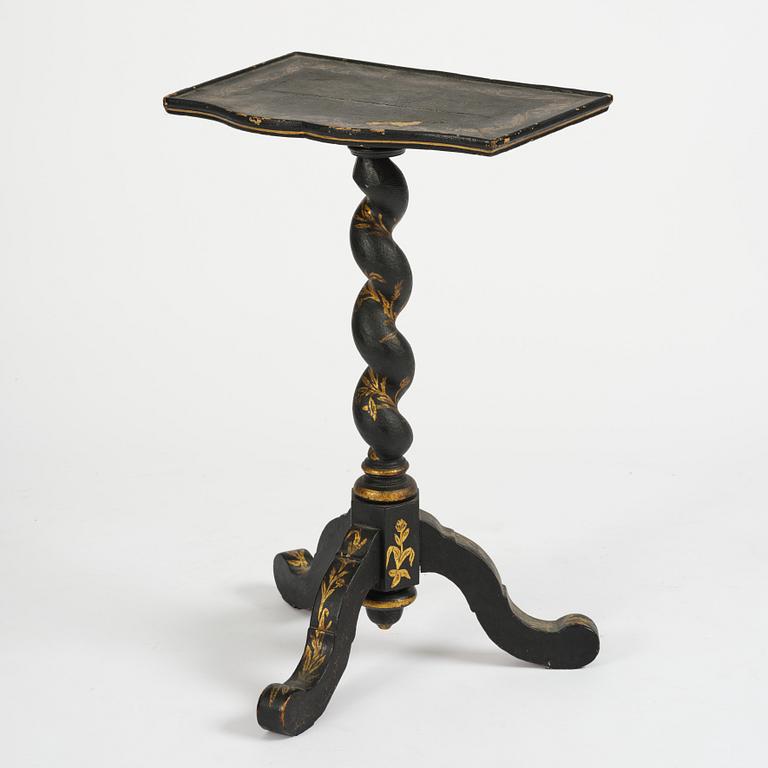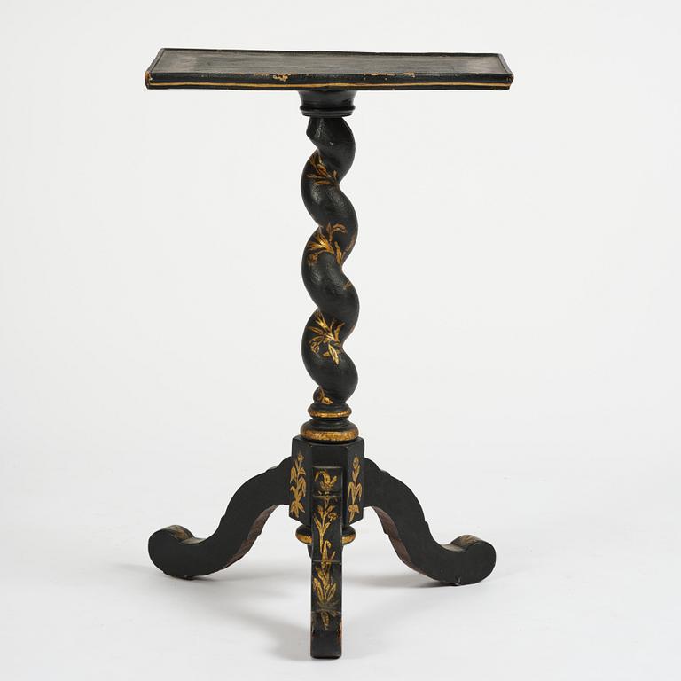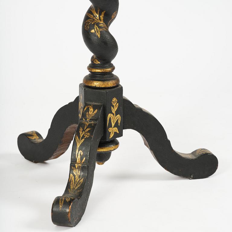 Lackerat i svart med dekor av mönsterslingor i guld. Profilerad bordsskiva på spiralsvarvat pelarben med trepassformad fot. Längd 46,5, bredd 33, höjd 73 cm.