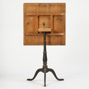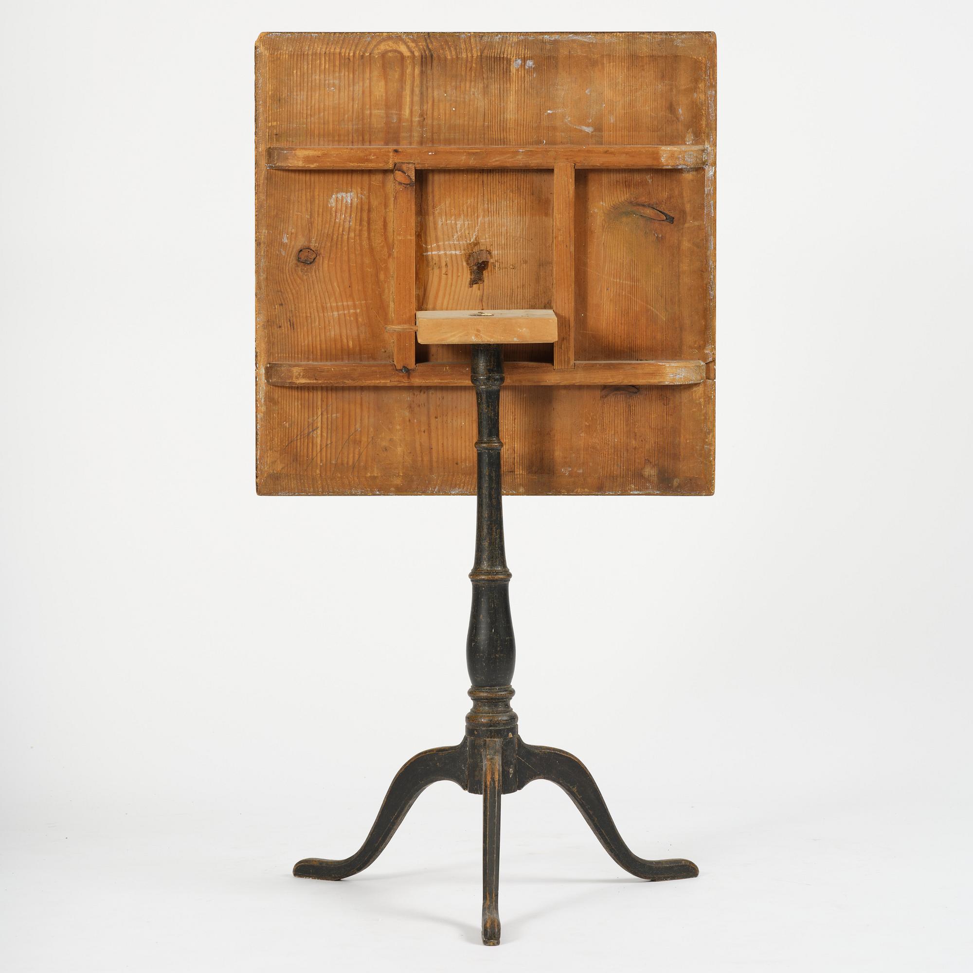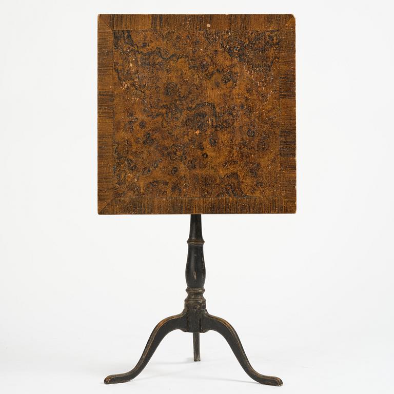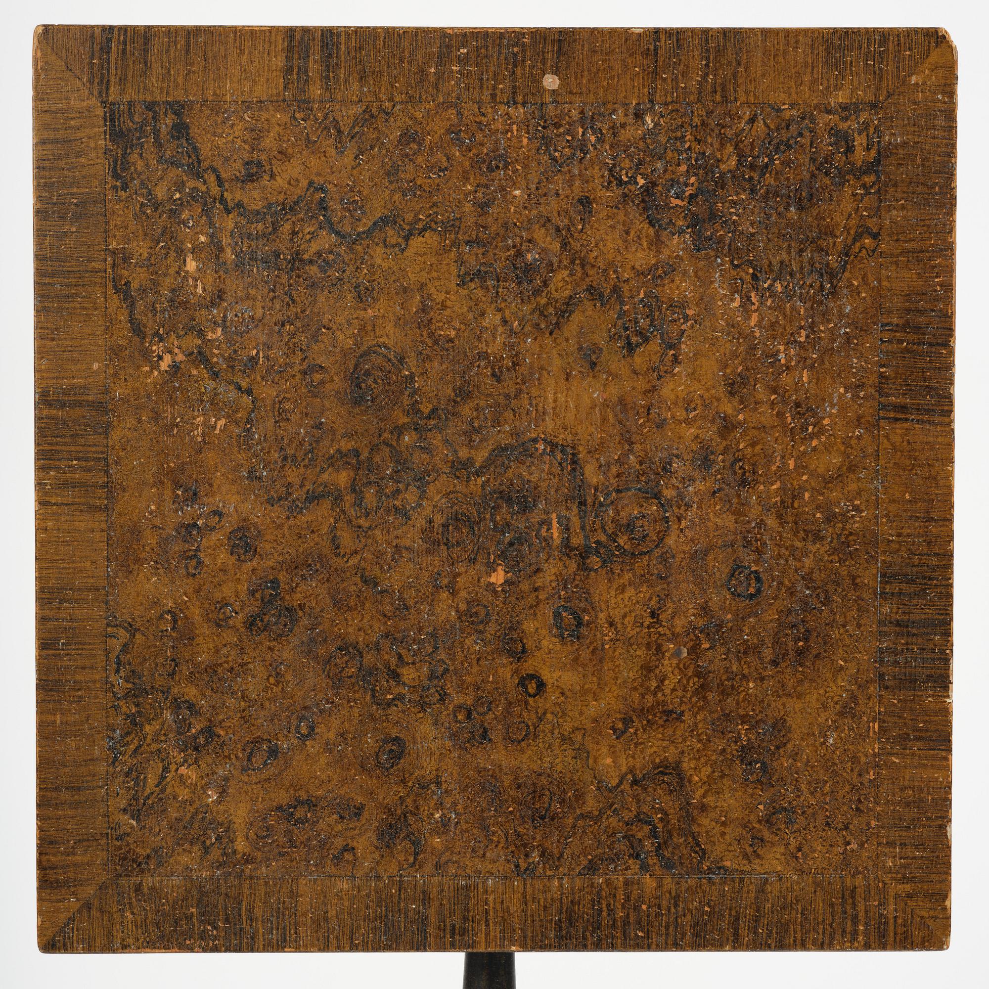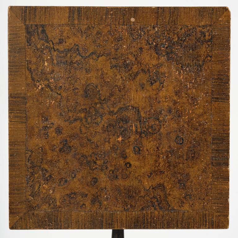 Kvadratiskt skiva målad i alrotsimitation. Svarvat pelarben med trepassformad fot. Längd 57, bredd 57, höjd 73,5 cm.