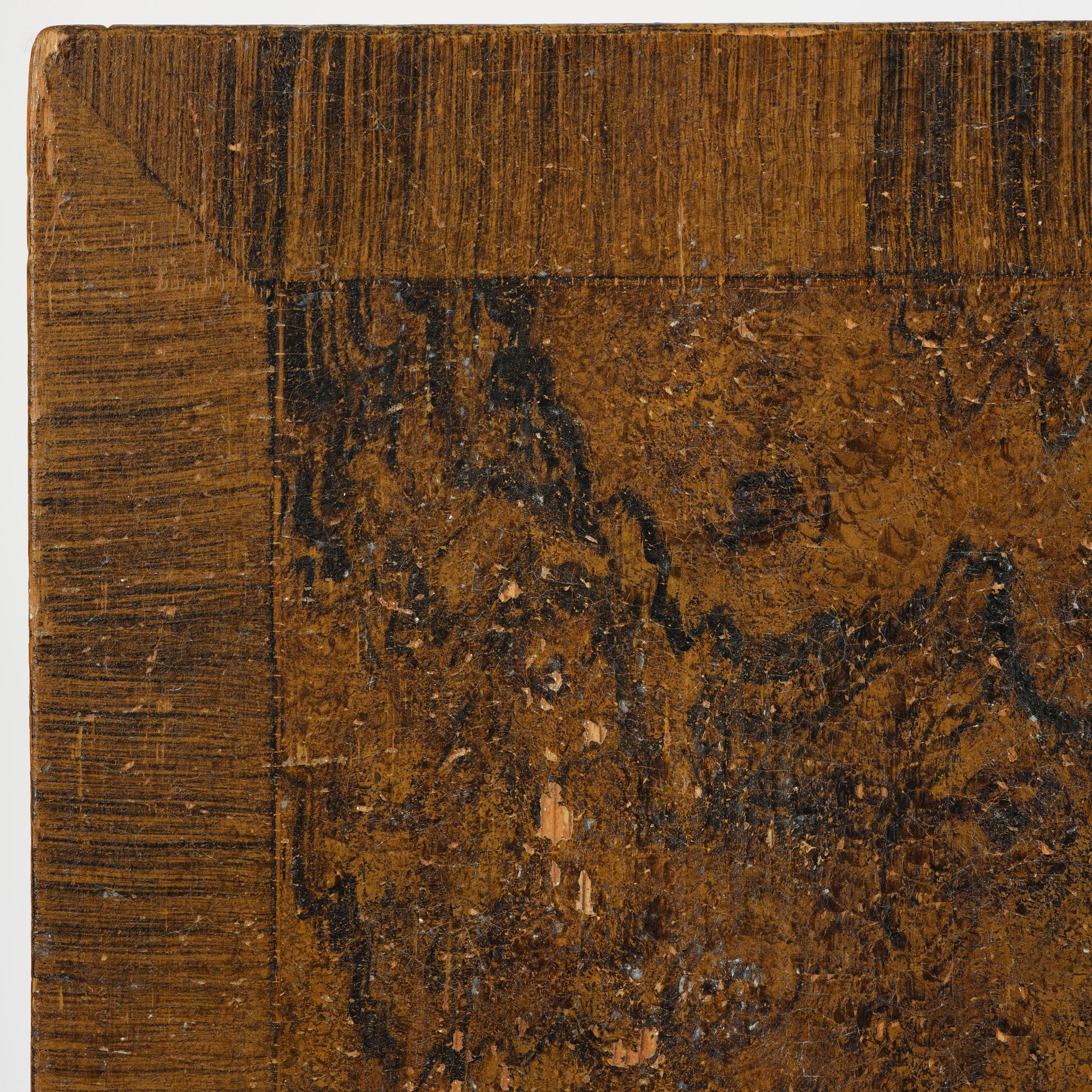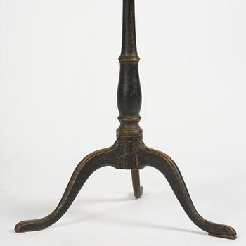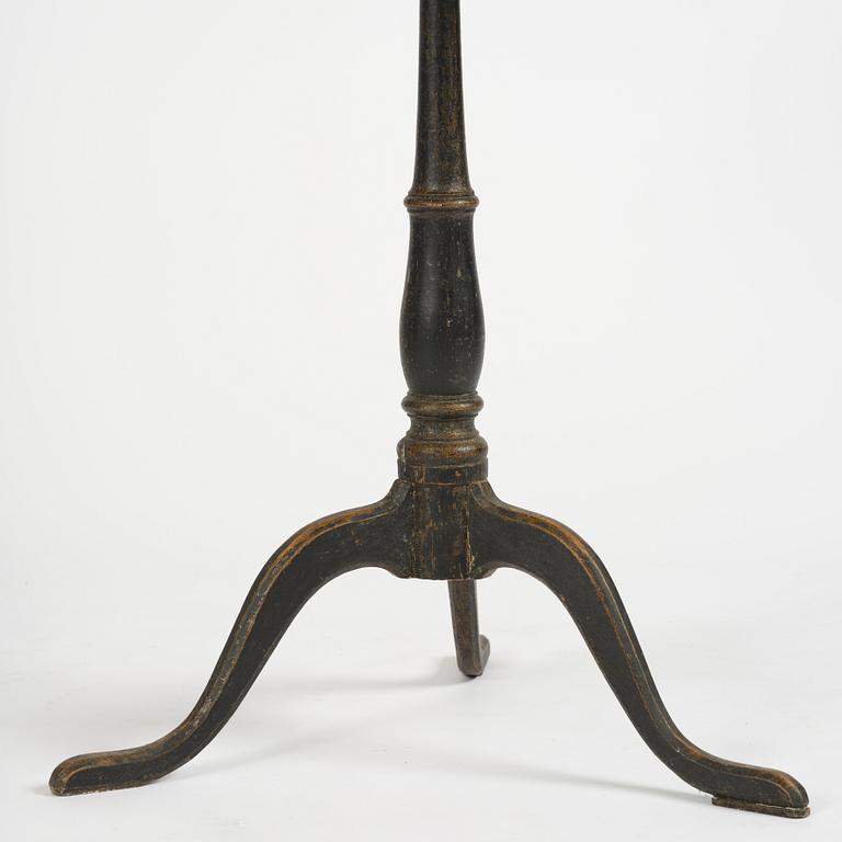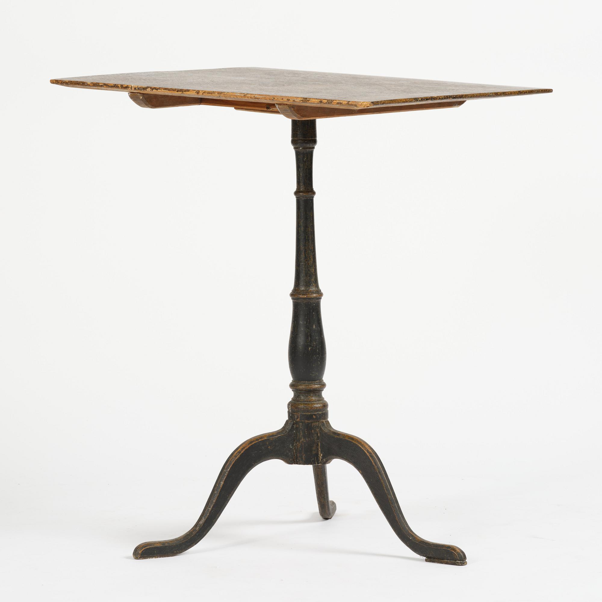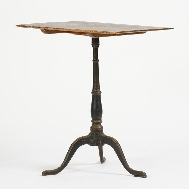 Kvadratiskt skiva målad i alrotsimitation. Svarvat pelarben med trepassformad fot. Längd 57, bredd 57, höjd 73,5 cm.