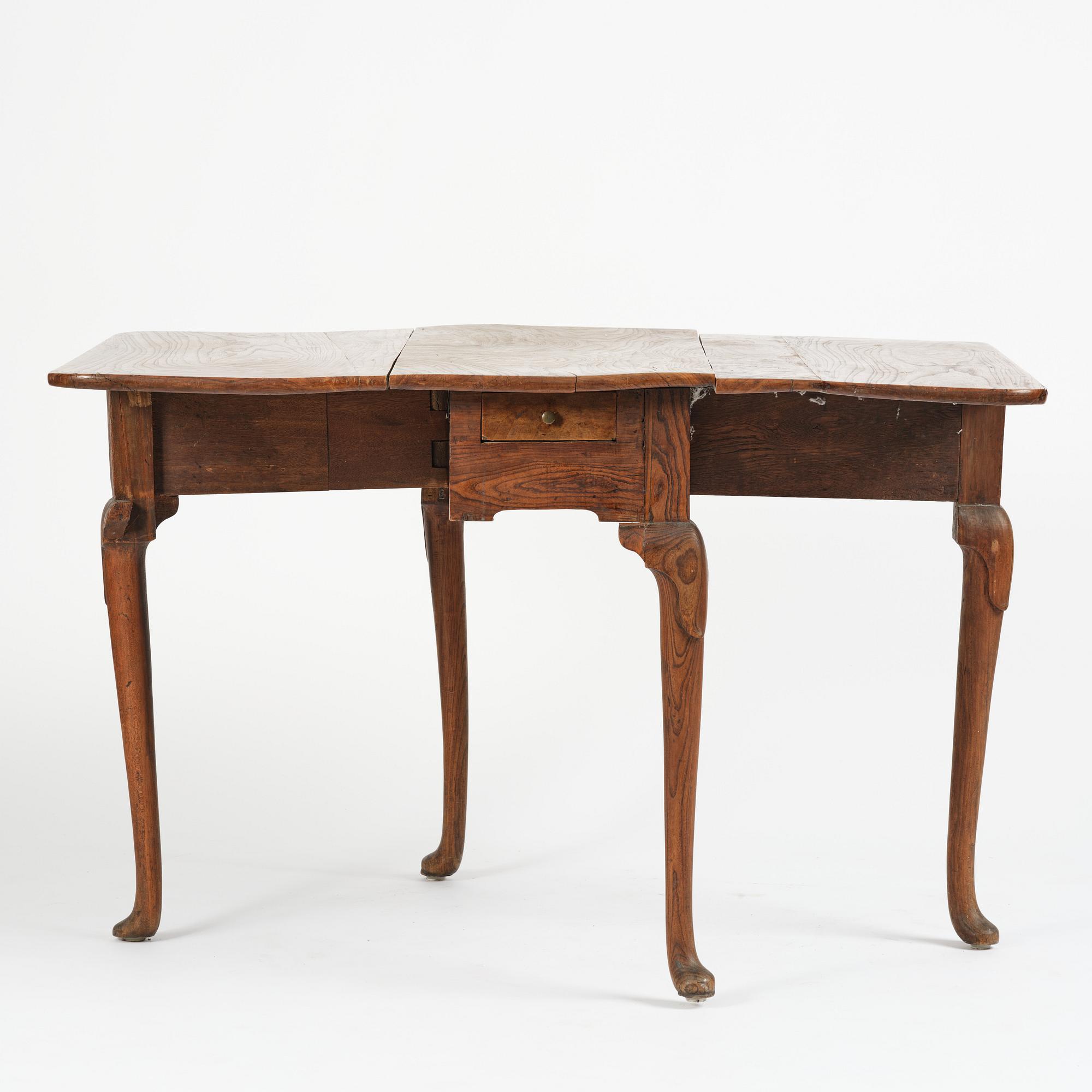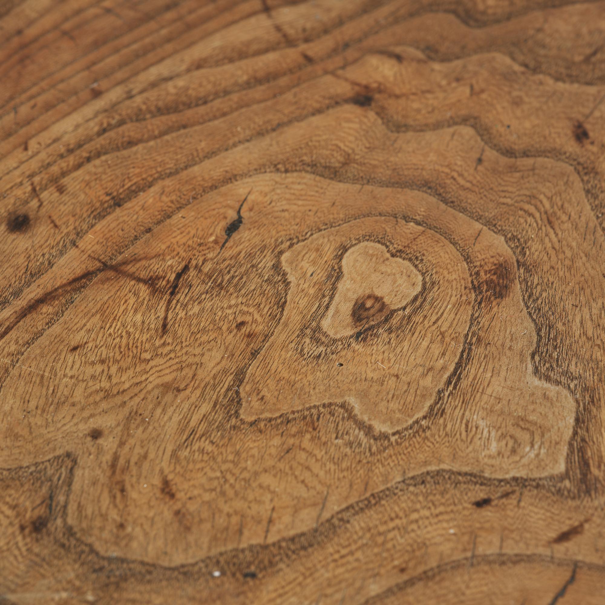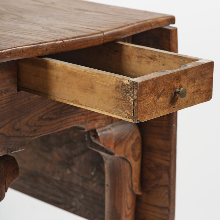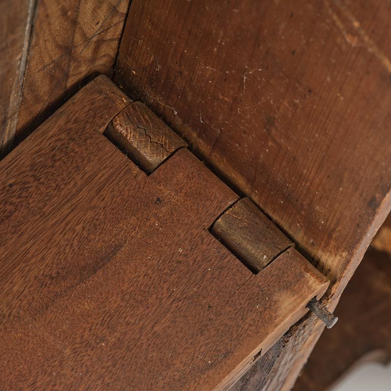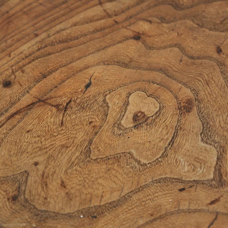 Stomme av massiv alm. Rektangulär form, konturerad sarg med en låda, lätt svängda ben med överkragade anfanger, dubbla slag och enkla grindar. Längd 37,5-116, bredd 91, höjd 74,5 cm.