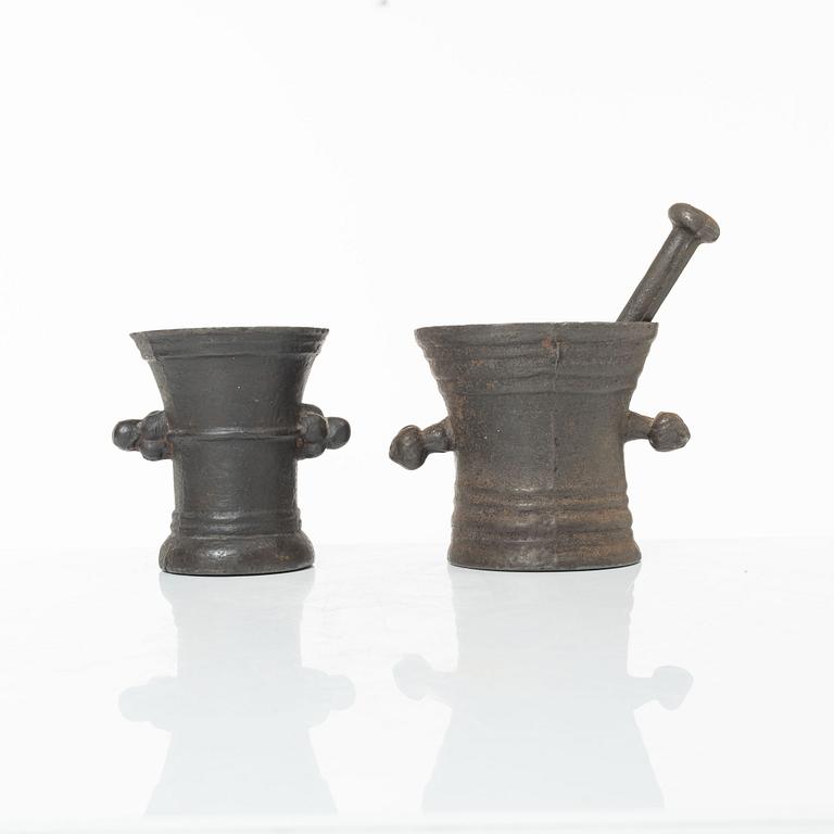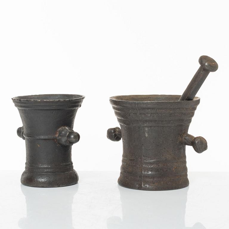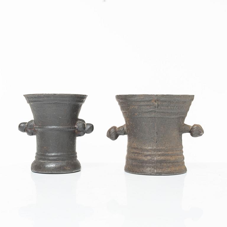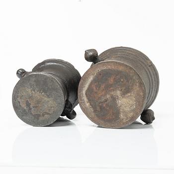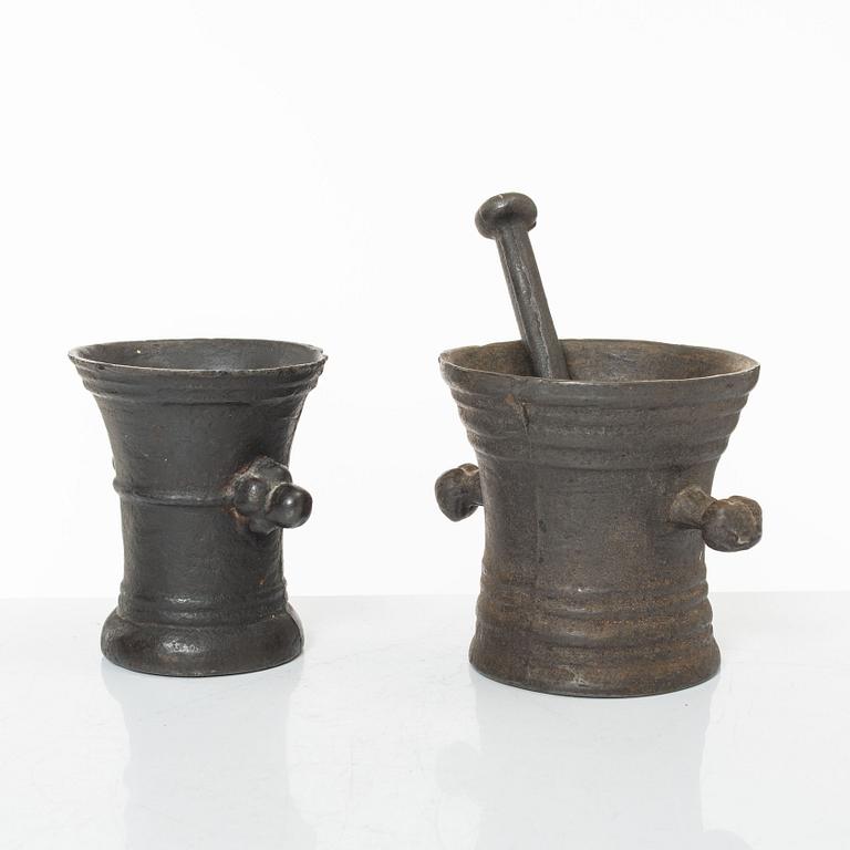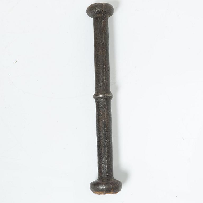 Gjutjärn. Konkava liv med bandad dekor, knoppformade grepar. Höjd 12-12,5, stötens längd 19,5 cm.