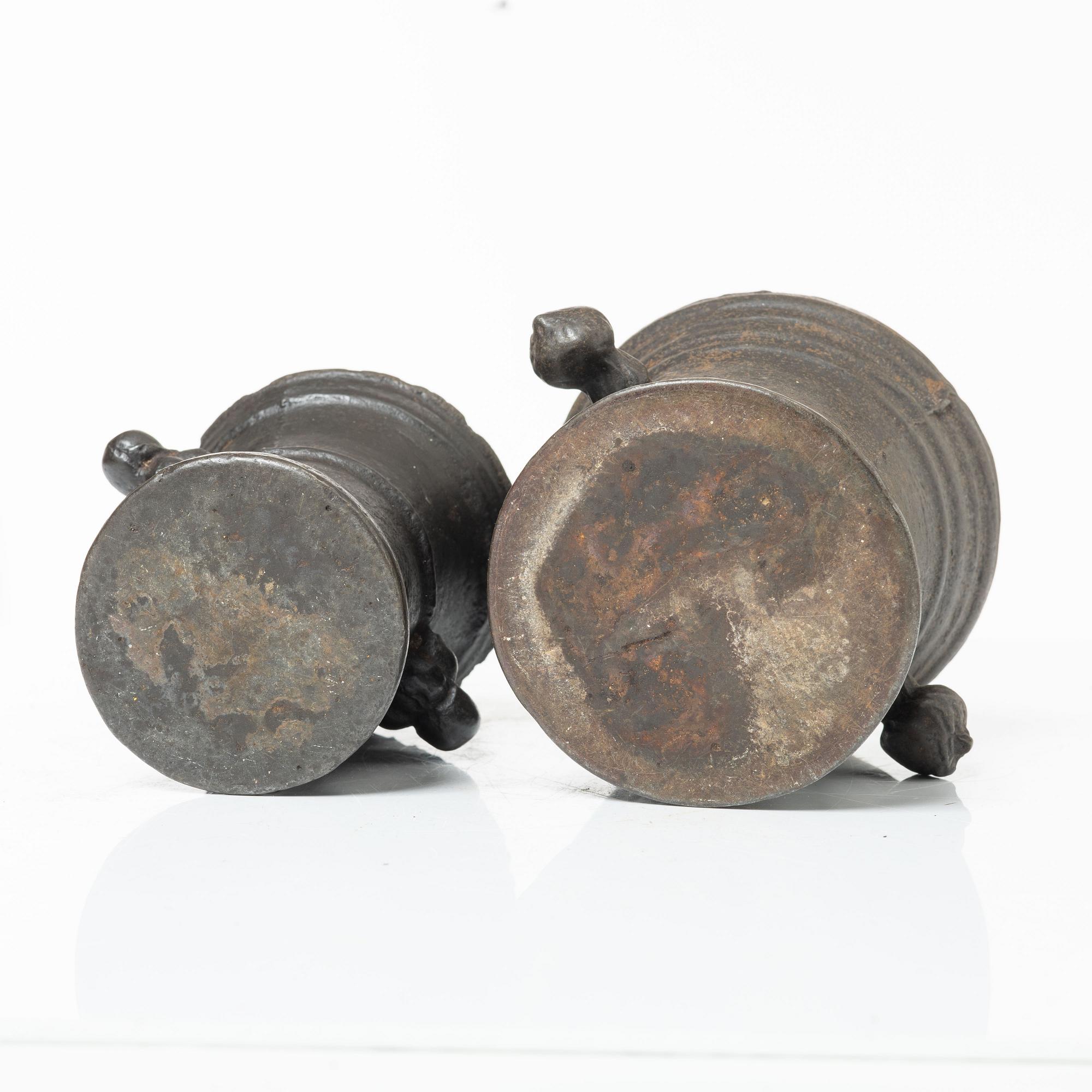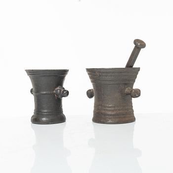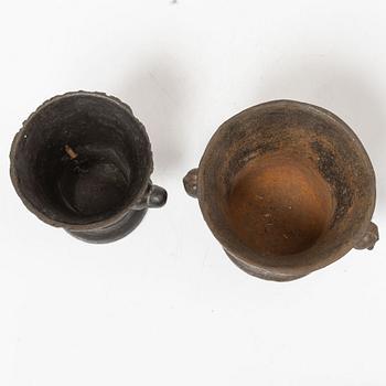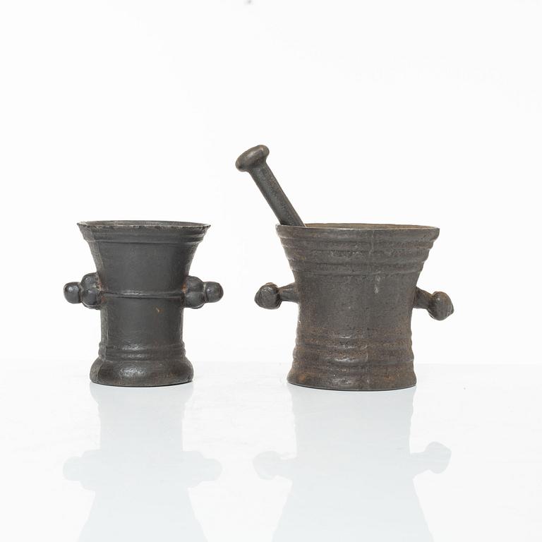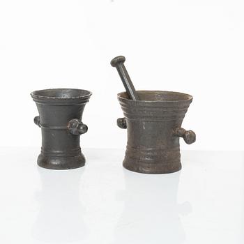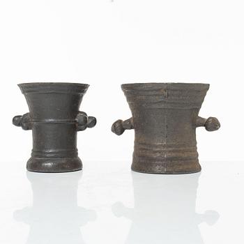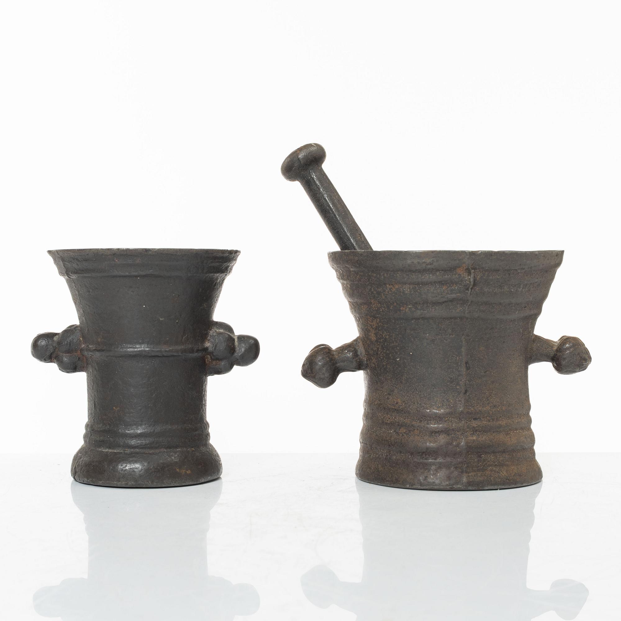 Gjutjärn. Konkava liv med bandad dekor, knoppformade grepar. Höjd 12-12,5, stötens längd 19,5 cm.
