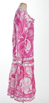Rosamönstrad bomull. Blus i singoallamodell. Etikettmärkt: "Emilio Pucci Florence Italy Made in Italy". Rygglängd 52, ärmlängd 48 cm. Vid kjol med rynk. Midjemått ca 60, längd 74,5 cm. Underkjol medföljer.