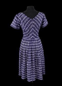 Mönstrad siden i blått och vitt. Kortärmad, v-ringad klänning med klockad kjol. Dragkedja i sidan. Fodrad upptill. Rygglängd mitt bak 98 cm, ärmlängd 7 cm, midjevidd 70 cm samt bystvidd 100 cm. Kort jacka med knytband i midjan samt knappar framtill. Kort ärm. Etikettmärkt "H.M. Drottningens Hovleverantör Märthaskolan boutique STOCKHOLM". Rygglängd mitt bak 50,5 cm, ärmlängd 18 cm, midjevidd 74 cm.
