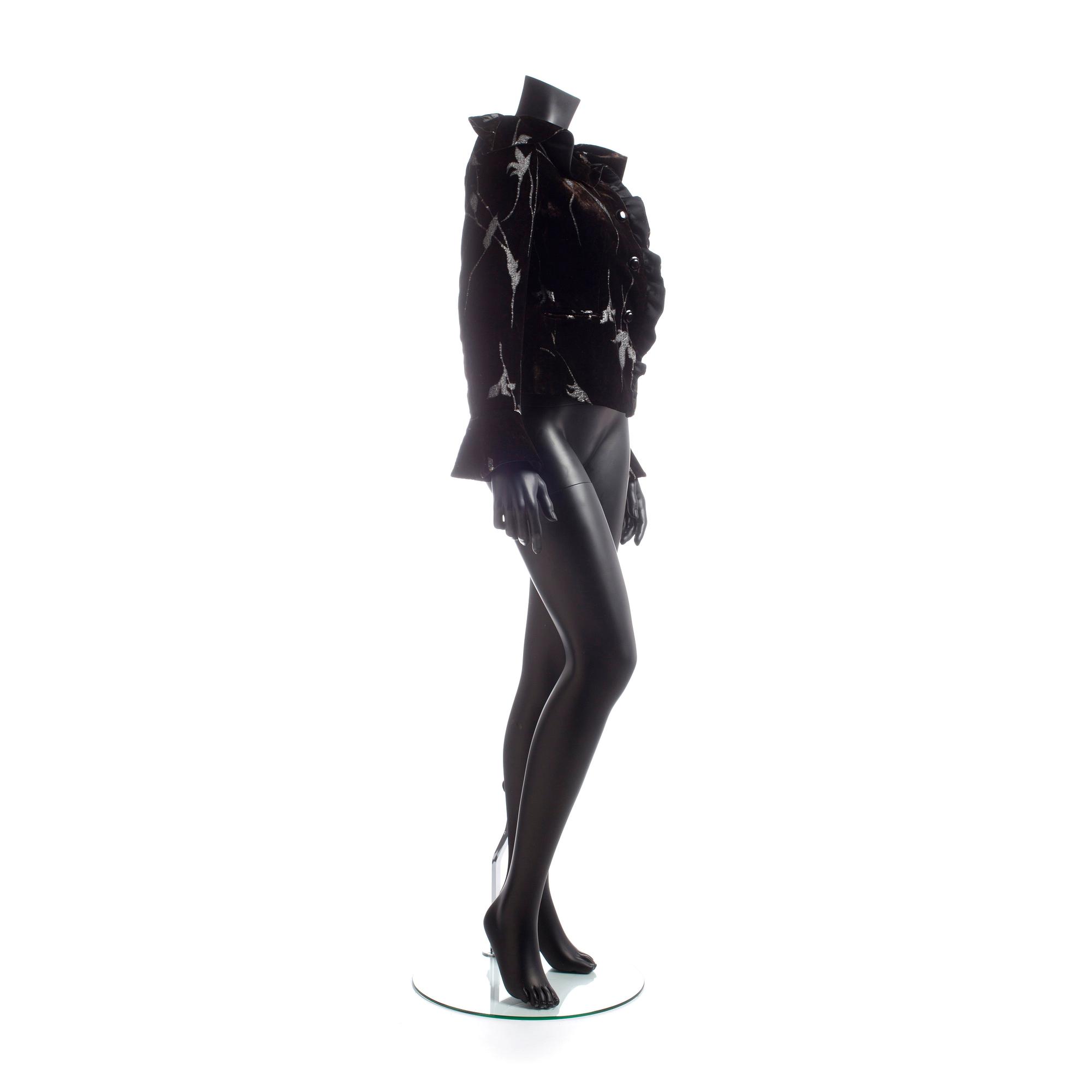 Brun sammet med dekor av ljusa partier föreställande blommor. Lätt plisserad krage. Klockad ärm. Helfodrad i svart tyg. Etikettmärkt "ARMANI COLLEZIONI MADE IN ITALY". Enligt etikett italiensk storlek 42. Rygglängd mitt bak 50 cm, bystvidd 90 cm, ärmlängd 45 cm.