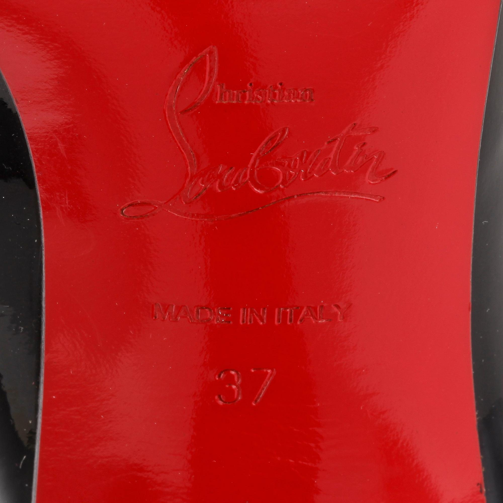 Svart lackerad skinn. Fodrade i beige skinn. Sula i rött, möärkt "Christian Louboutin". Enligt märkning storlek 37. Klackhöjd 10,5 cm, längd 24 cm, skafthöjd 39 cm.