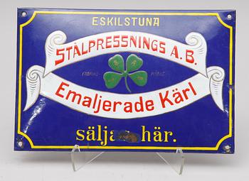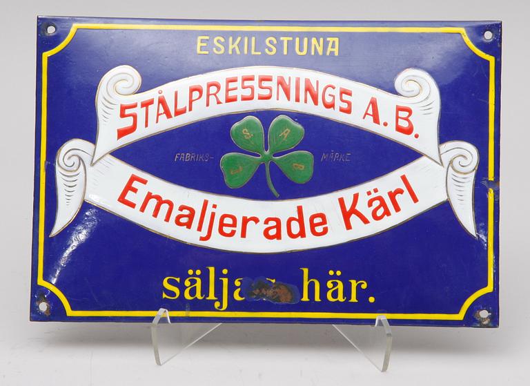 I förgrunden bl.a. texten, Eskilstuna, stålpressning AB, Emaljerade kärl.